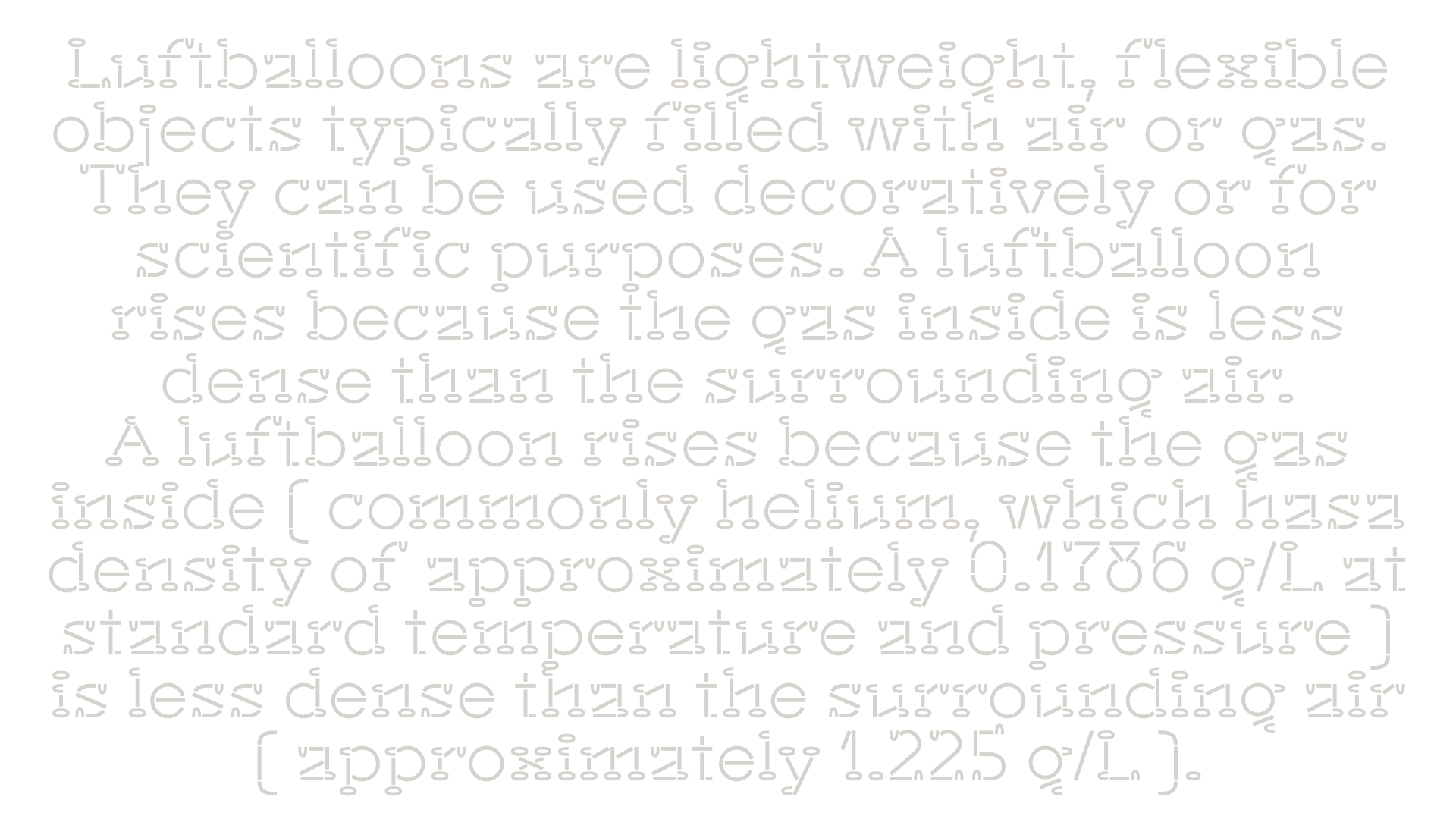 Время от времени дизайнер Владимир Коломейцев присылает в телеграм-чат Playfaces надпись и предлагает участникам сделать леттеринг на её основе. С одной из таких надписей и начался шрифт Lufta. Унаследовав от прототипа только необычную форму засечек, он превратился в дружелюбную и почти трафаретную брусковую антикву, которая будет одинаково хорошо работать и на светоотражающих патчах для одежды, и в айдентике deep-tech стартапа, и в DIY-проектах (например, навигации по гаражной распродаже). В Lufta — три начертания: технологичное Normal, тёплое Rounded и напоминающее типографику музыкальных обложек 70-х — Doubled. Шрифт поддерживает расширенные латиницу и кириллицу (в том числе болгарскую), а ещё в нём два набора цифр.
