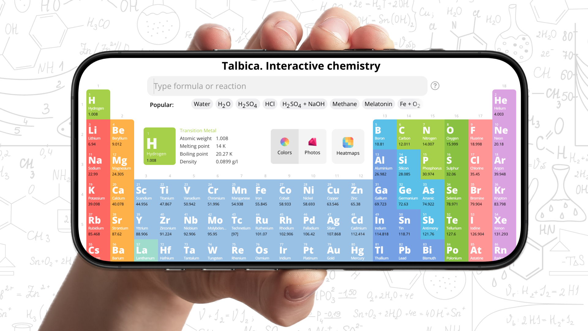 Помимо стандартной раскраски по типам элемента, Талбица умеет строить тепловые карты. С помощью них школьник может увидеть воочию, как распределяется, например, температура кипения или плотность по периодам и группам.