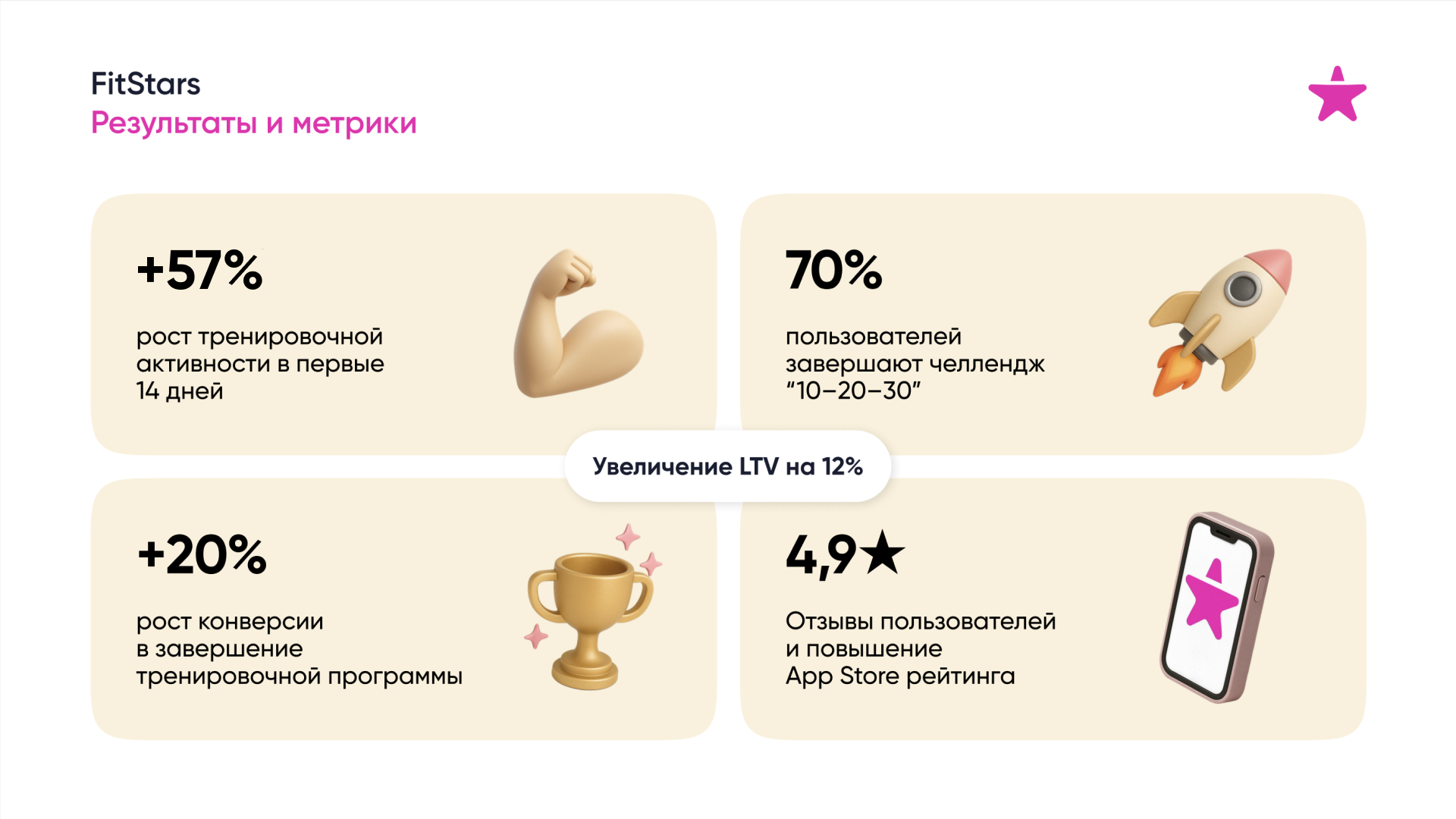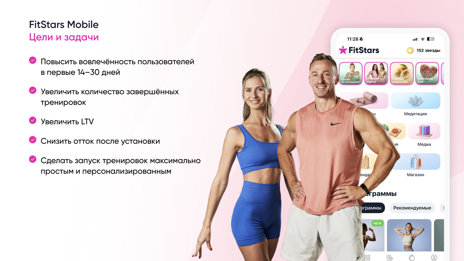 Цель — повысить вовлечённость в первые 14–30 дней, увеличить LTV и количество завершённых тренировок.