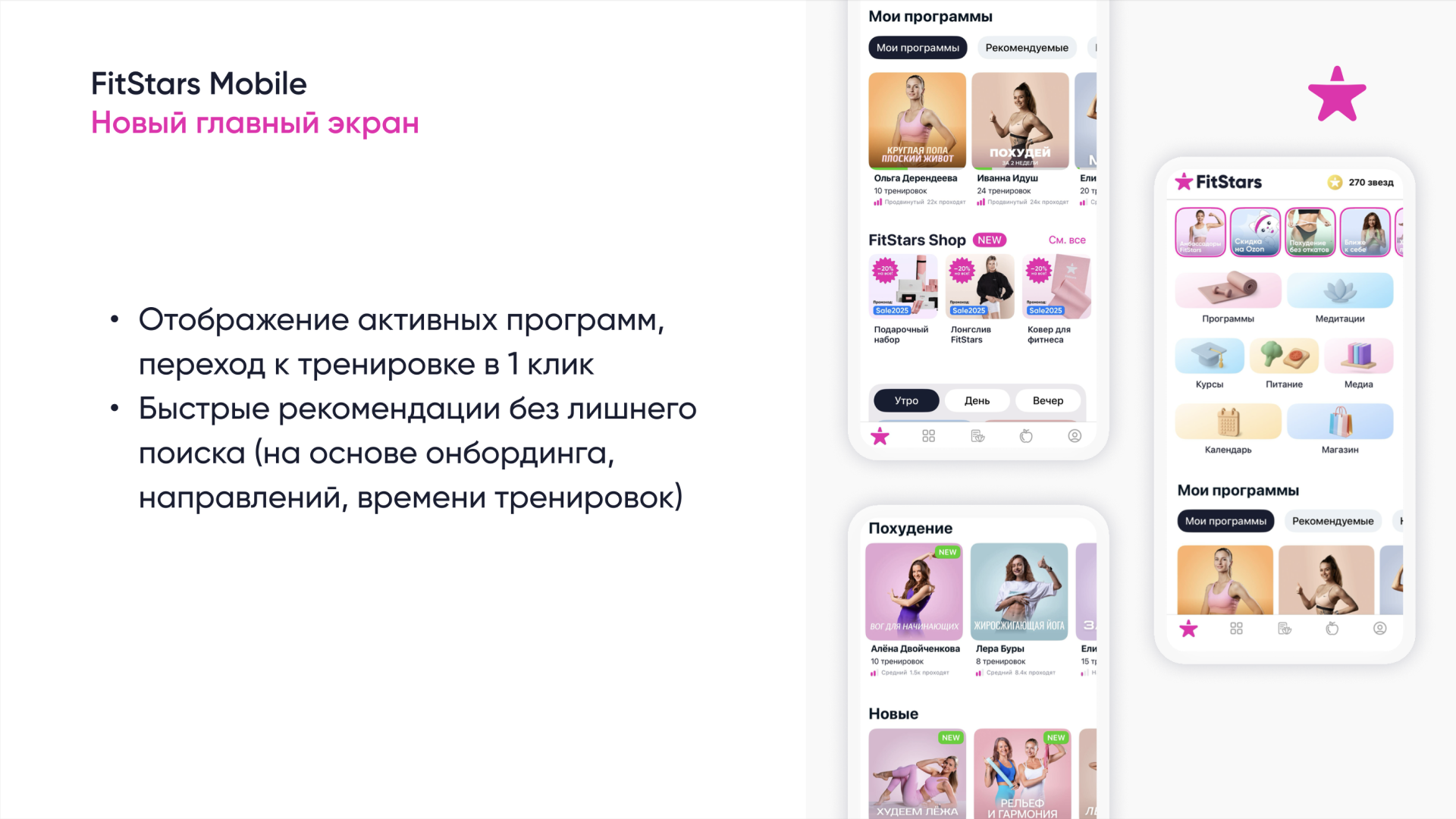 — переосмыслили главный экран: теперь на первом экране отображаются персональные рекомендации и активная программа