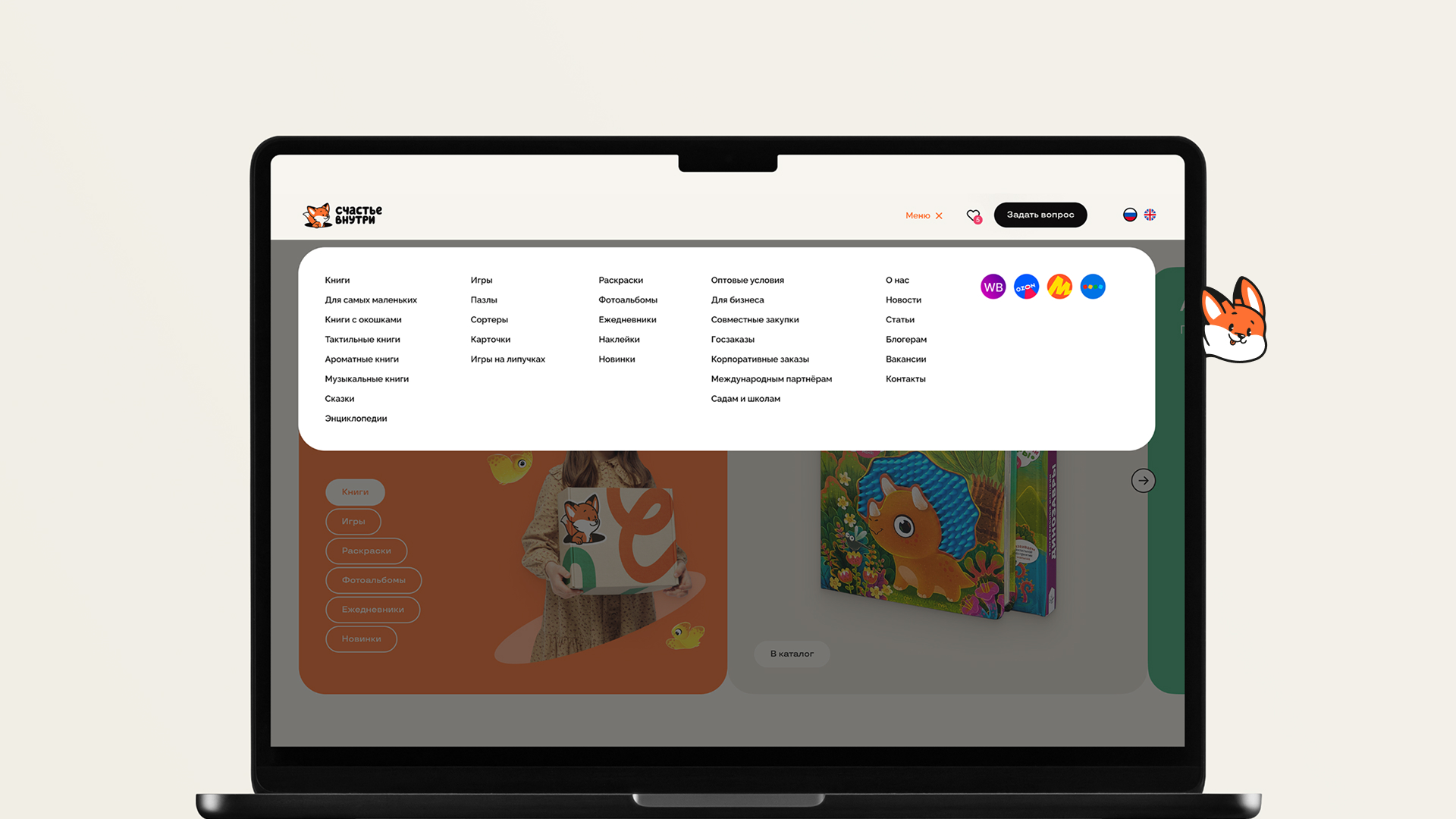 Цель создания нового сайта — увеличить количество заявок на сотрудничество от разных сегментов B2B-аудитории: корпоративных клиентов, госзаказчиков, бизнеса, детских садов, оптовиков, закупщиков, международных партнеров. Для решения этой задачи мы определили боли аудиторий, выстроили пути клиентов, разработали для каждого сегмента тематическую страницу, на которой представлены индивидуальные условия сотрудничества и бенефиты. Также мы понимали, что прямые потребители тоже будут попадать на сайт, поэтому продумали пользовательские сценарии. А для выхода на международный рынок мы создали англоязычную версию сайта в формате лаконичного лендинга.