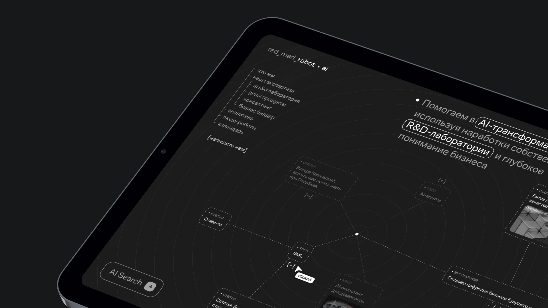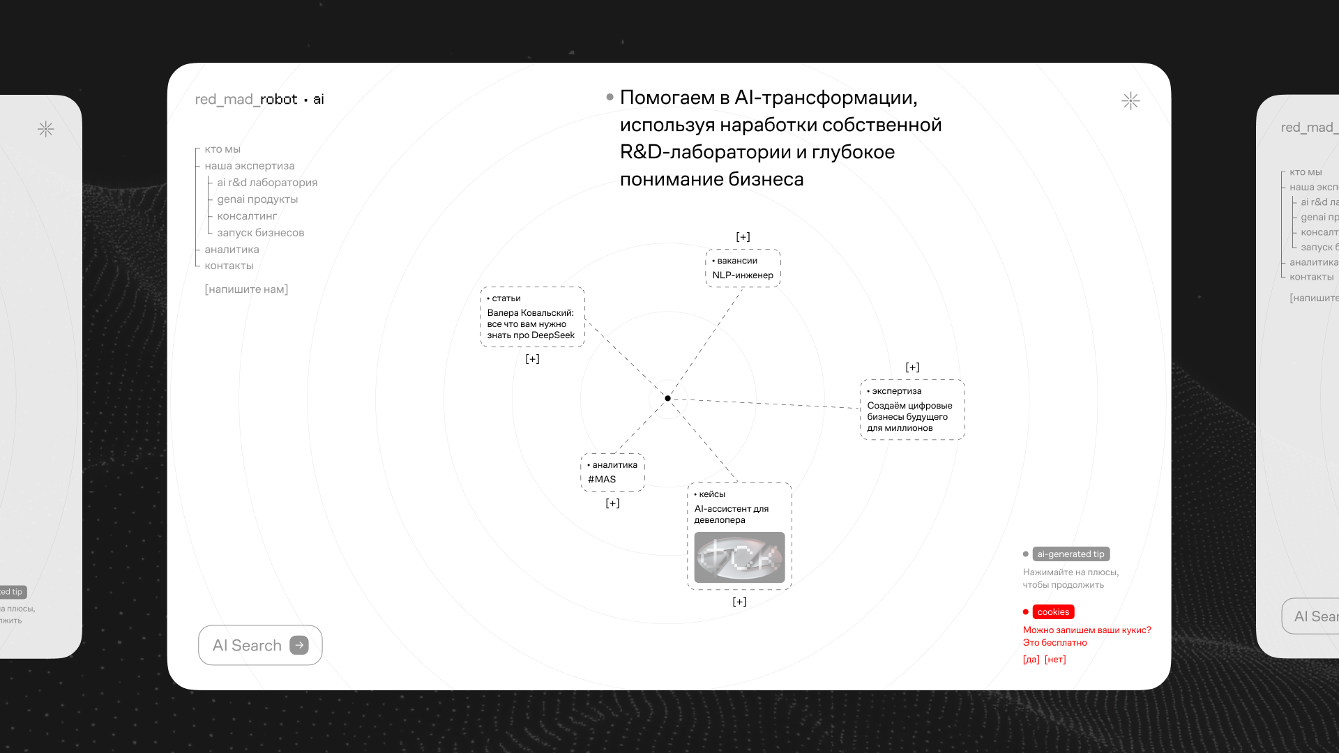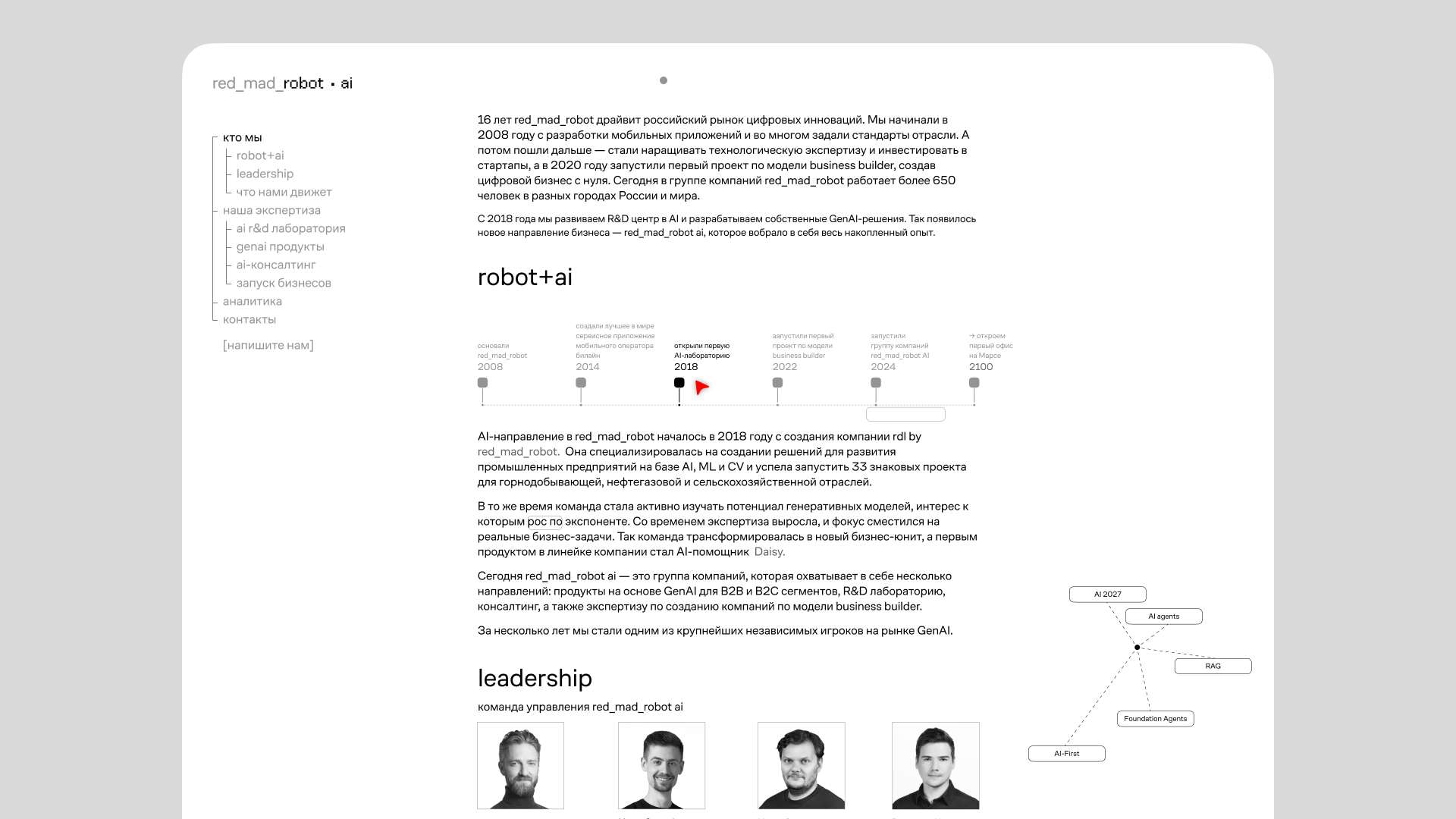 red_mad_robot AI — группа компаний, объединяющая технологические и бизнес-компетенции в GenAI. Сайт работает как витрина экспертизы и инструмент: он отражает наши подходы к AI-трансформации, основанные на собственной R&D-практике и глубоком понимании задач бизнеса.