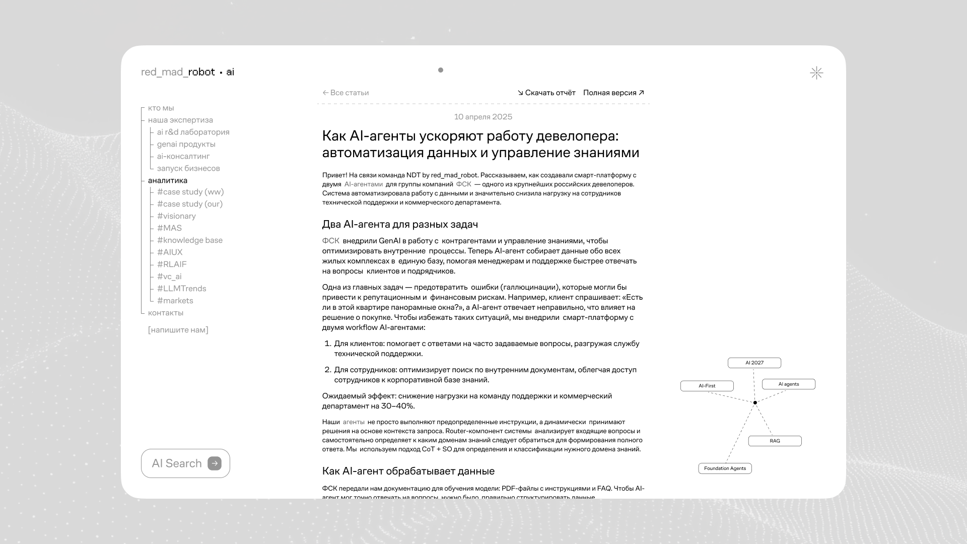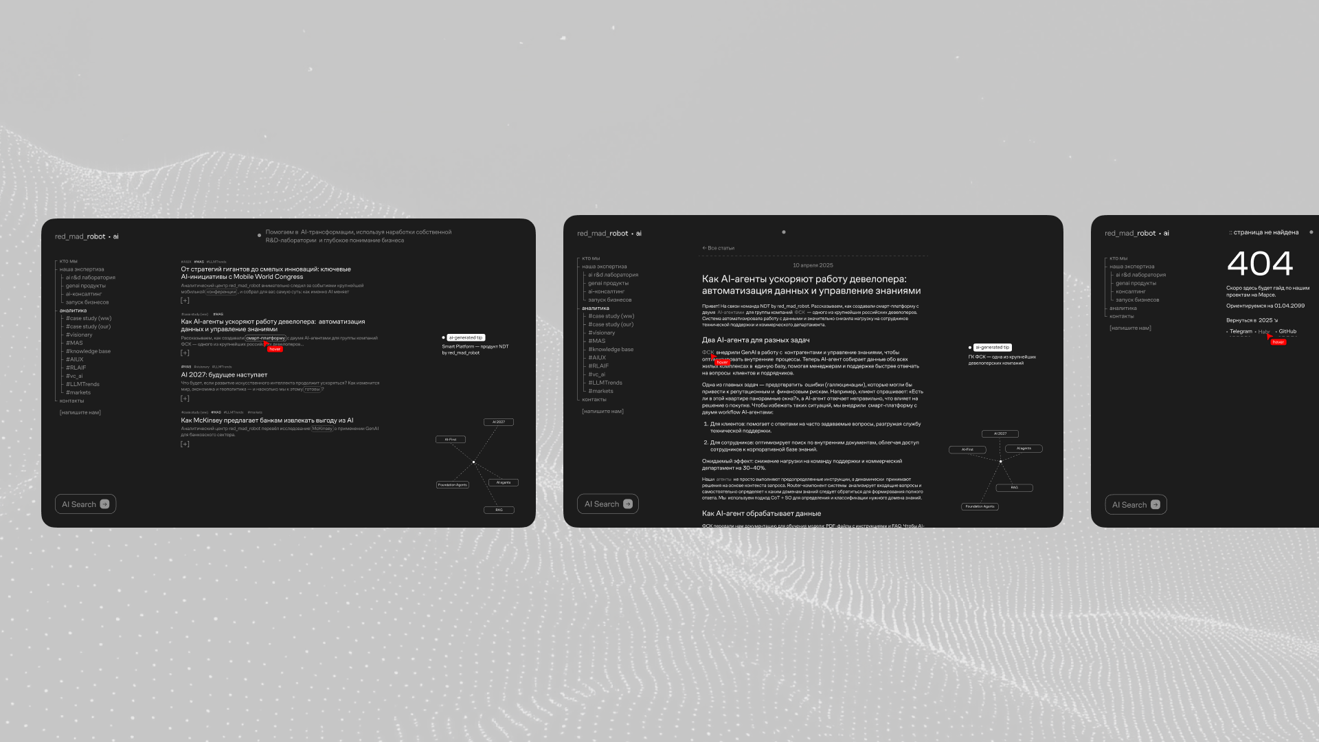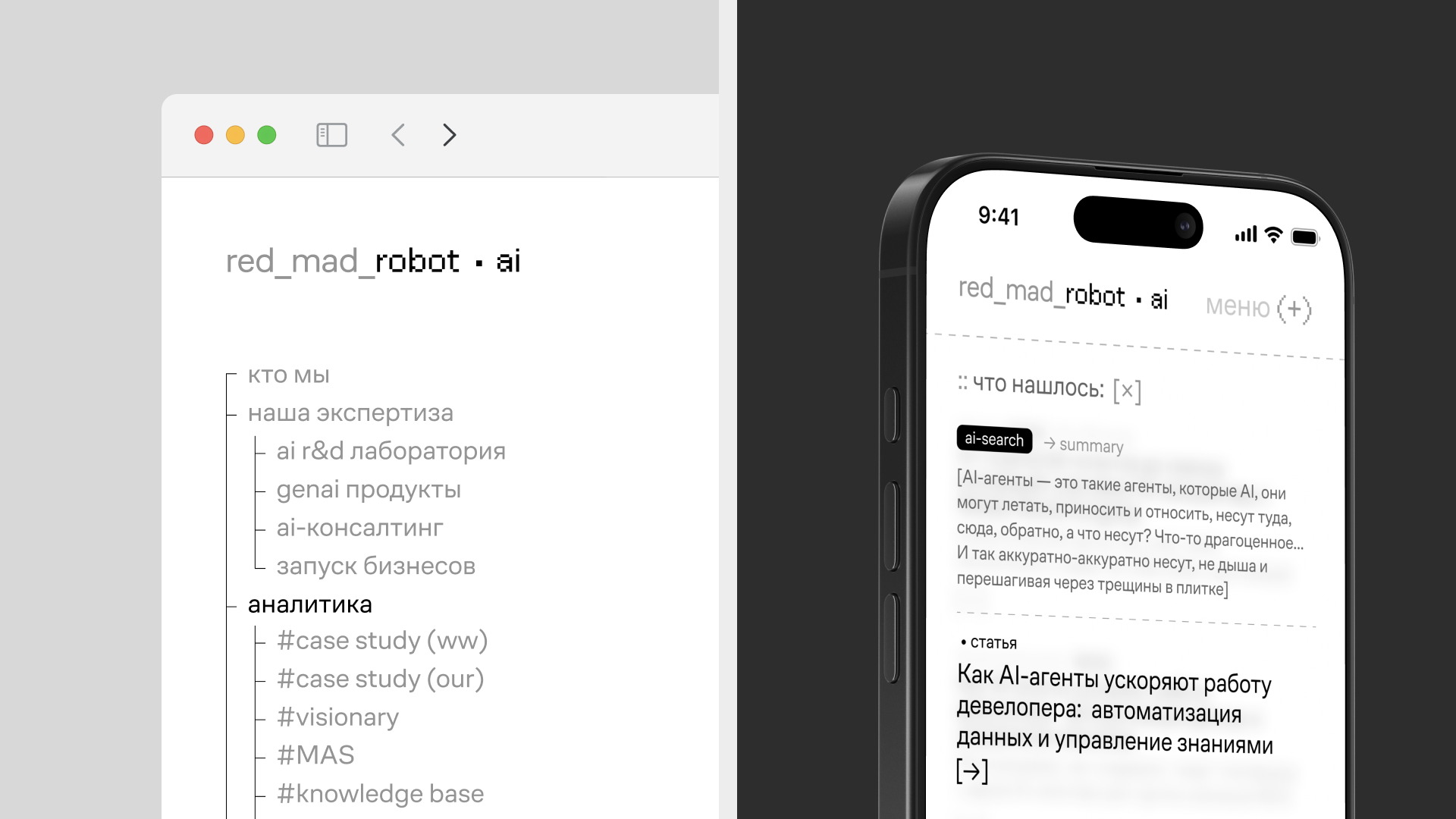 red_mad_robot AI — группа компаний, объединяющая технологические и бизнес-компетенции в GenAI. Сайт работает как витрина экспертизы и инструмент: он отражает наши подходы к AI-трансформации, основанные на собственной R&D-практике и глубоком понимании задач бизнеса.