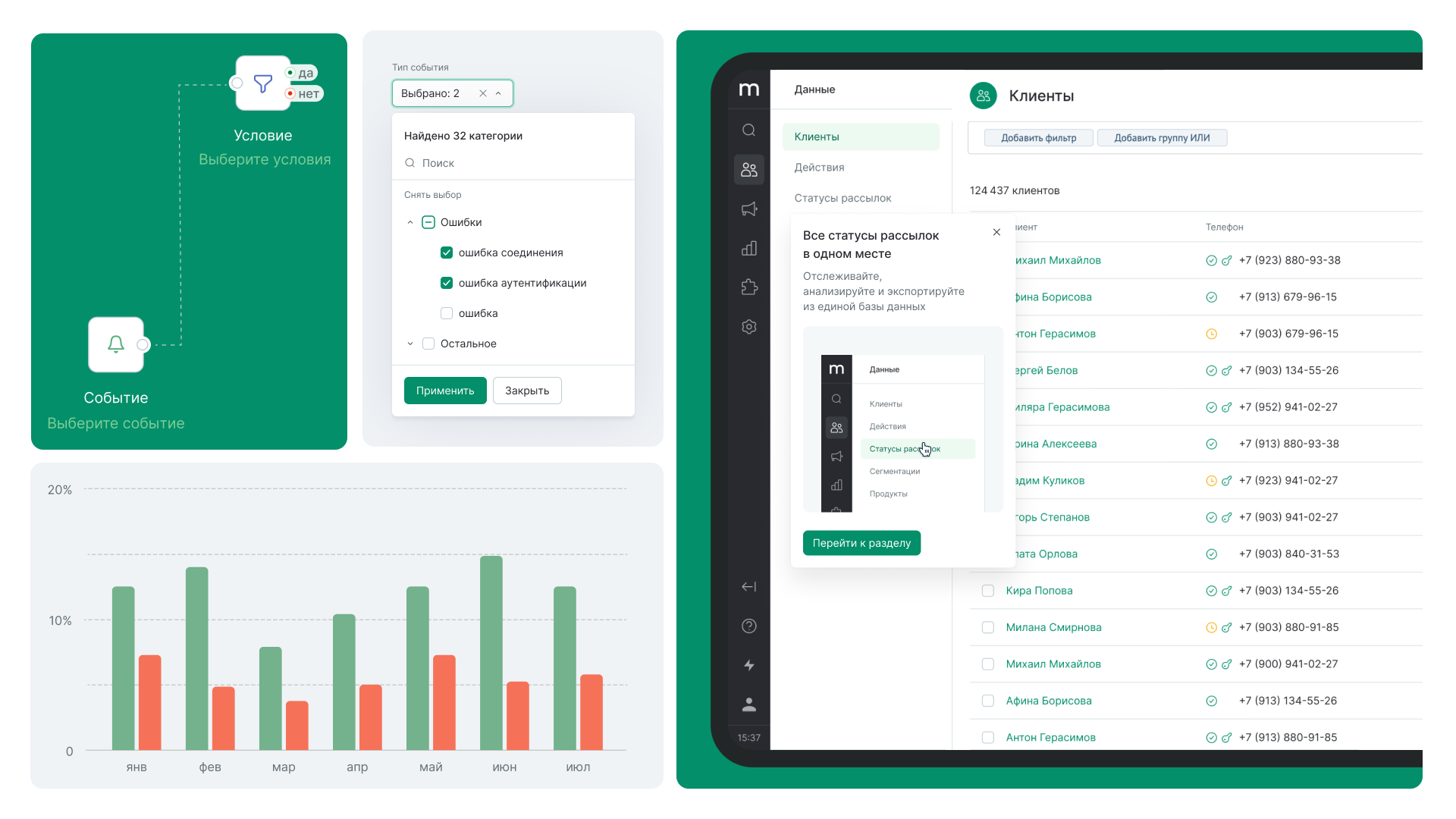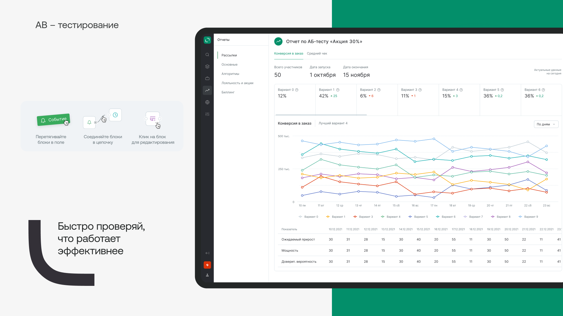 В результате мы разработали новую дизайн-систему в Figma, внедрили стандартизированные элементы, включая таблицы и формы, и добавили визуальные инструменты для настройки маркетинговых сценариев. Фронтенд был адаптирован с помощью CSS Grid, что обеспечило консистентность интерфейсов на всех устройствах.