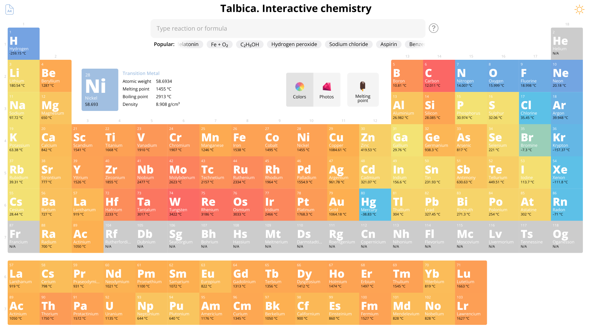 Помимо стандартной раскраски по типам элемента, Талбица умеет строить тепловые карты. С помощью них школьник может увидеть воочию, как распределяется, например, температура кипения или плотность по периодам и группам.