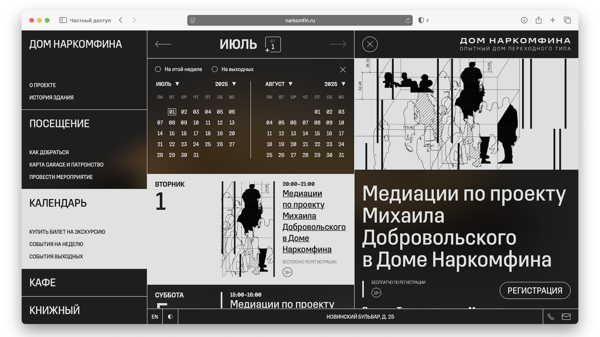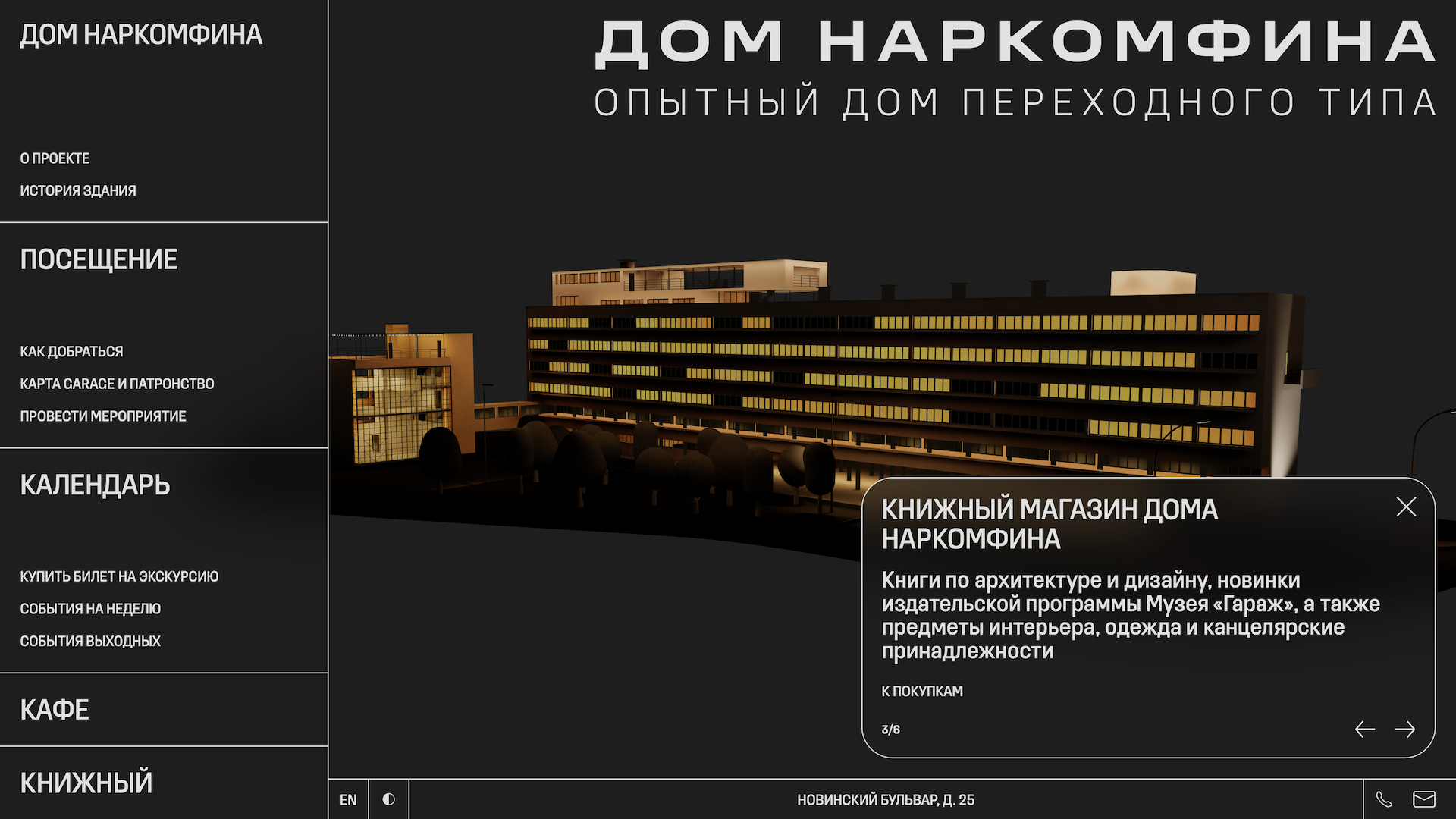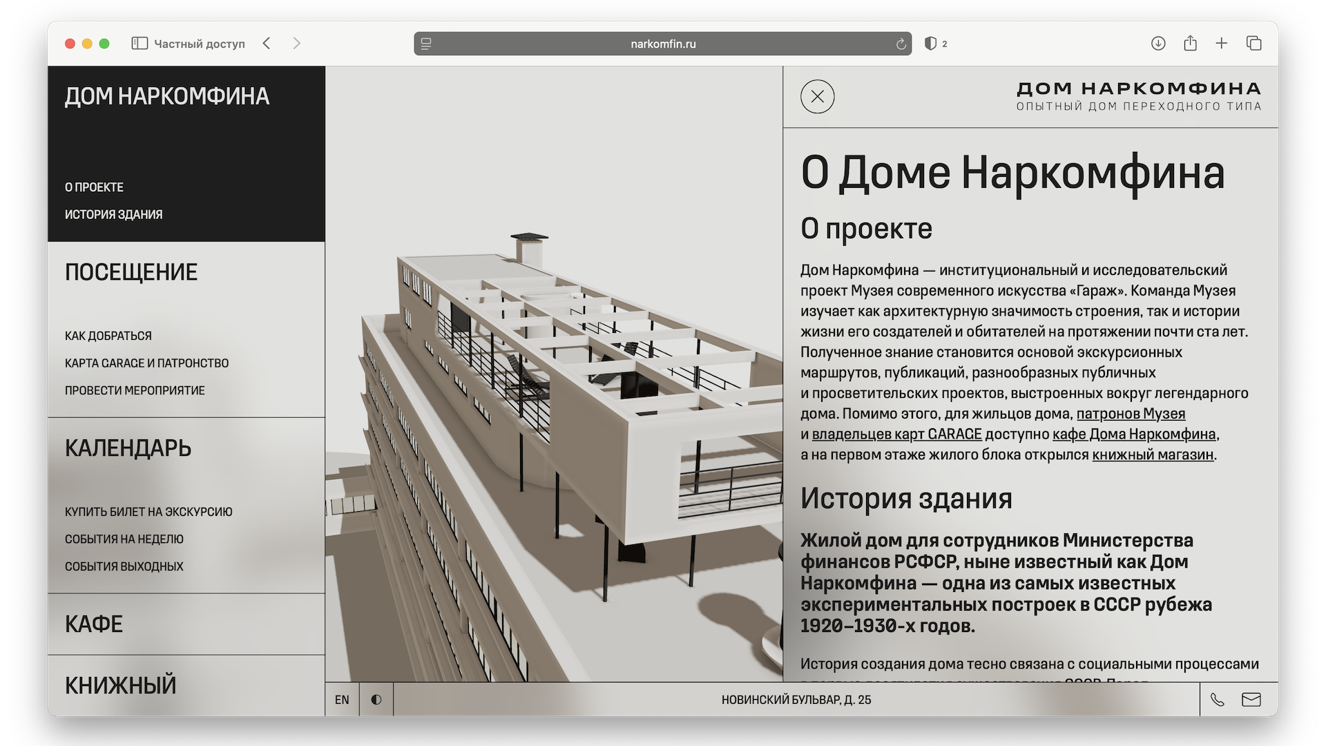 Дом Наркомфина — институциональный и исследовательский проект Музея современного искусства «Гараж». Команда Музея изучает как архитектурную значимость строения, так и истории жизни его создателей и обитателей на протяжении почти ста лет. Полученное знание становится основой экскурсионных маршрутов, публикаций, разнообразных публичных и просветительских проектов, выстроенных вокруг легендарного дома.