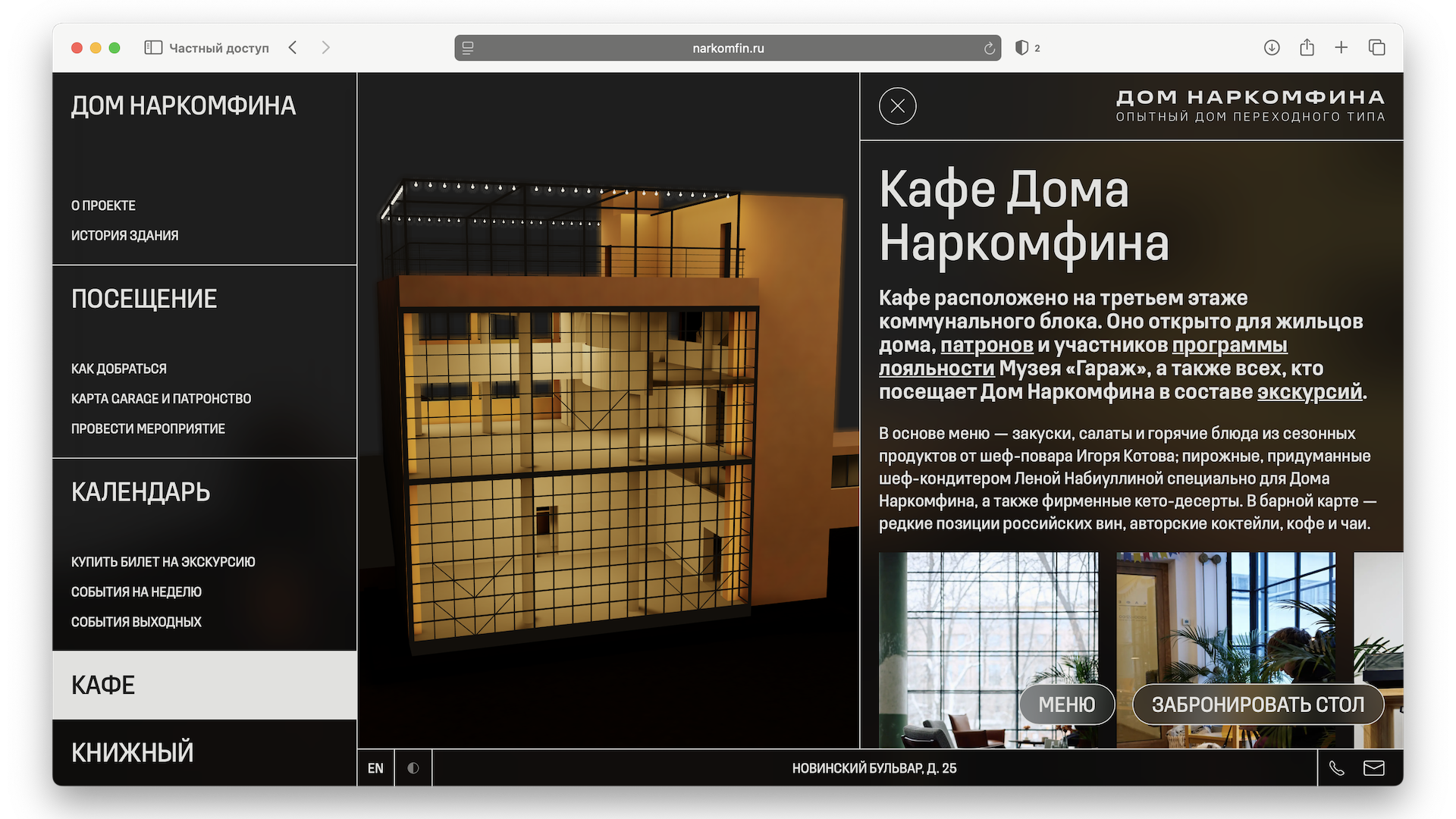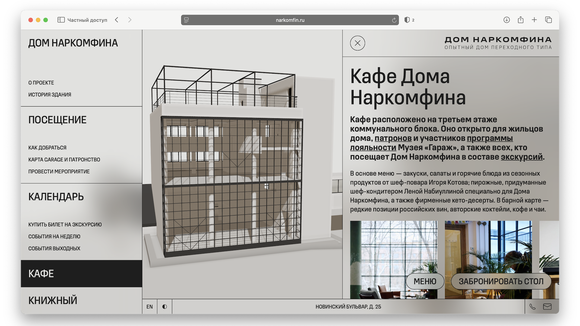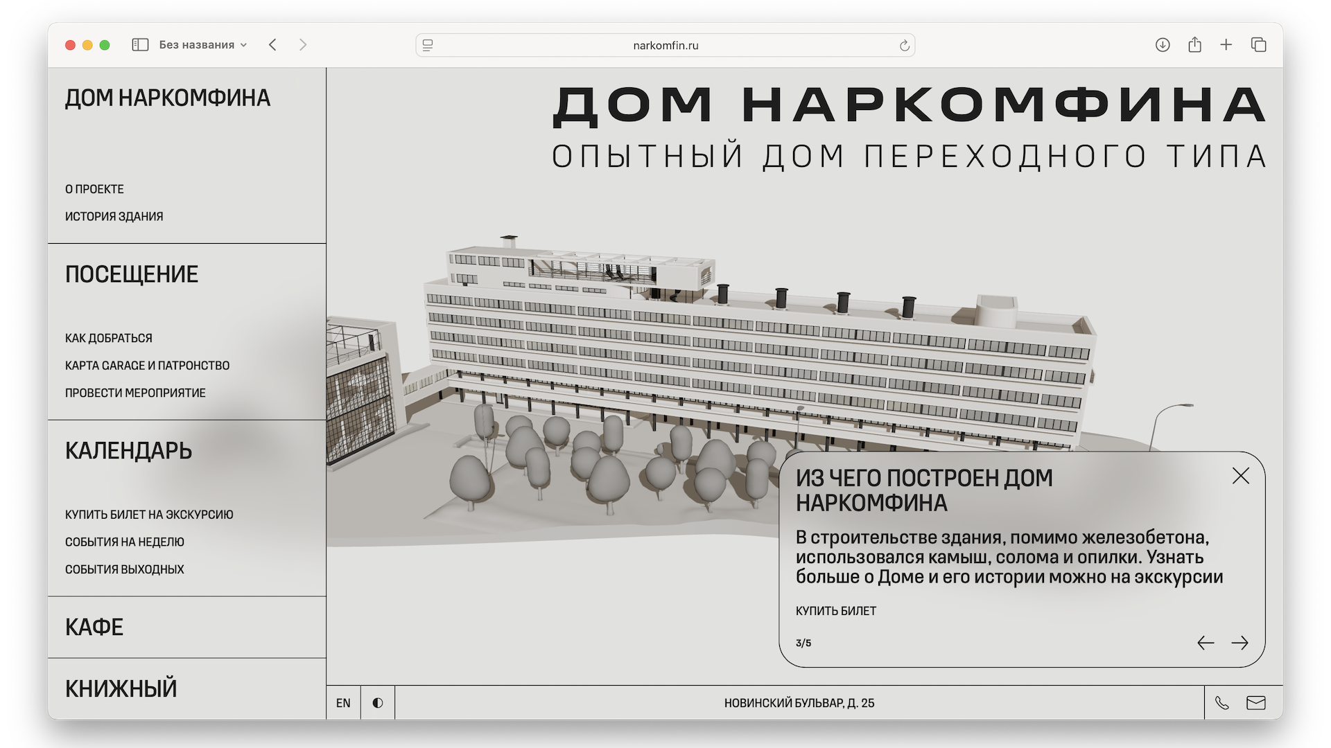 Дом Наркомфина — институциональный и исследовательский проект Музея современного искусства «Гараж». Команда Музея изучает как архитектурную значимость строения, так и истории жизни его создателей и обитателей на протяжении почти ста лет. Полученное знание становится основой экскурсионных маршрутов, публикаций, разнообразных публичных и просветительских проектов, выстроенных вокруг легендарного дома.