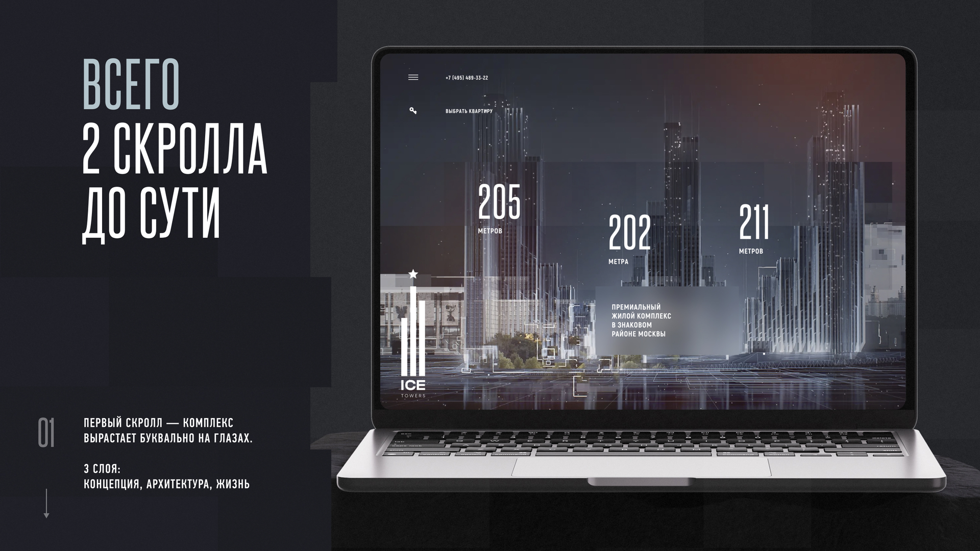К старту продаж в ЖК ICE TOWERS стояла задача создать соответствующий премиальному уровню проекта сайт с функциональным и неординарным дизайном.