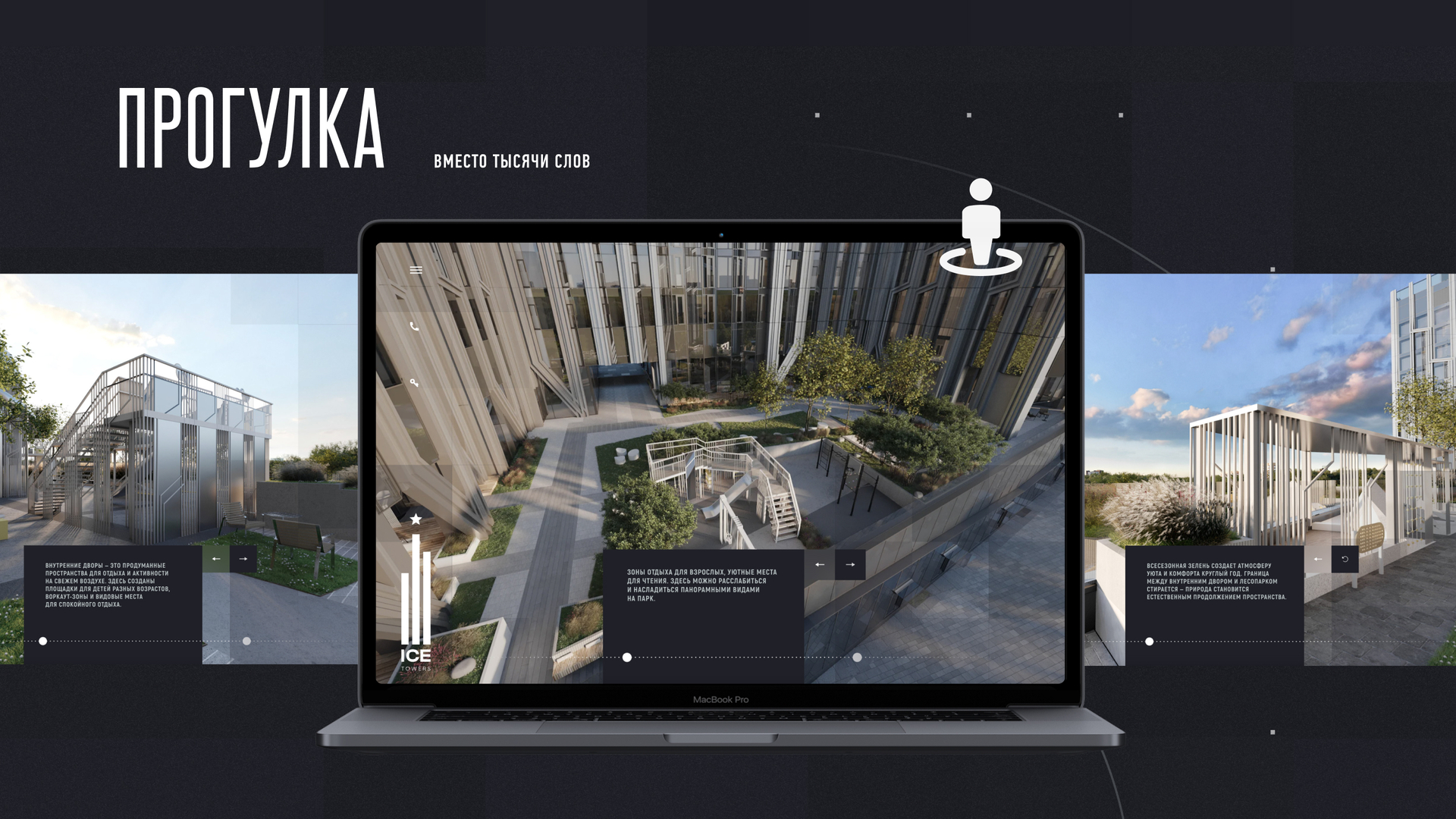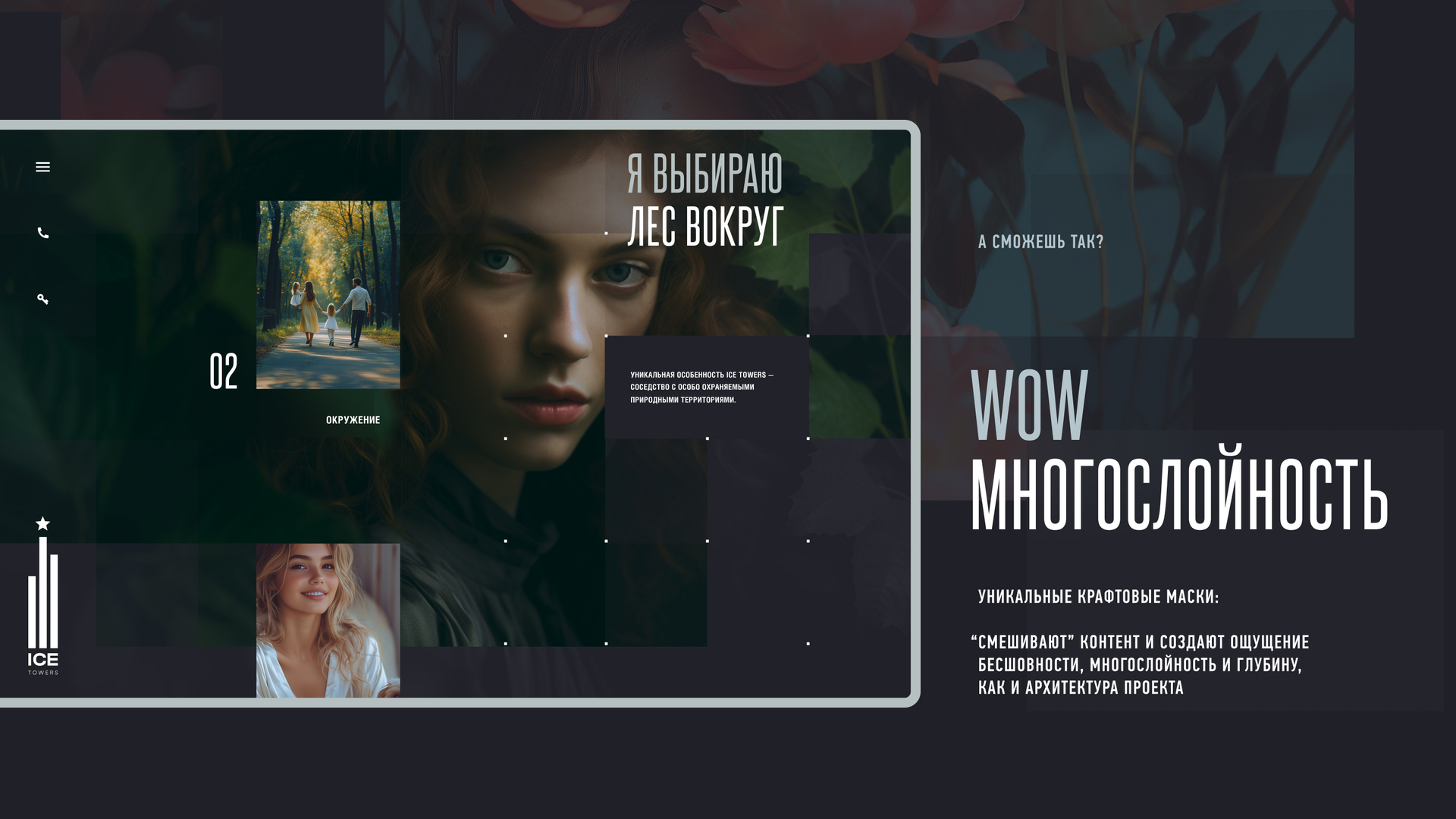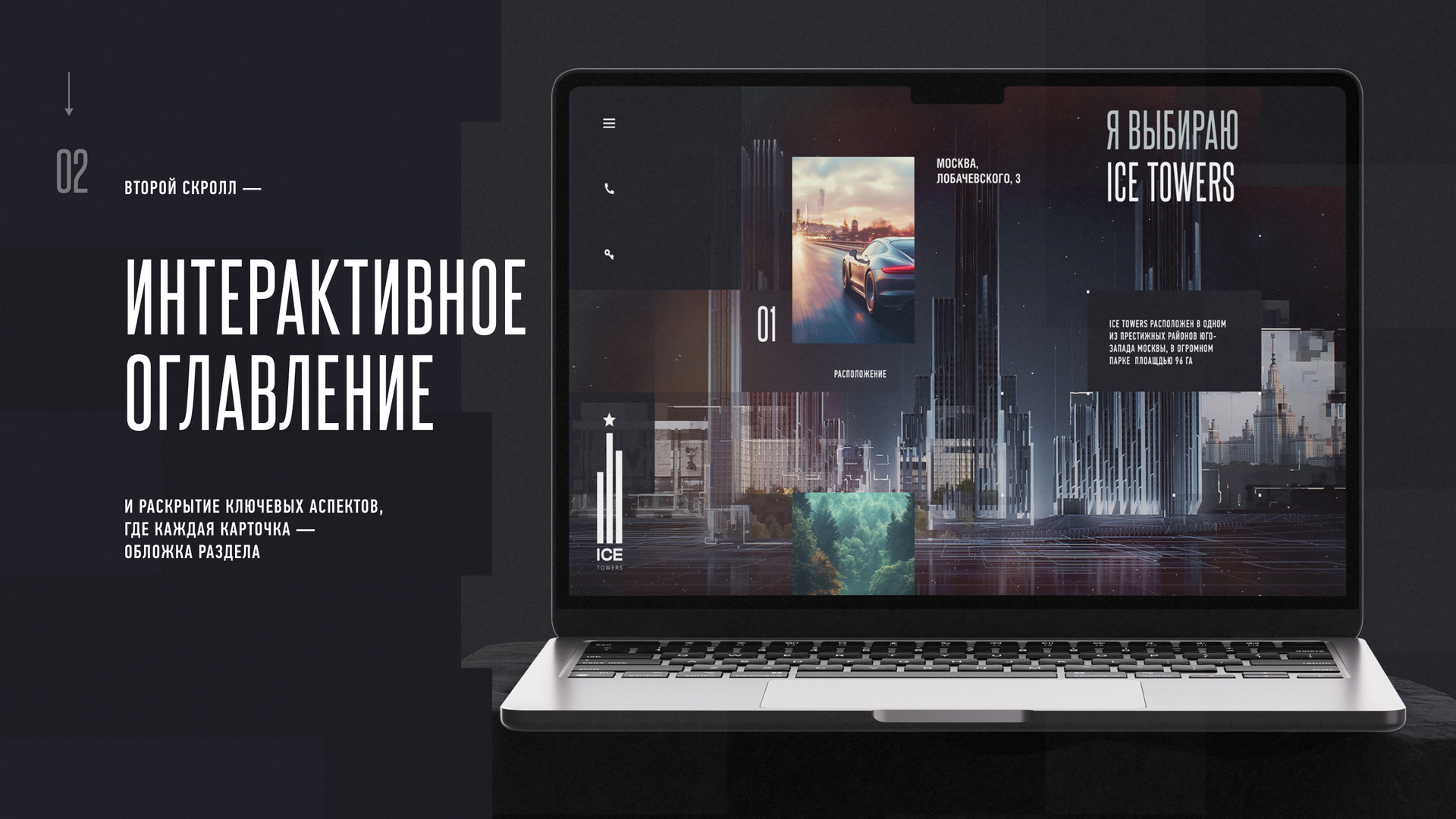 Сайт наполнен динамичной графикой и 3D-анимацией, которые передают эмоцию ICE TOWERS. Для проекта были созданы не только фотореалистичные визуализации, но и большое количество концептуальных имиджевых анимаций.