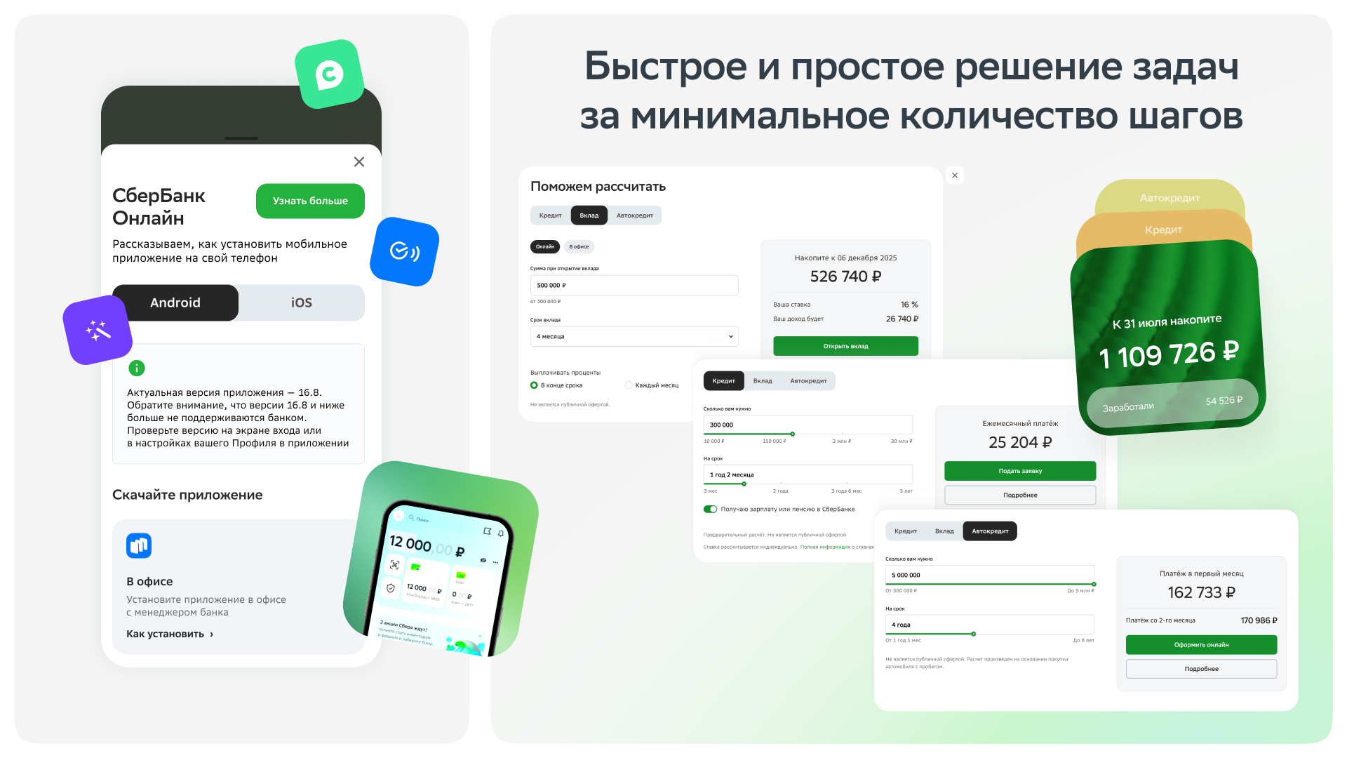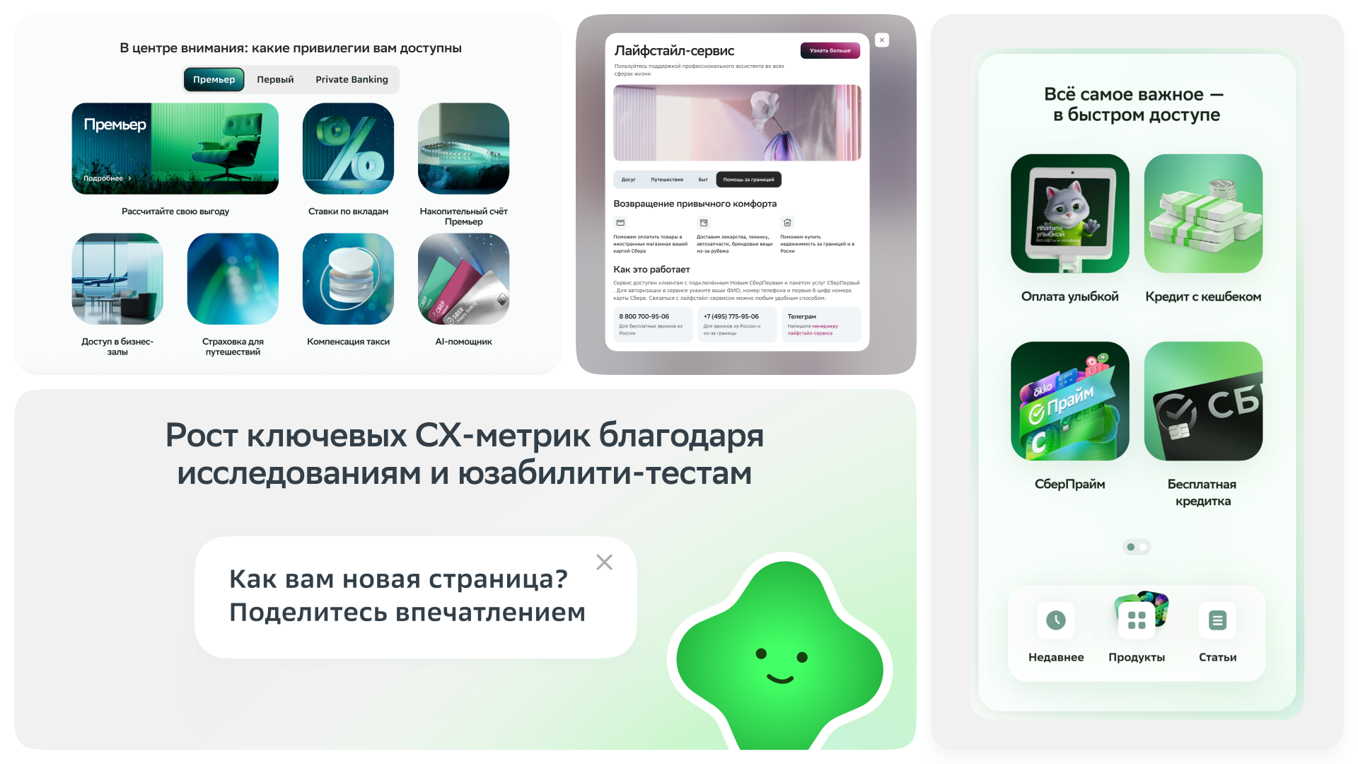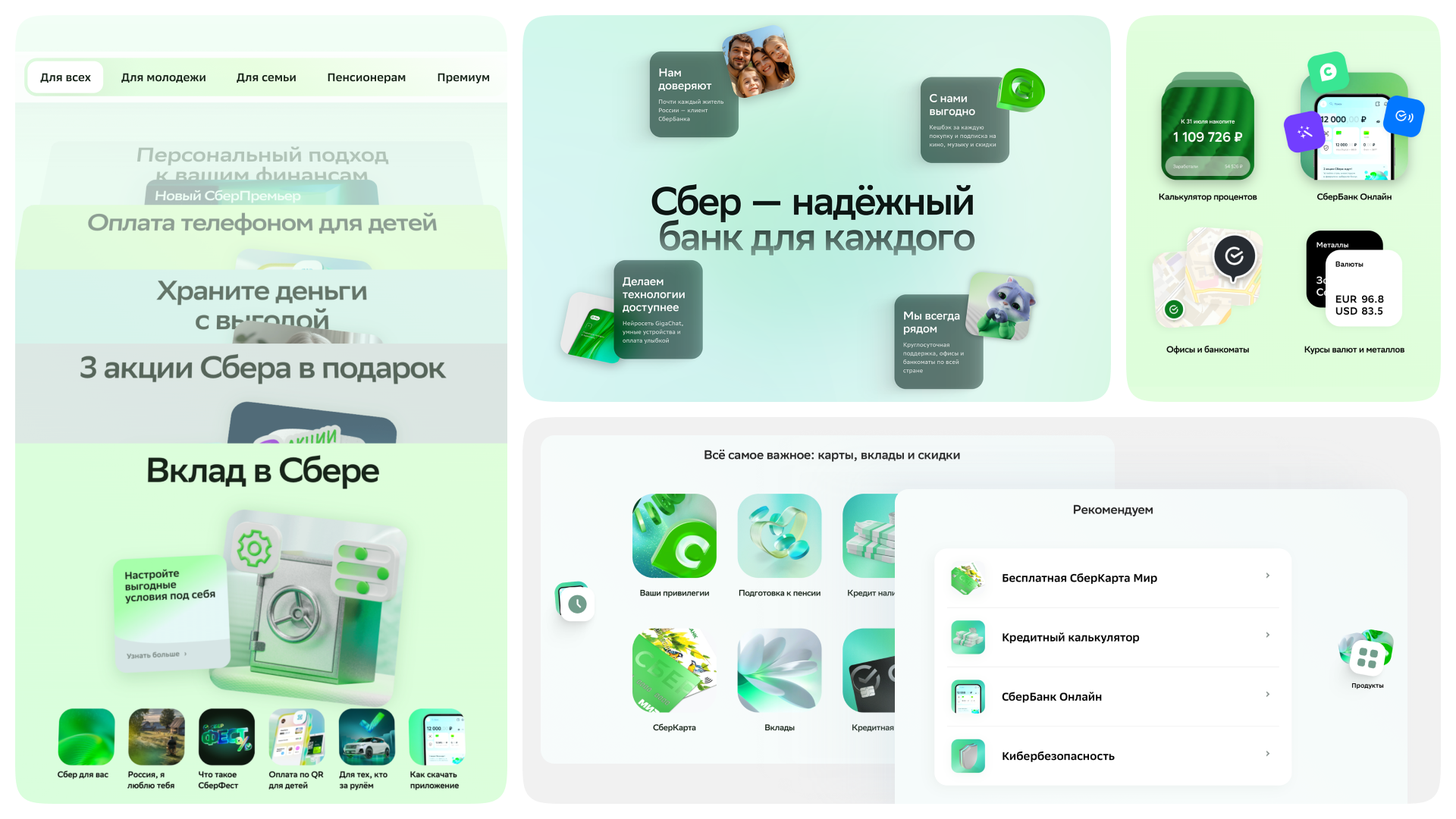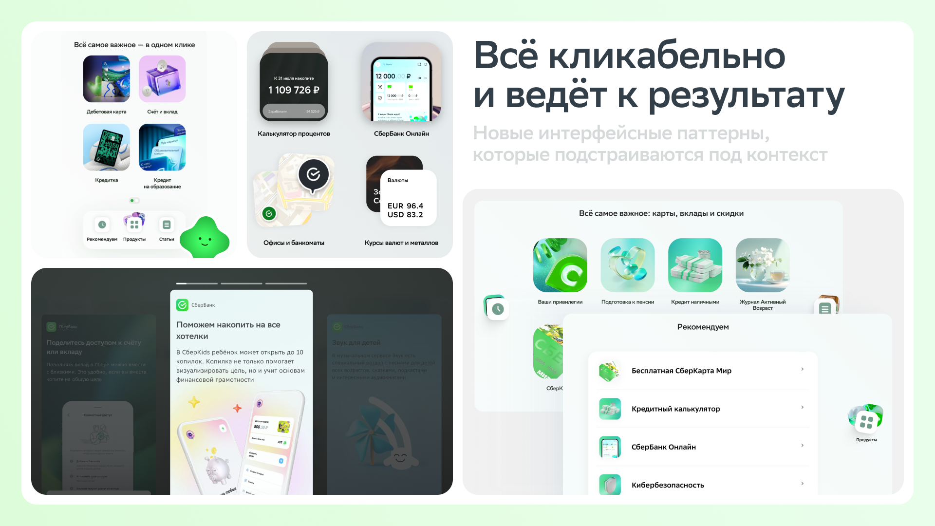 Мы отказались от привычного «банковского» визуала. В основе — эстетика новой креативной рамки Сбера, доброжелательная, лёгкая и свежая. Вместо традиционной структуры — новые паттерны взаимодействия, такие как сторис, шторки и AI-помощники, выстроенные вокруг поведения пользователя. Внедрили сегментацию: теперь пользователь видит именно актуальные для него продукты, причем в нужный момент.