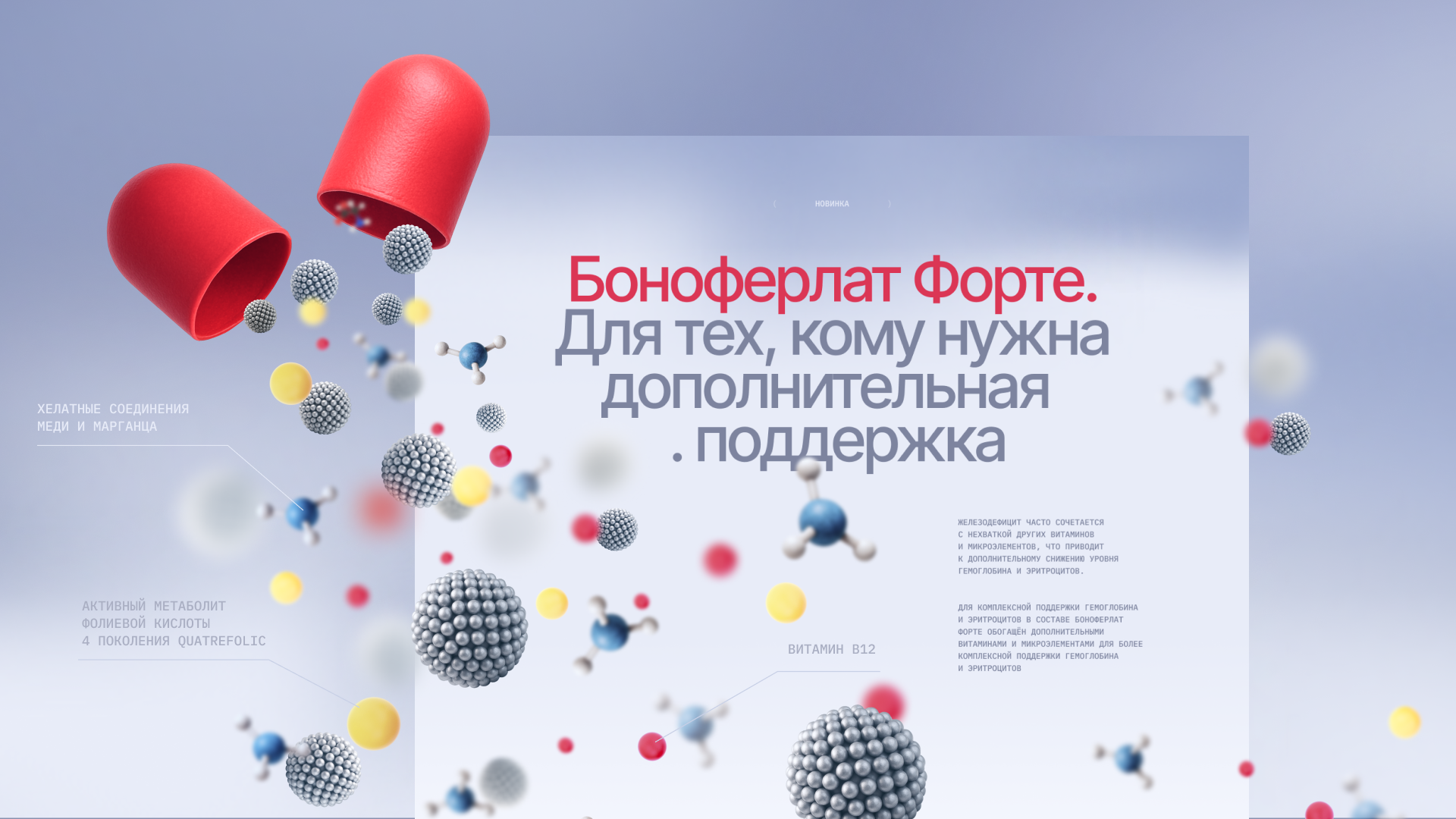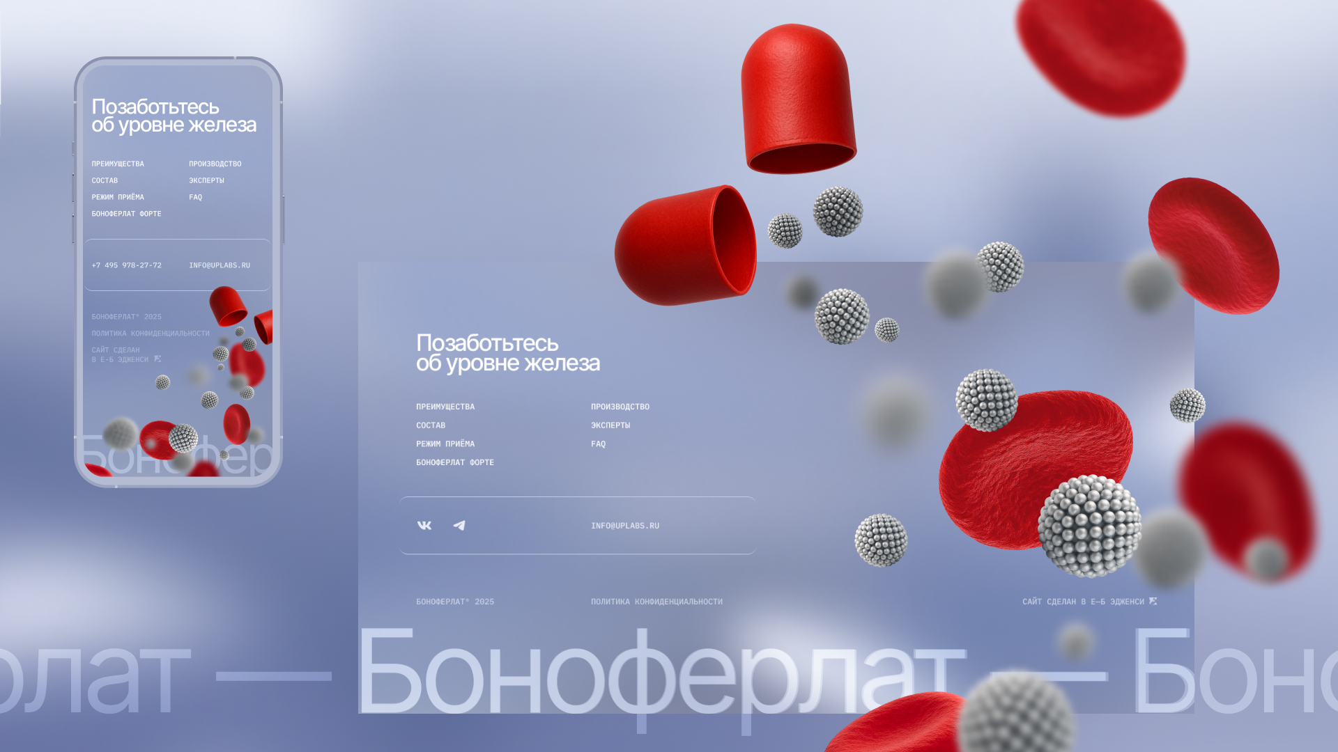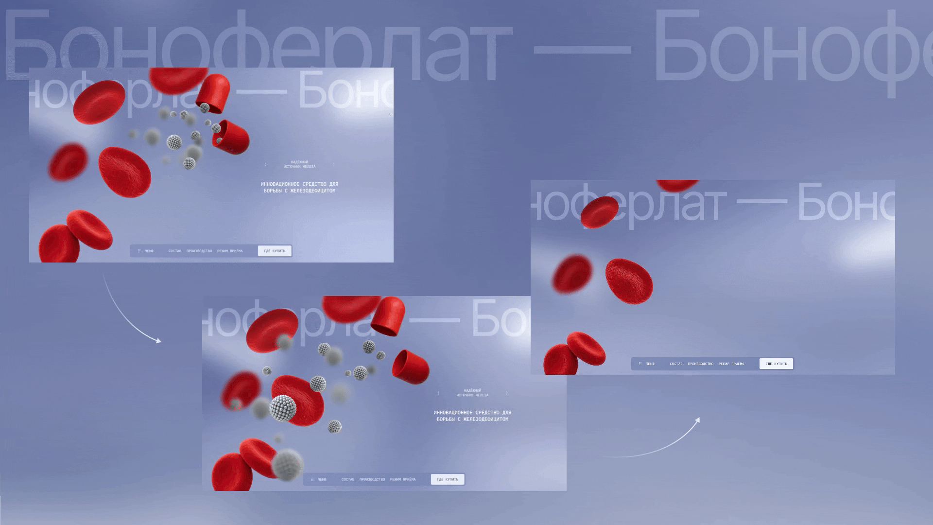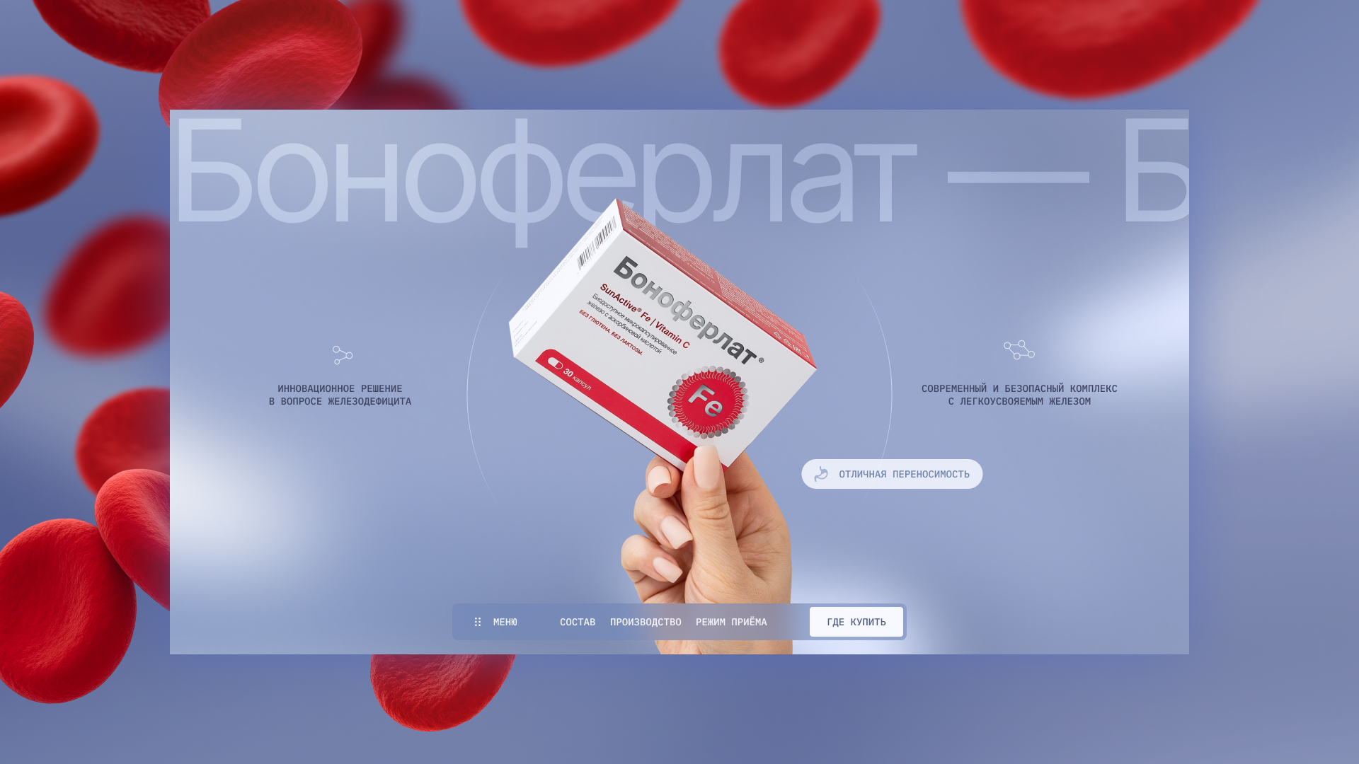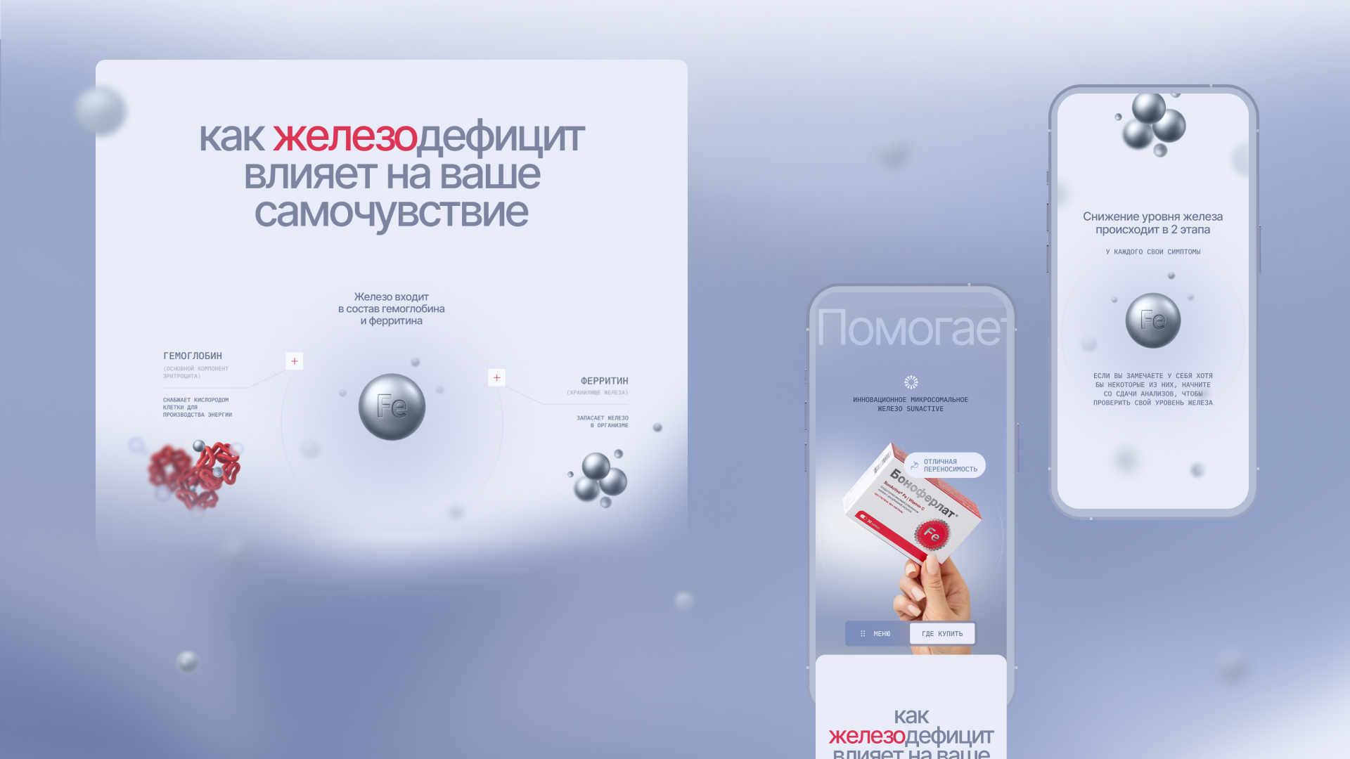 В дизайне соединили образовательный контент и эмоциональные визуальные элементы: показали состояние организма, последствия дефицита и пользу препарата. Таким образом, сайт не просто продает продукт, а просвещает пользователя, помогая понять, почему важно следить за уровнем железа и как работает БАД.
