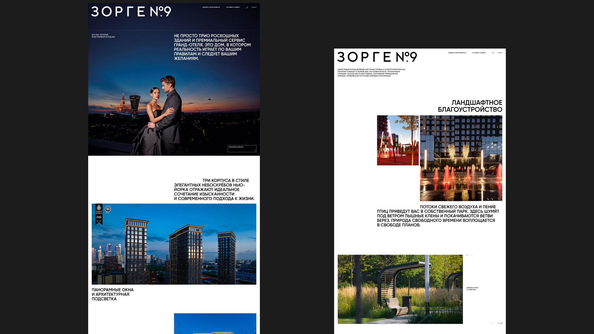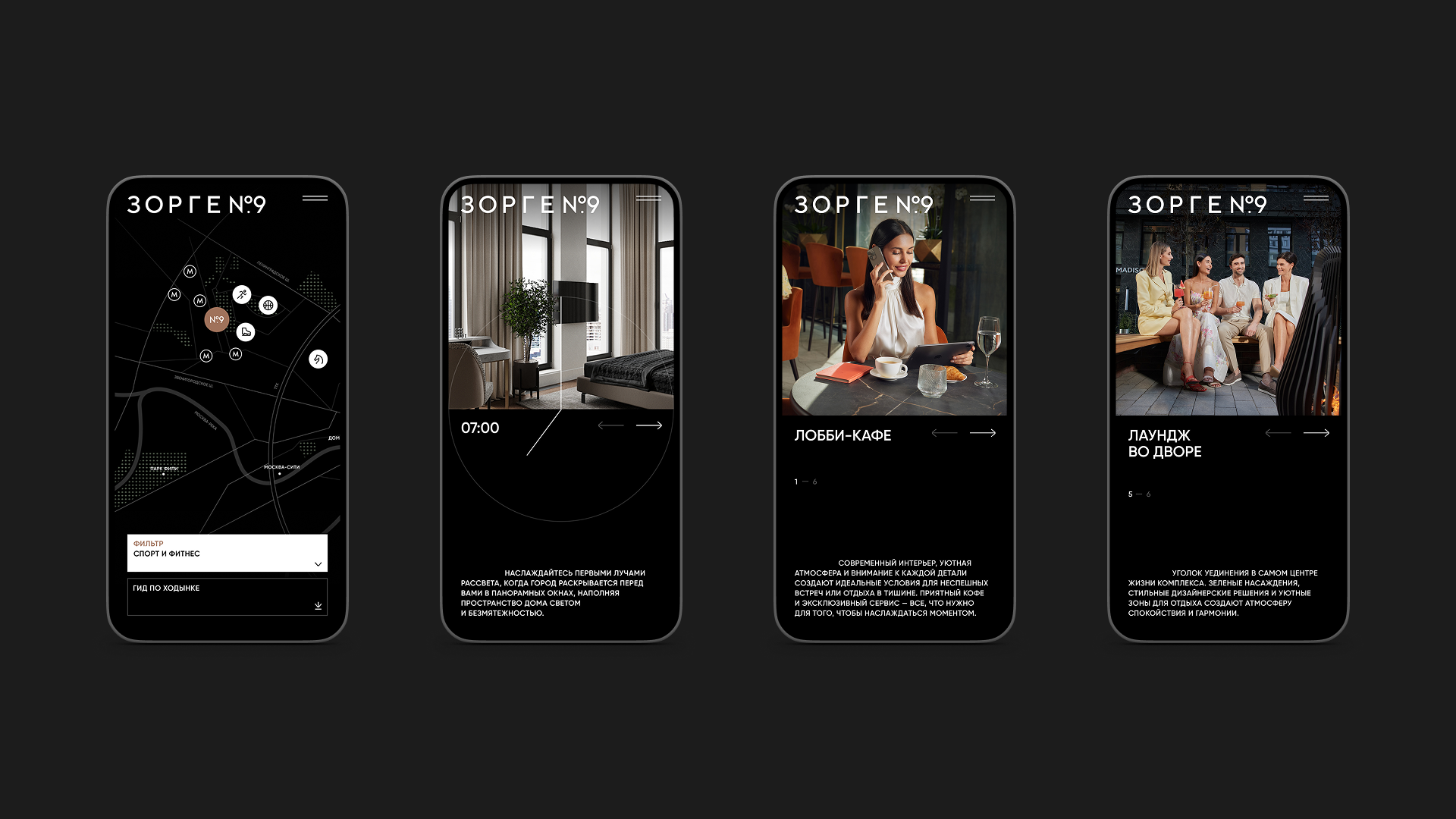 Мы усилили коммуникацию бренда, сделав акцент на статус и приватность. На сайте Зорге 9 будущий резидент видит не только архитектуру и планировки, но и ощущение уникальности: дом представлен как пространство, где ценят комфорт, независимость и современные сервисы.