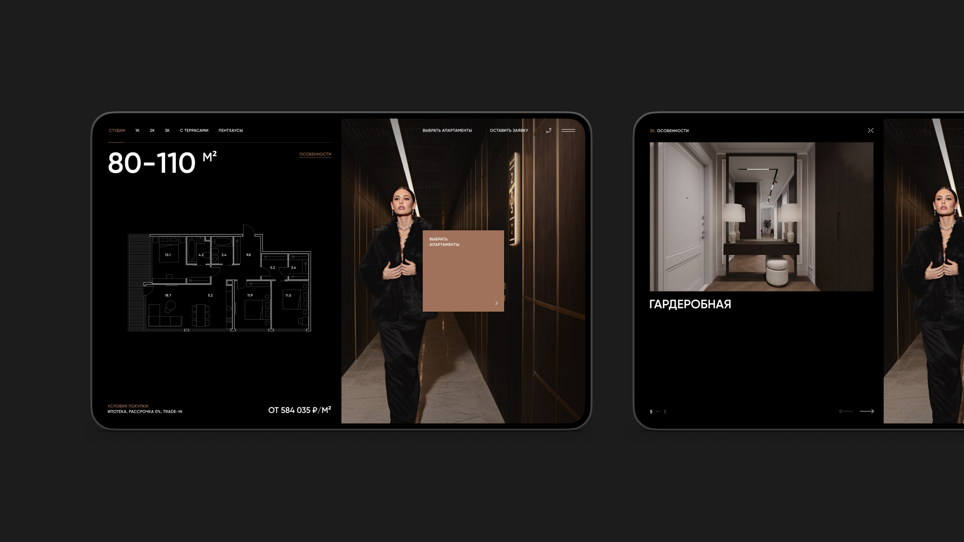 Визуальная концепция строится на глубокой цветовой палитре, акцентных деталях и строгой типографике, создающих образ актуальной, технологичной премиальности. Тексты написаны так, чтобы подчеркнуть исключительность и персонализированное обращение: «жизнь по вашим правилам», «дом с привилегиями».