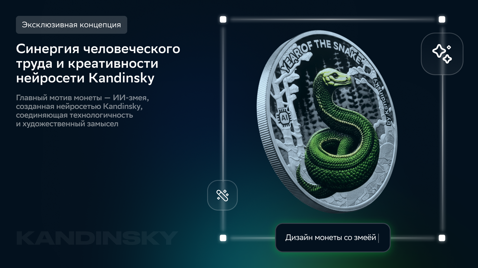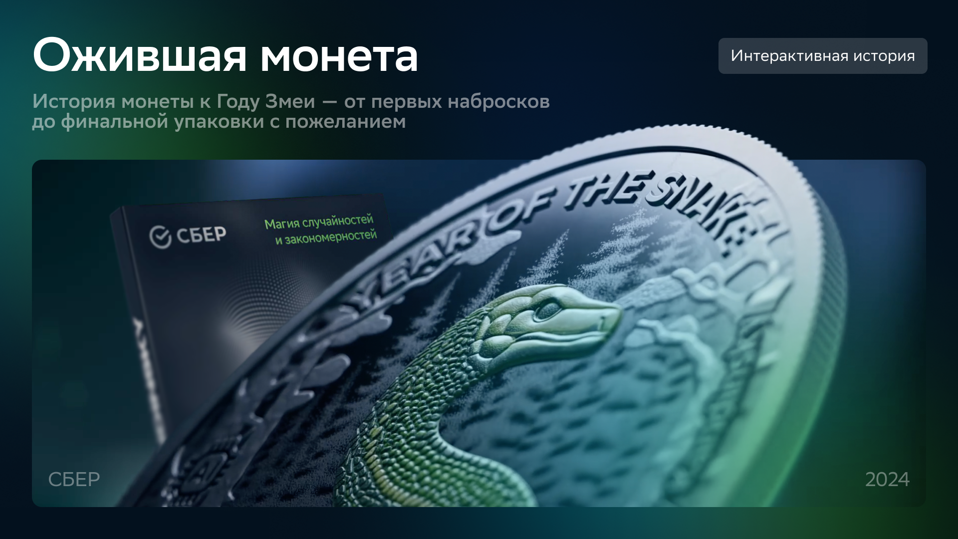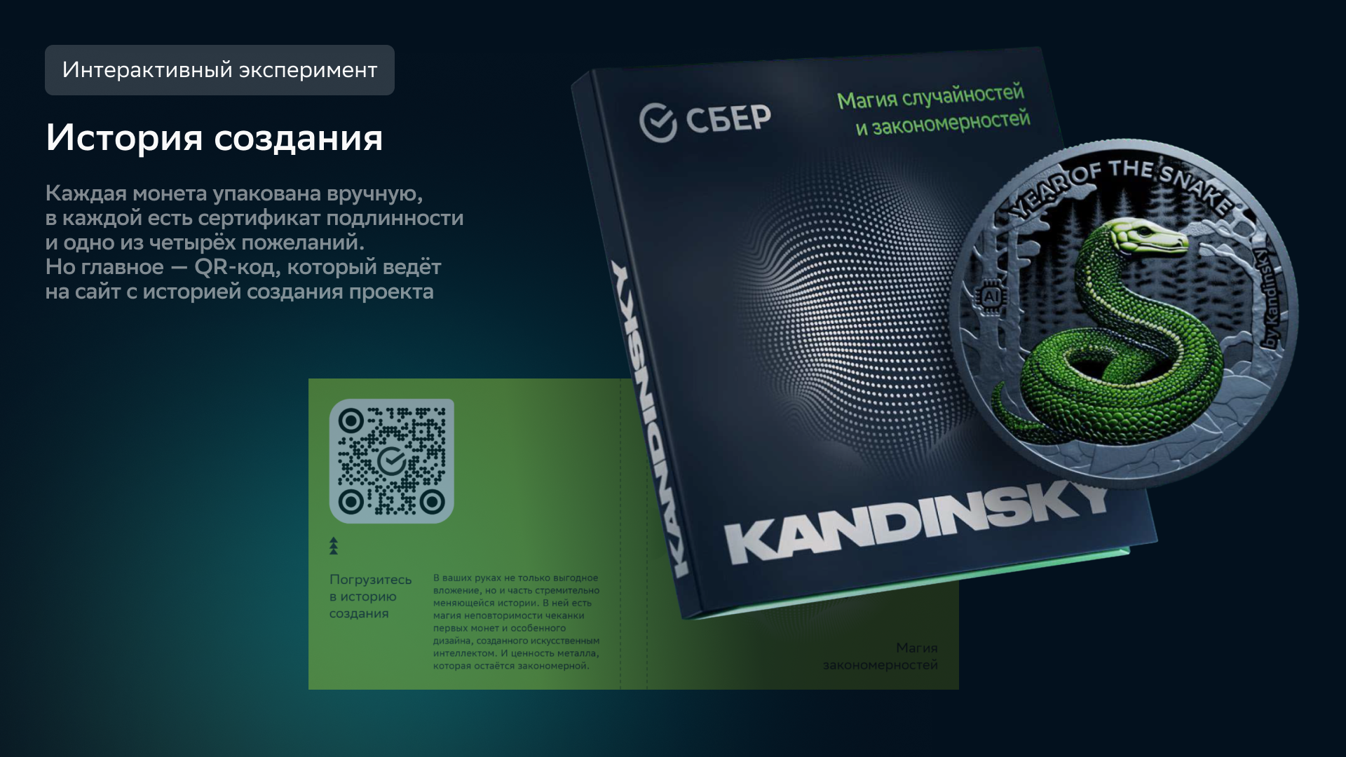 Интерактивная страница рассказывает историю монеты к Году Змеи — от первых набросков до финальной упаковки с пожеланием. Змея рождена в соавторстве с нейросетью Kandinsky — и в этой синергии ИИ и человека появилось нечто живое.
