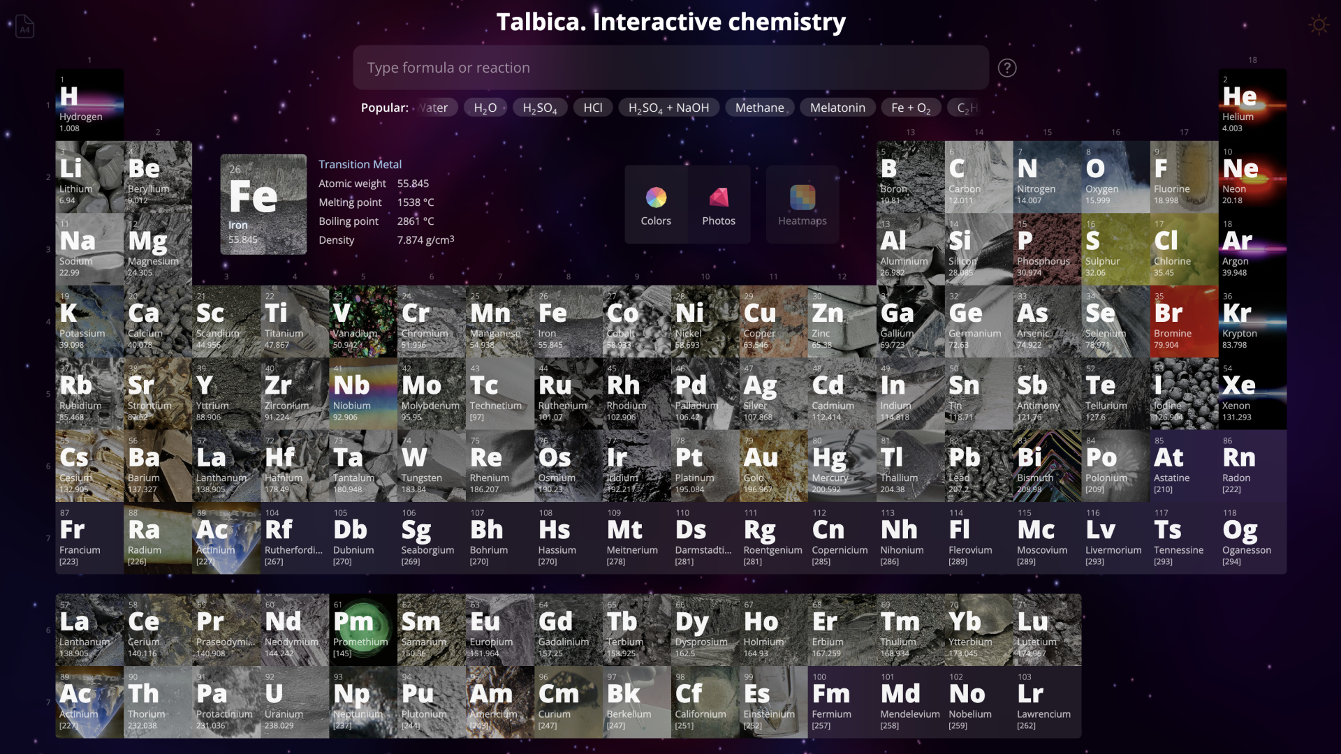 Тепловые карты смотрятся особенно невероятно в ночной теме на темном фоне. Но еще более потрясает фоторежим. При его включении цвета заменяются на мини-фотографии, а фон превращается в анимацию космического полета. Почему? Что ж, химические элементы родом из космоса. Как и все мы с вами.