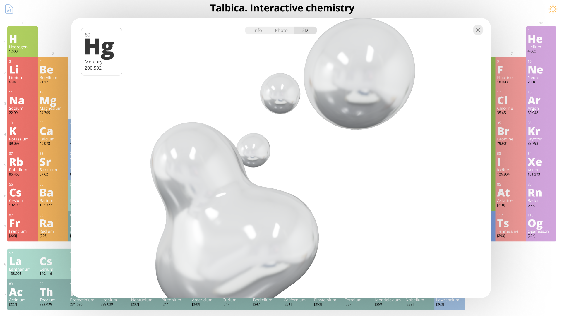 В новую версию таблицы добавлены 3D-модели каждого элемента, за исключением самых радиоактивных, которые распадаются слишком быстро, чтобы их вообще можно было заснять. Многие модели даже обладают трехмерной анимацией. Например, жидкий азот кипит в пробирке, гелий светится в газоразрядной трубке, а ртуть разлетается на шарики. Это не декоративная графика — это визуализация самой сути элементов, с учетом всех особенностей их блеска, поверхности и структуры. Ничего подобного до этого не существовало в природе.