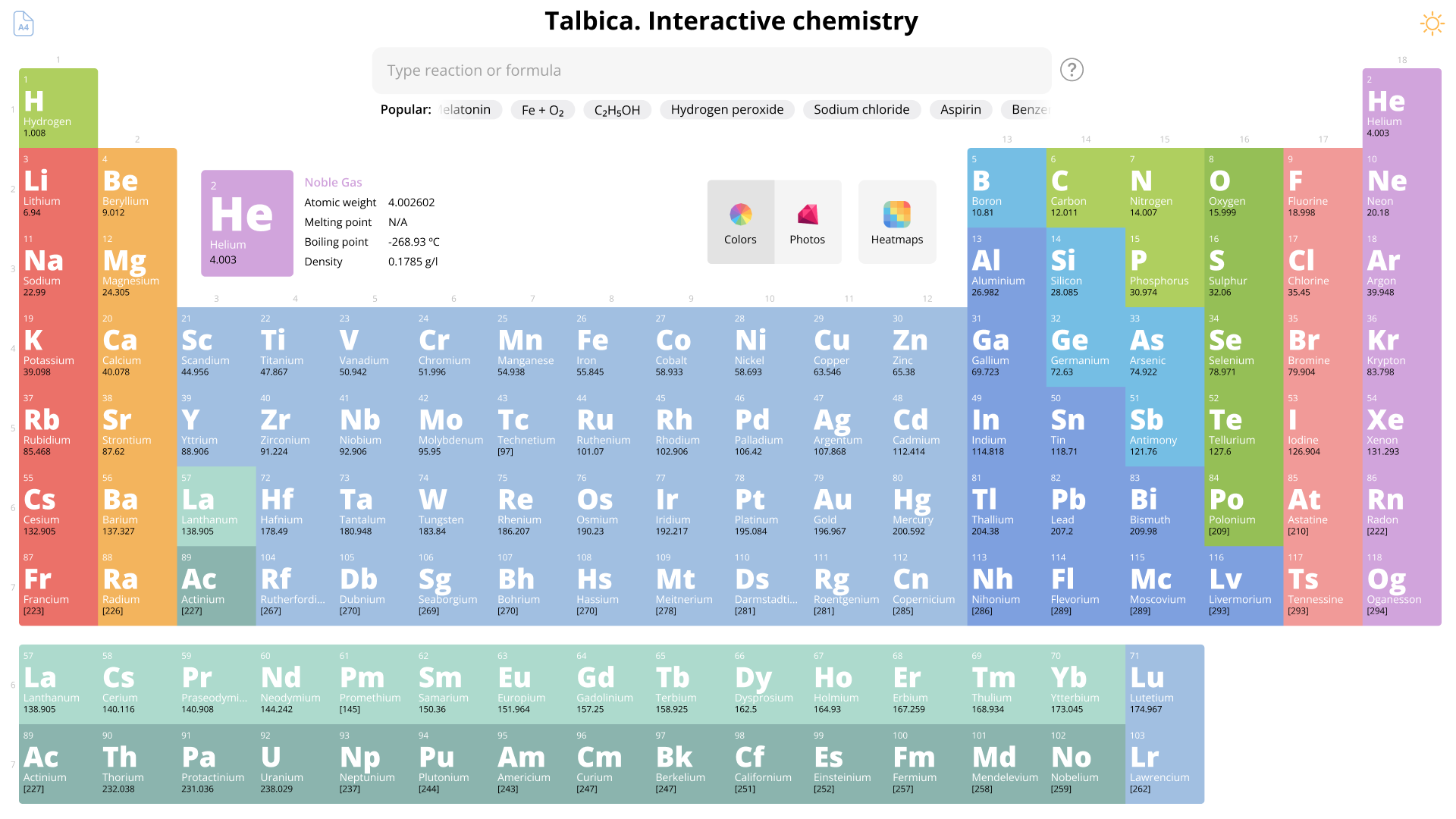 Помимо стандартной раскраски по типам элемента, Талбица умеет строить тепловые карты. С помощью них школьник может увидеть воочию, как распределяется, например, температура кипения или плотность по периодам и группам.