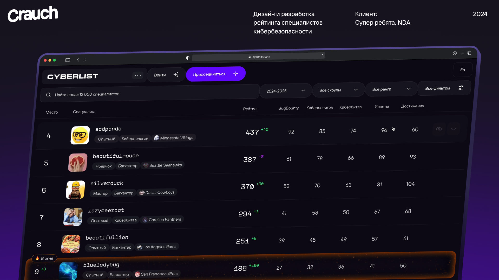 Директор по развитию CYBERLIST (настоящее название под NDA), пришёл с понятной, но сложной задачей. Рейтинг хакеров не работал: не мотивировал выполнять задания и мешал масштабировать продукт. Отчёты были несистемными — каждый хакер заполнял их по-своему. Из-за этого страдало качество данных и взаимодействие с компаниями. Нужно было переосмыслить механику: сделать её прозрачной, полезной и мотивирующей. У компании уже был удачный опыт работы с Crauch на другом проекте, поэтому клиент позвал нас в проект — вместе с командой SNP, которая отвечала за разработку.