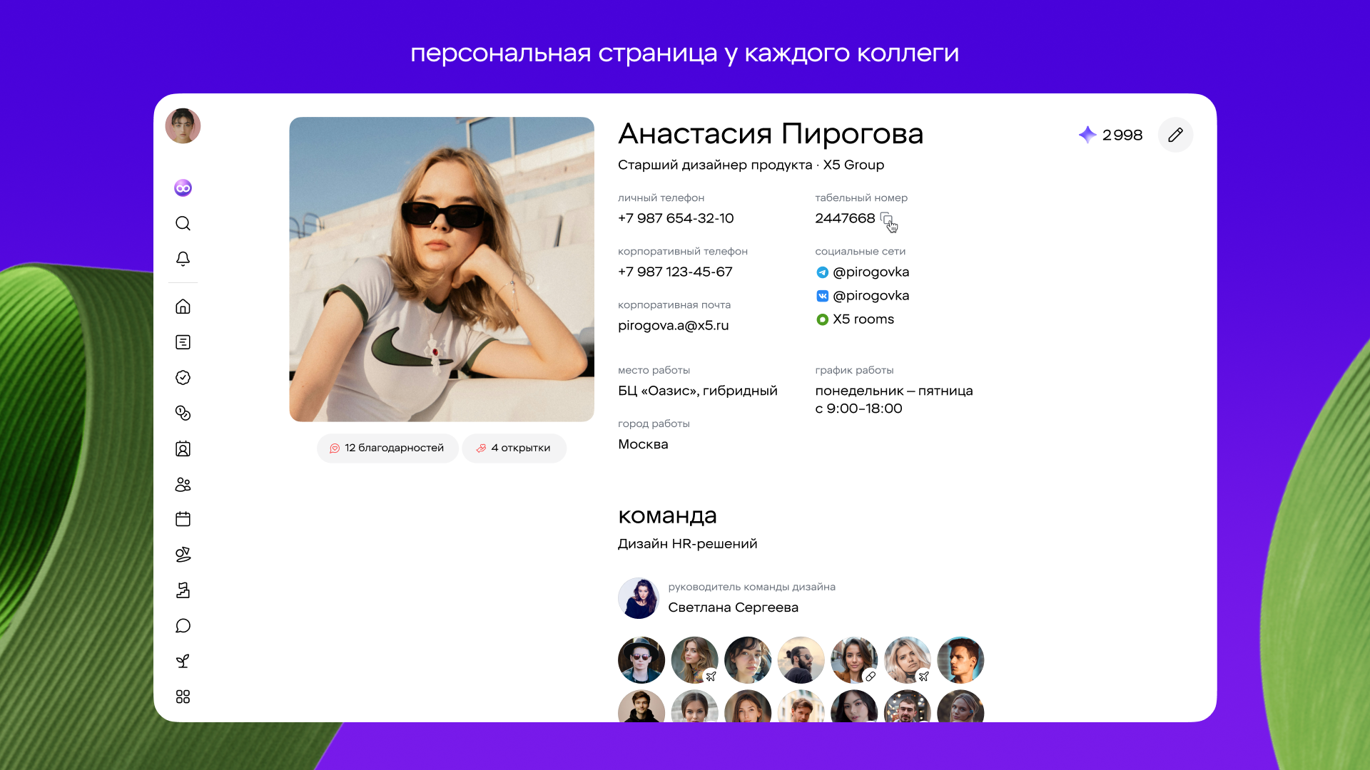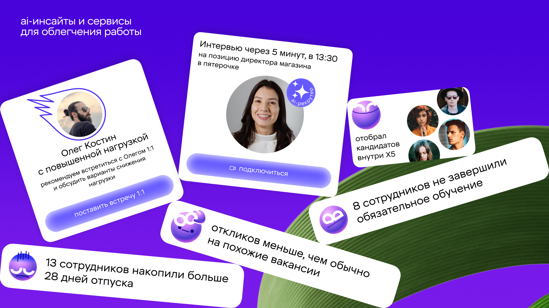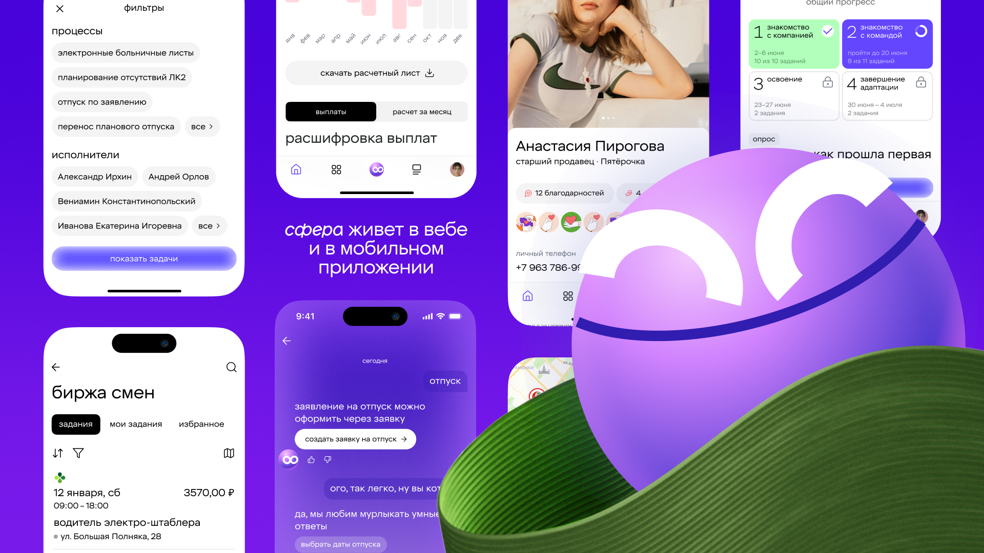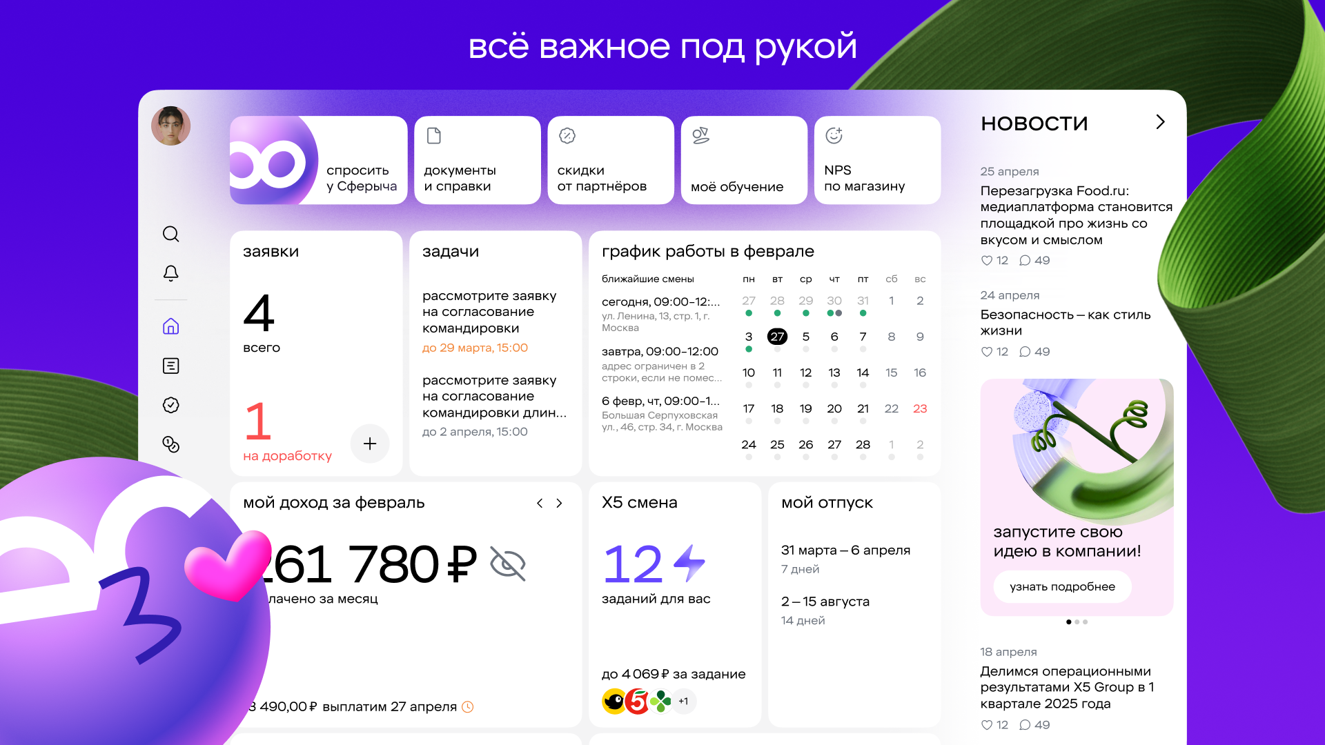 Сфера Х5 — это цифровая HR‑платформа для более 400 000 сотрудников Х5, объединяющая ключевые сервисы для работы с первого дня до exit‑интервью. Здесь сотрудники планируют отпуск, оформляют документы и справки, проходят обучение, ставят цели, рекомендуют друзей и делятся обратной связью.