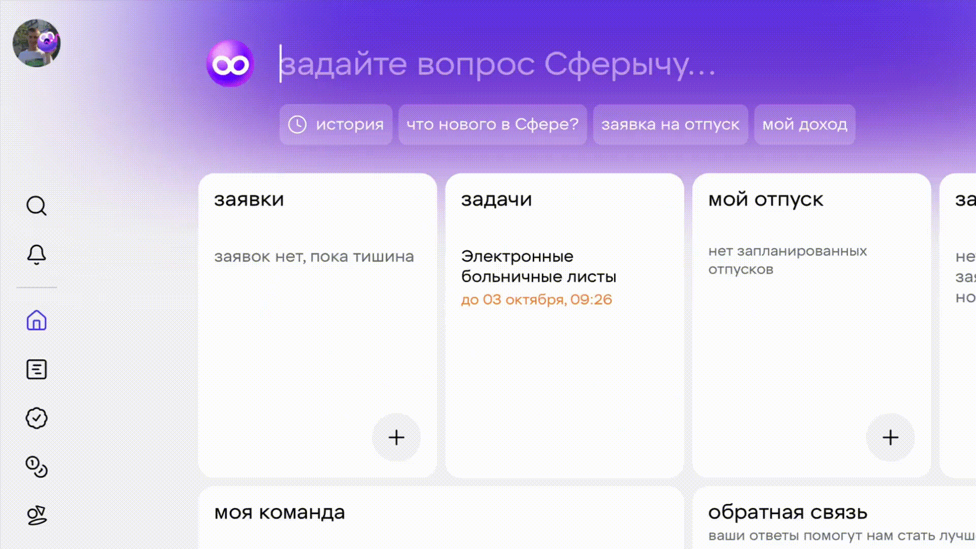 AI‑ассистент Сферыч говорит «по‑человечески». Короткие и понятные ответы, уместные уточнения, никакого канцелярита. Так сложные вопросы сотрудников превращаются в простой и понятный диалог с умными подсказками и быстрыми действиями в несколько кликов.