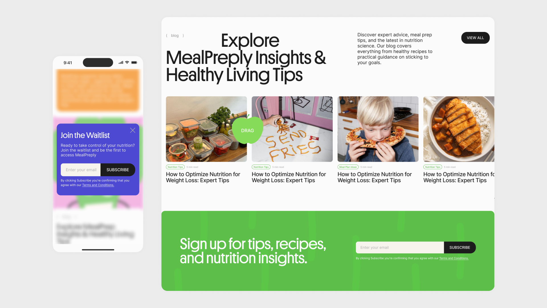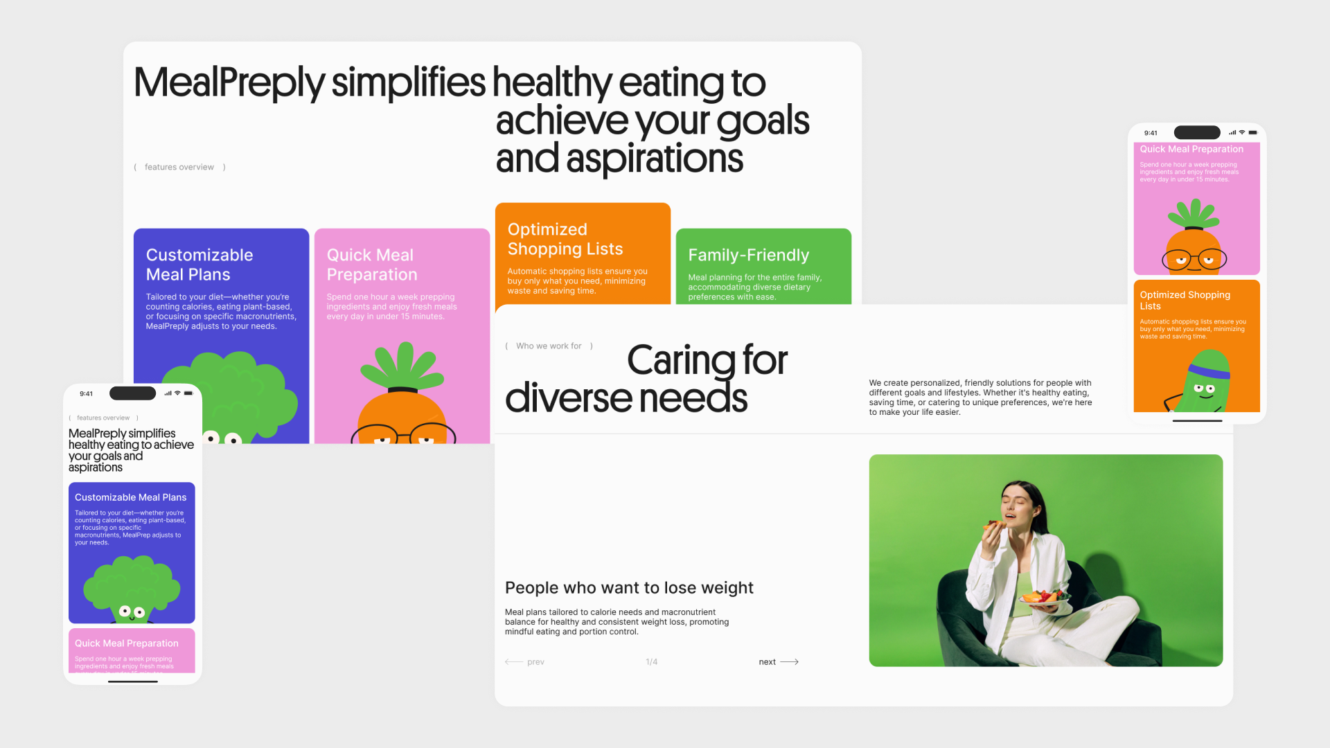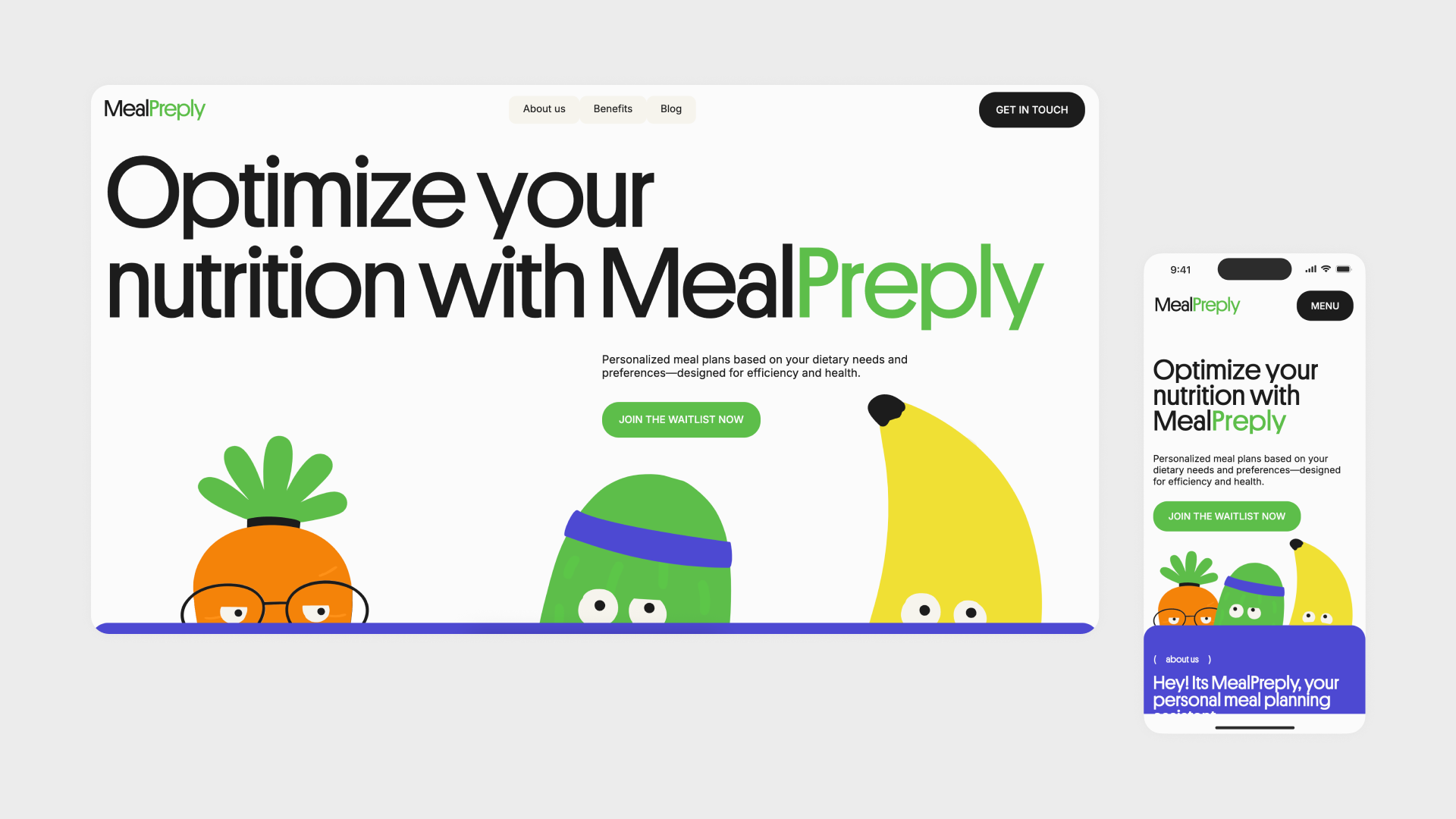 MealPreply родился как идея персонального помощника по планированию питания. Задача лендинга была не просто представить продукт — он должен был создать мгновенную эмоциональную связь с пользователем и сразу передать ценности бренда: заботу, энергию и простоту.