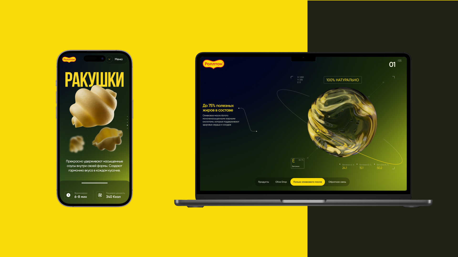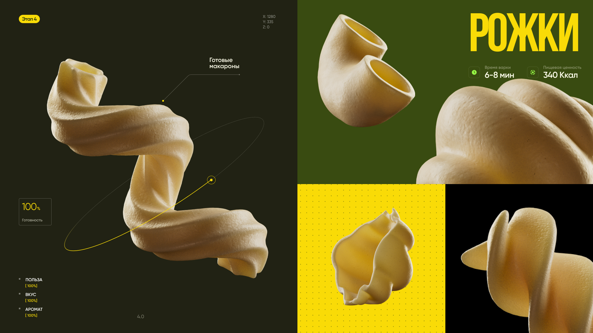 Мы предложили концепт в эстетике Apple: глубокий фон, фокус на основном объекте, сдержанная графика и аккуратные сноски с ключевыми преимуществами. Визуальную основу составили разработанные нами 3D-модели и анимации всех SKU — рожков, спиралей, витков, ракушек и лингвини, подчёркивающие качество и премиальность продукта.
