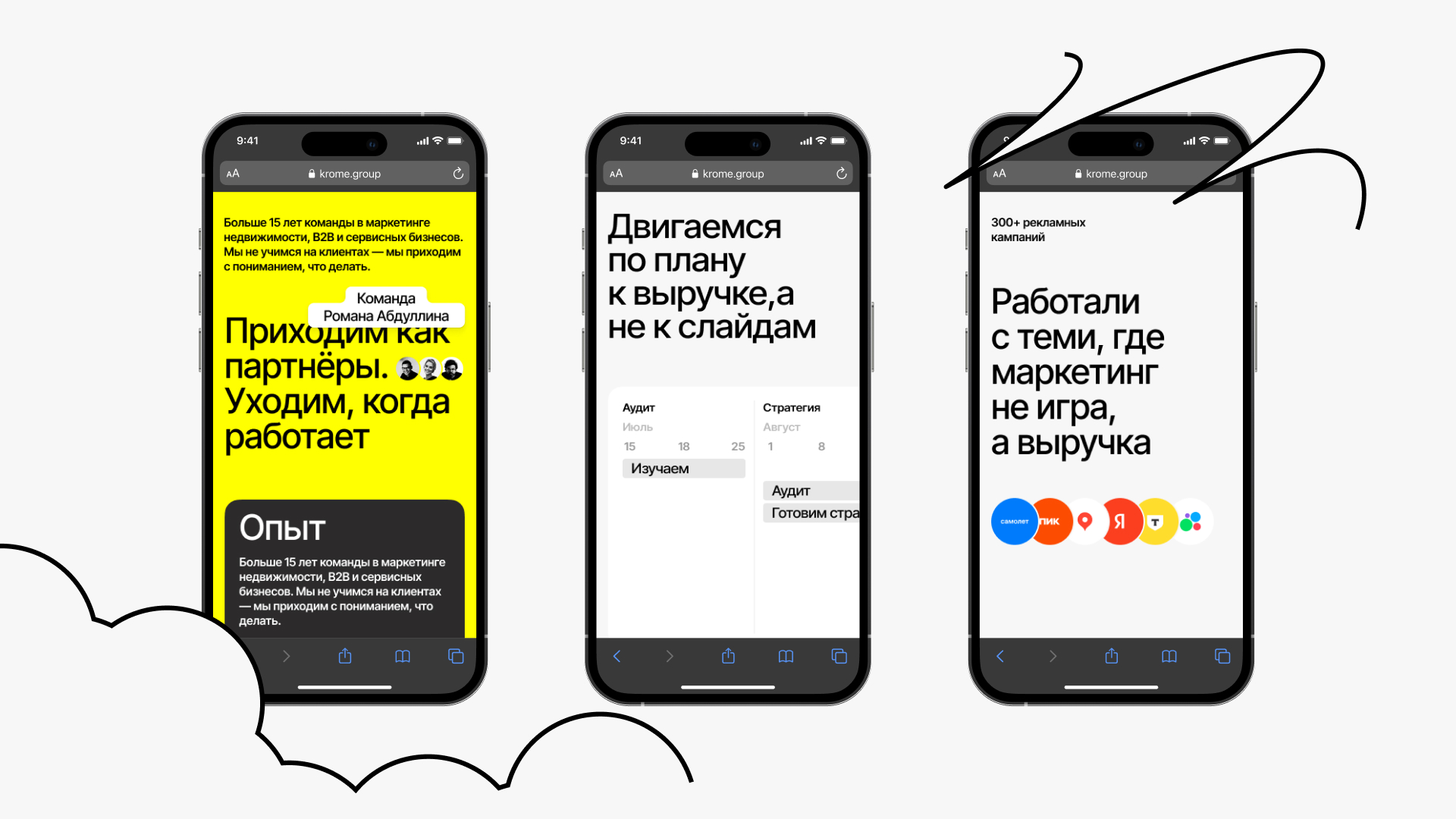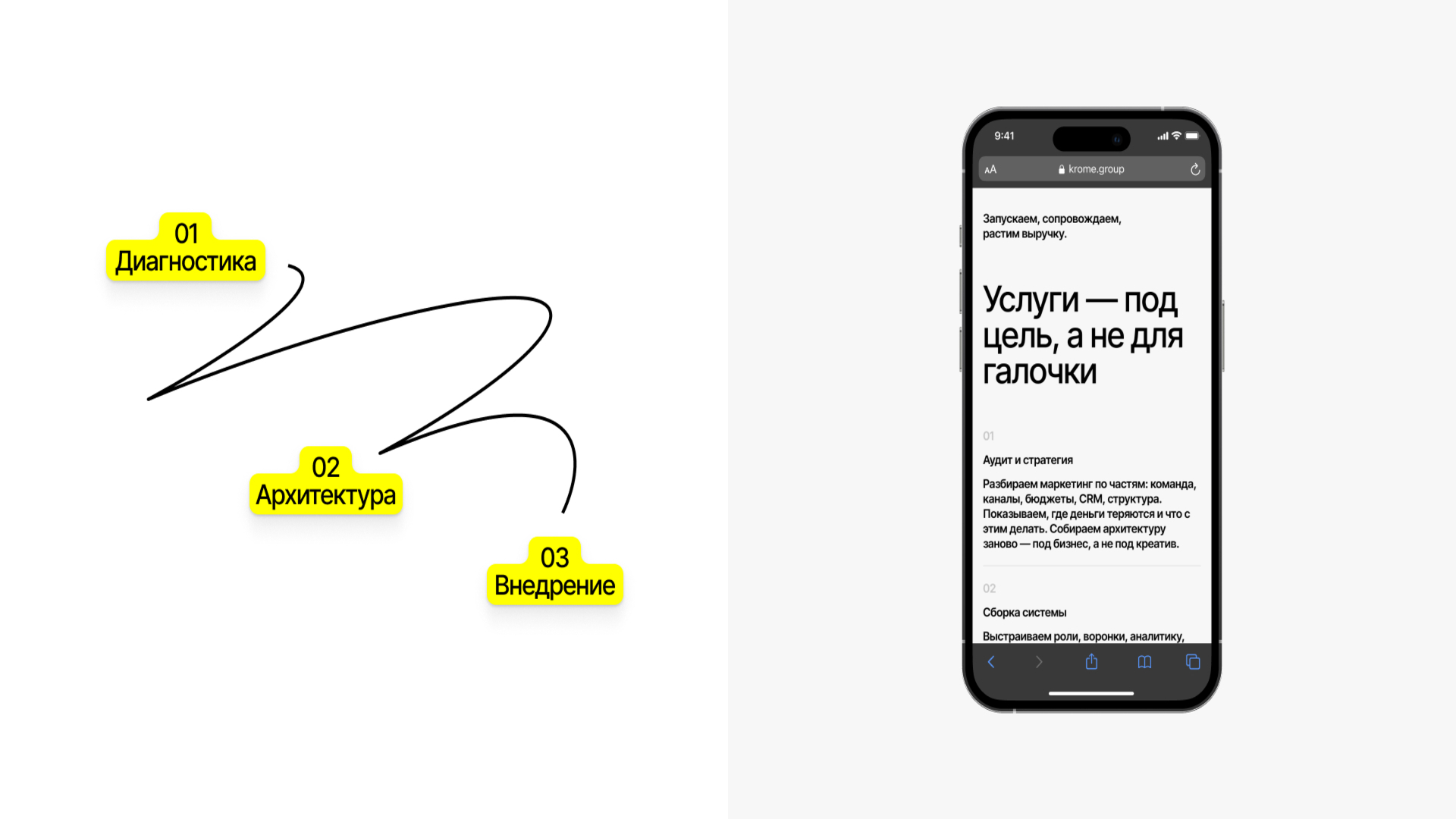 До старта проекта у Krome Group не было полноценного фирменного представительства в digital. Визитка в Notion не отражала масштаба агентства и не работала на продажи. Клиент хотел упаковаться по-взрослому, но при этом сохранить живость, дерзость и уникальный голос.