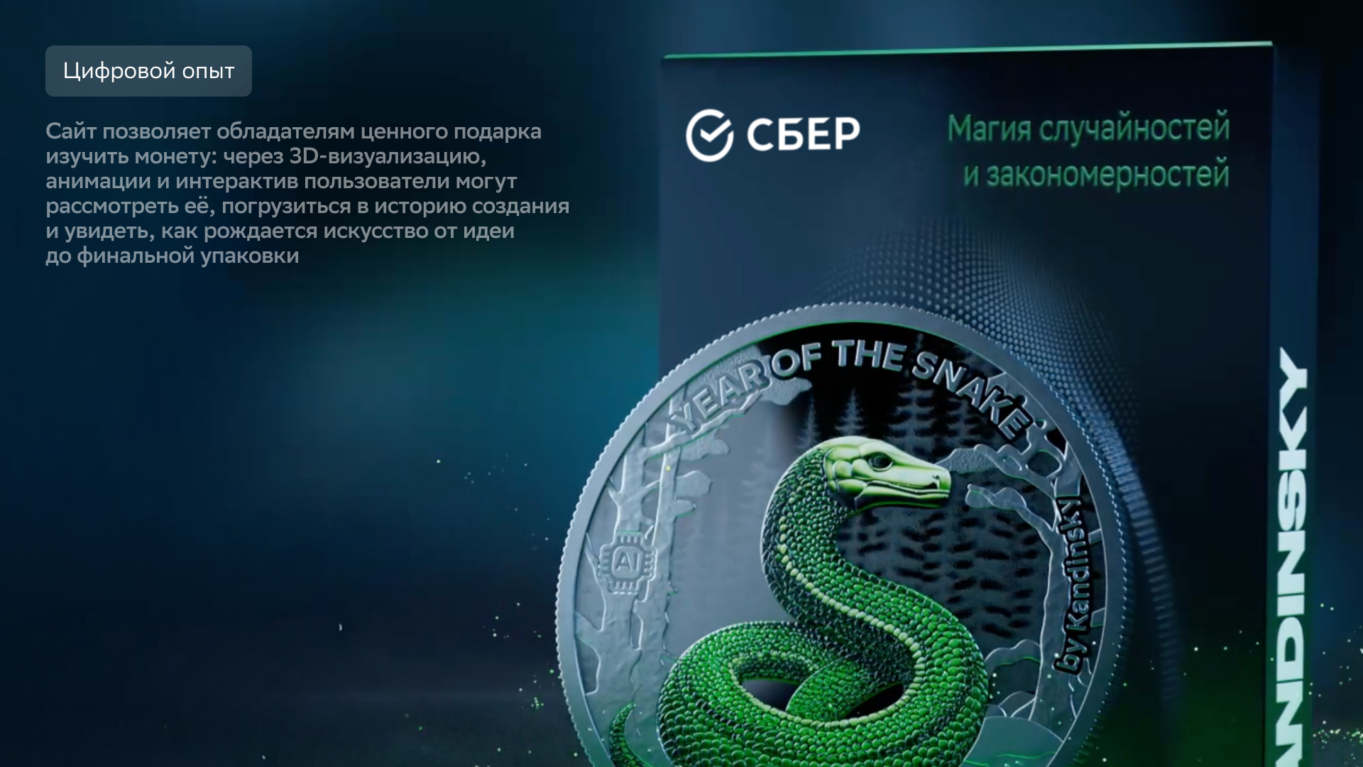 Мы создали монету, где каждая деталь продумана до совершенства: рельеф, текстуры, блеск — всё, чтобы сувенир был ценным и цепляющим. Главный мотив — ИИ-змея, созданная нейросетью Kandinsky, соединяющая технологичность и художественный замысел.