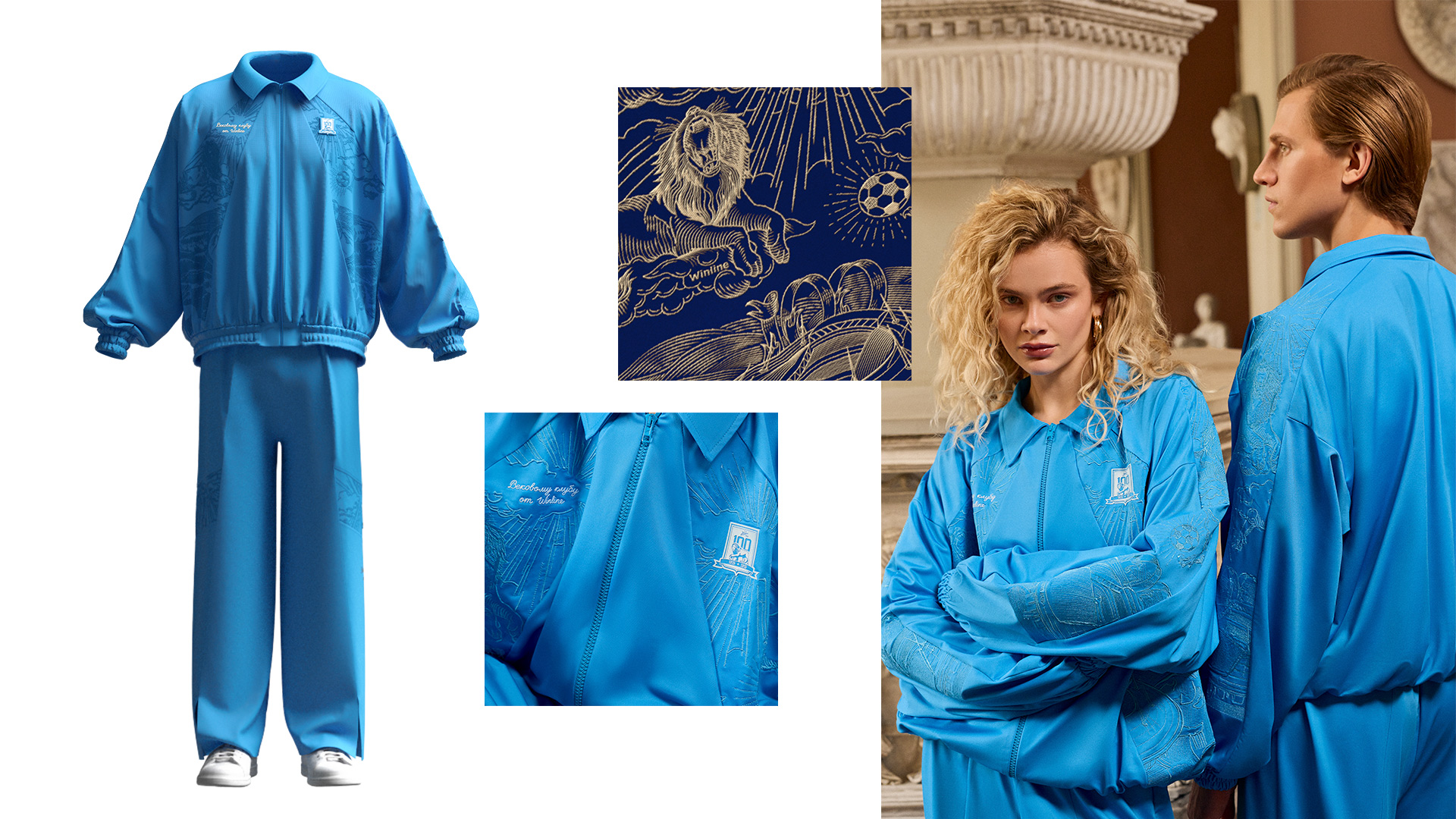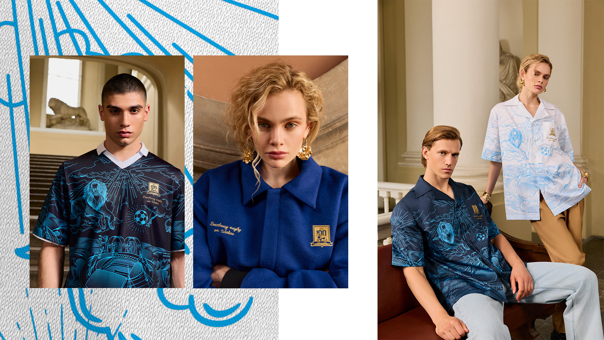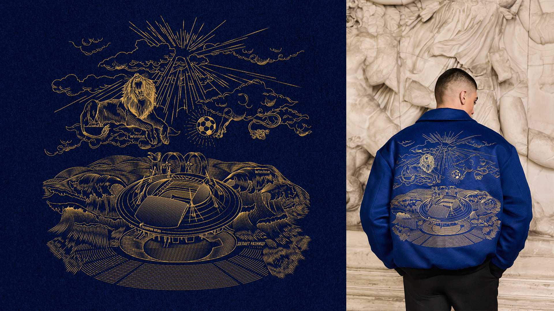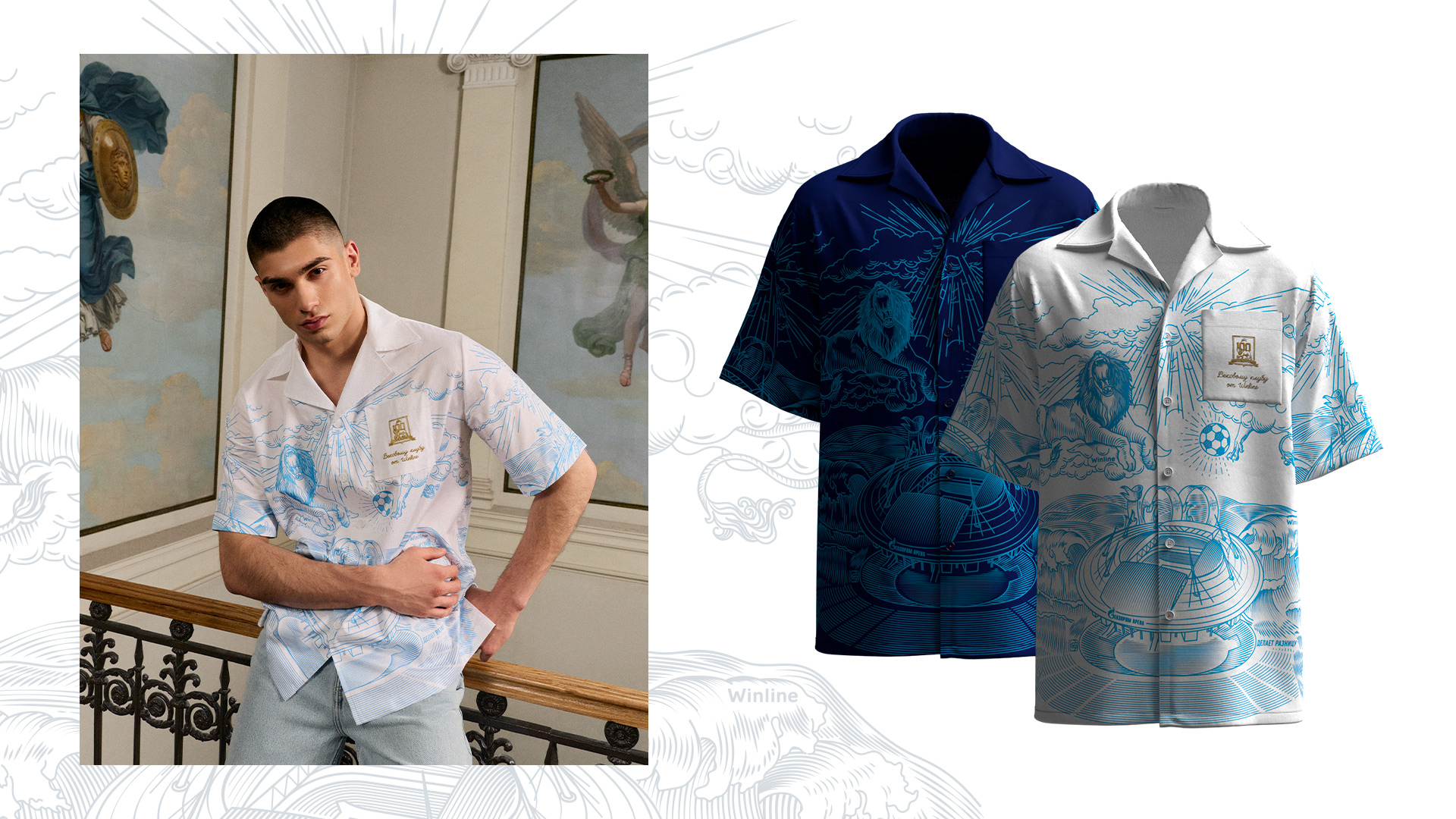 Концепция коллекции строится на уважении к истории и роли сине-бело-голубых в жизни Петербурга. Визуальный язык объединяет разные эпохи — от легендарного стадиона имени Кирова до современного облика «Газпром Арены», от мифологического образа льва до графической метафоры солнца в зените. Монохромная гравюра, в которой сочетаются античные мотивы небес, грома, стадиона и мяча, превращает одежду в своеобразную хронику: она фиксирует прошлое, раскрывает настоящее и задает вектор в будущее.