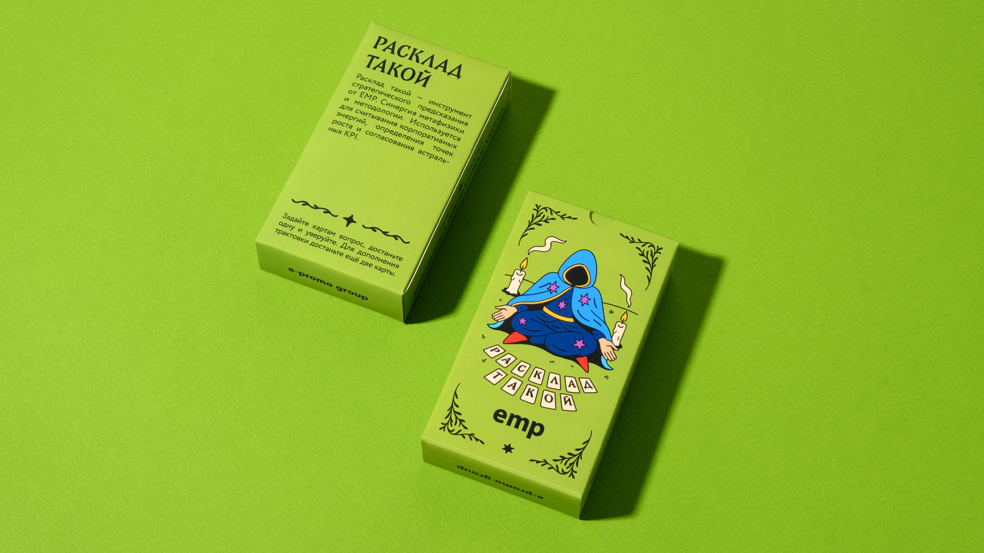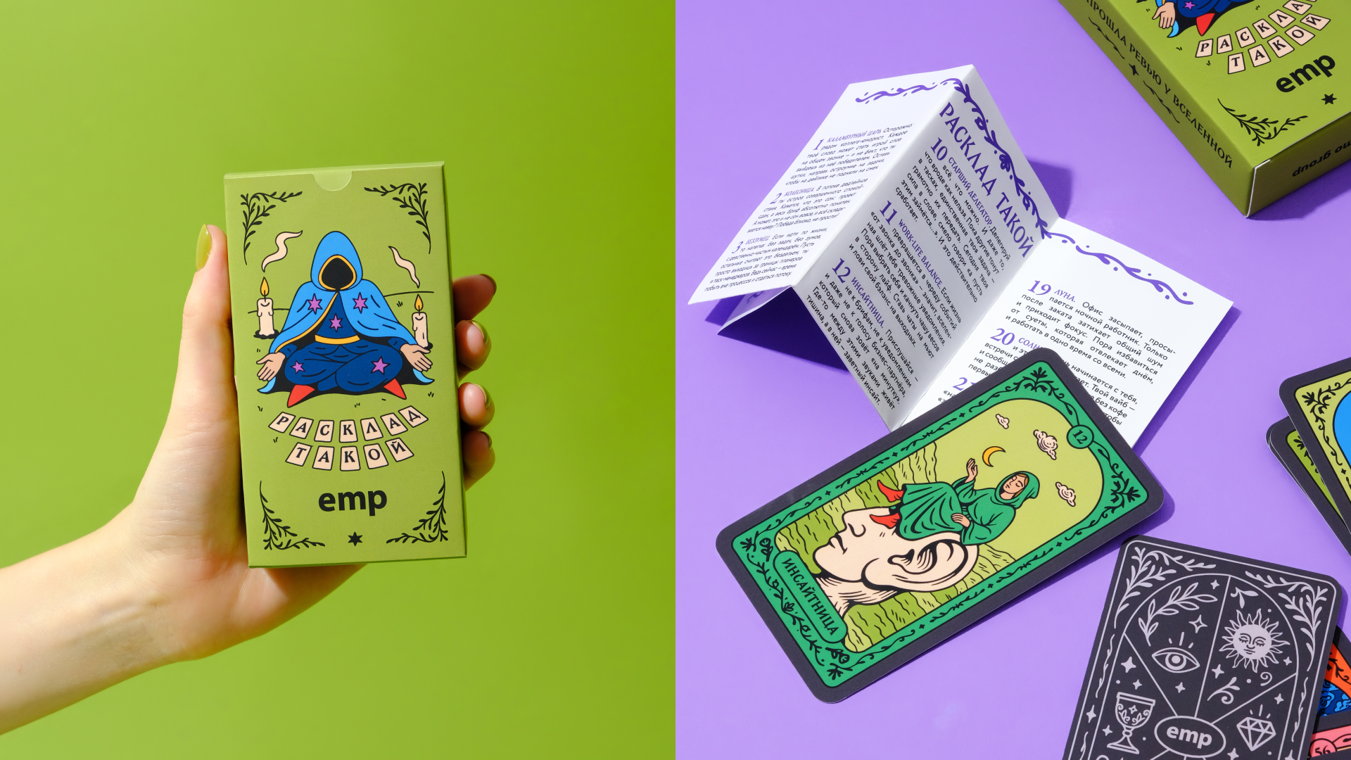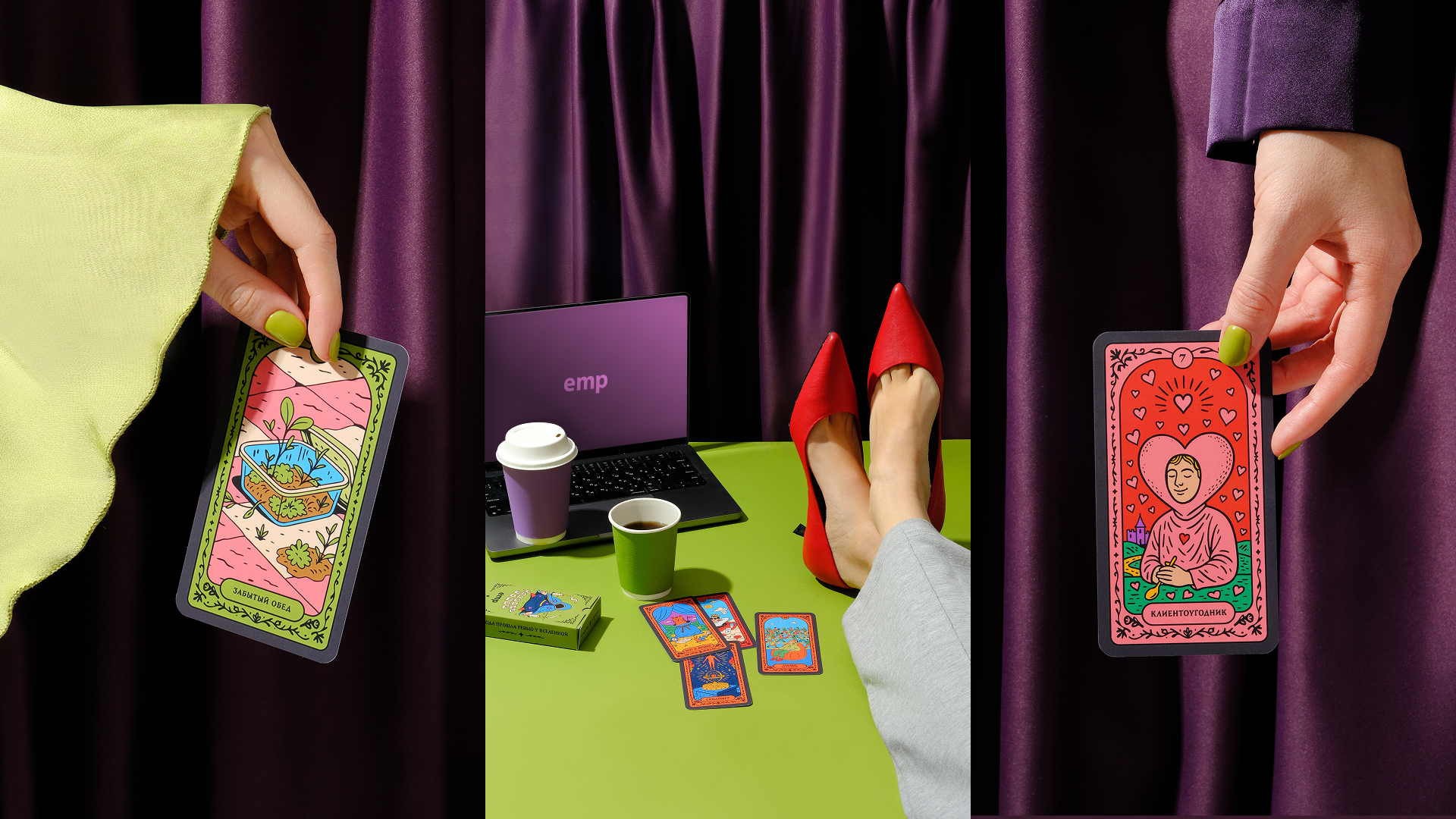 EMP помогает компаниям расти: масштабирует команды под задачи клиентов, автоматизирует рутину своими разработками и подключает людей в проект за полторы недели. Для них мы придумали мерч, который будет говорить не корпоративным жаргоном, а шуткой и метафорой. Это колода карт про офисную реальность.