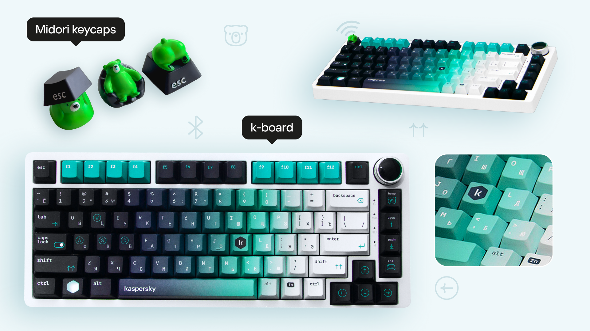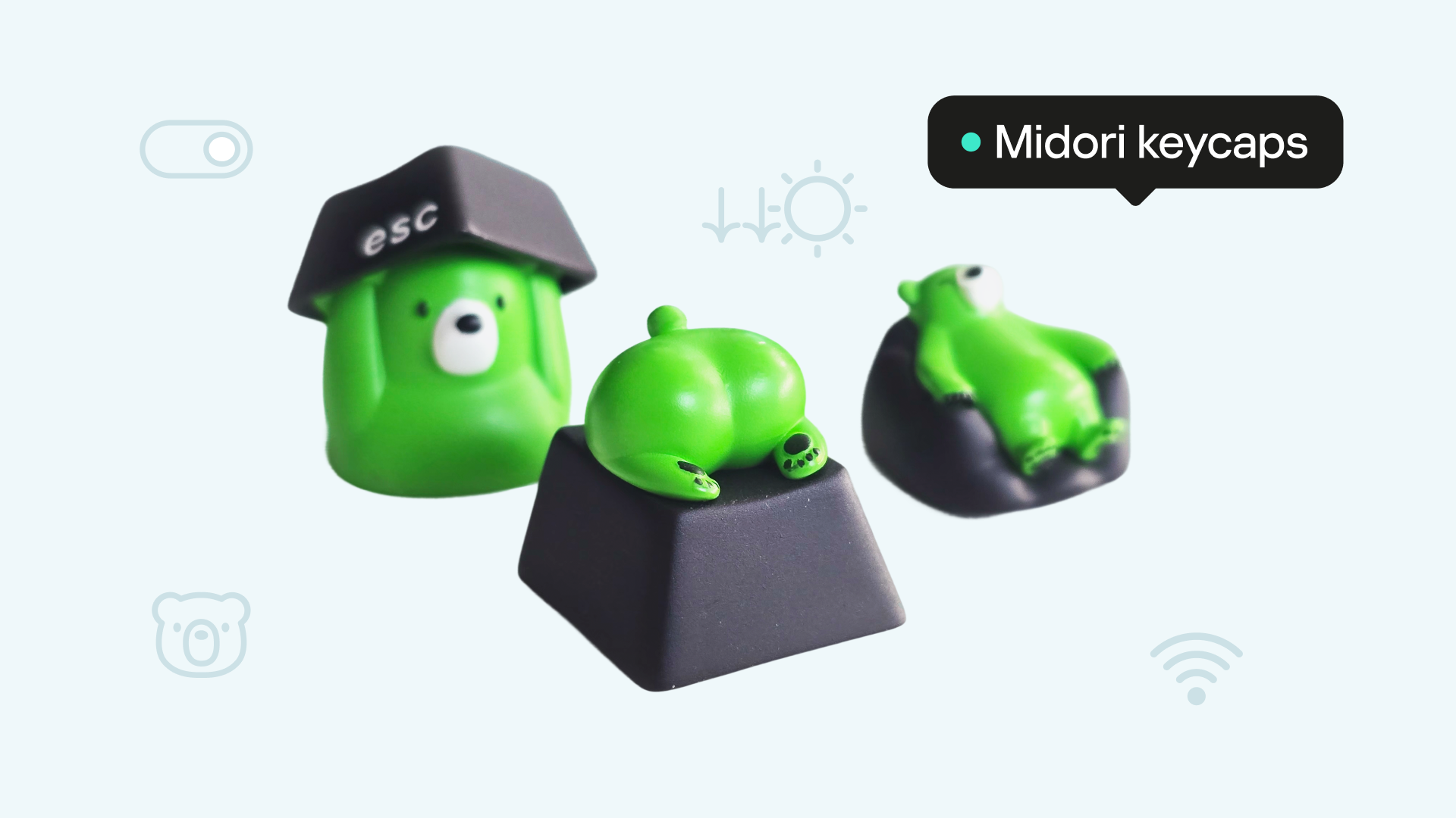 - Клавиатура с кастомными кейкапами с нашим маскотом Мидори Кума и дополнительными контролами.