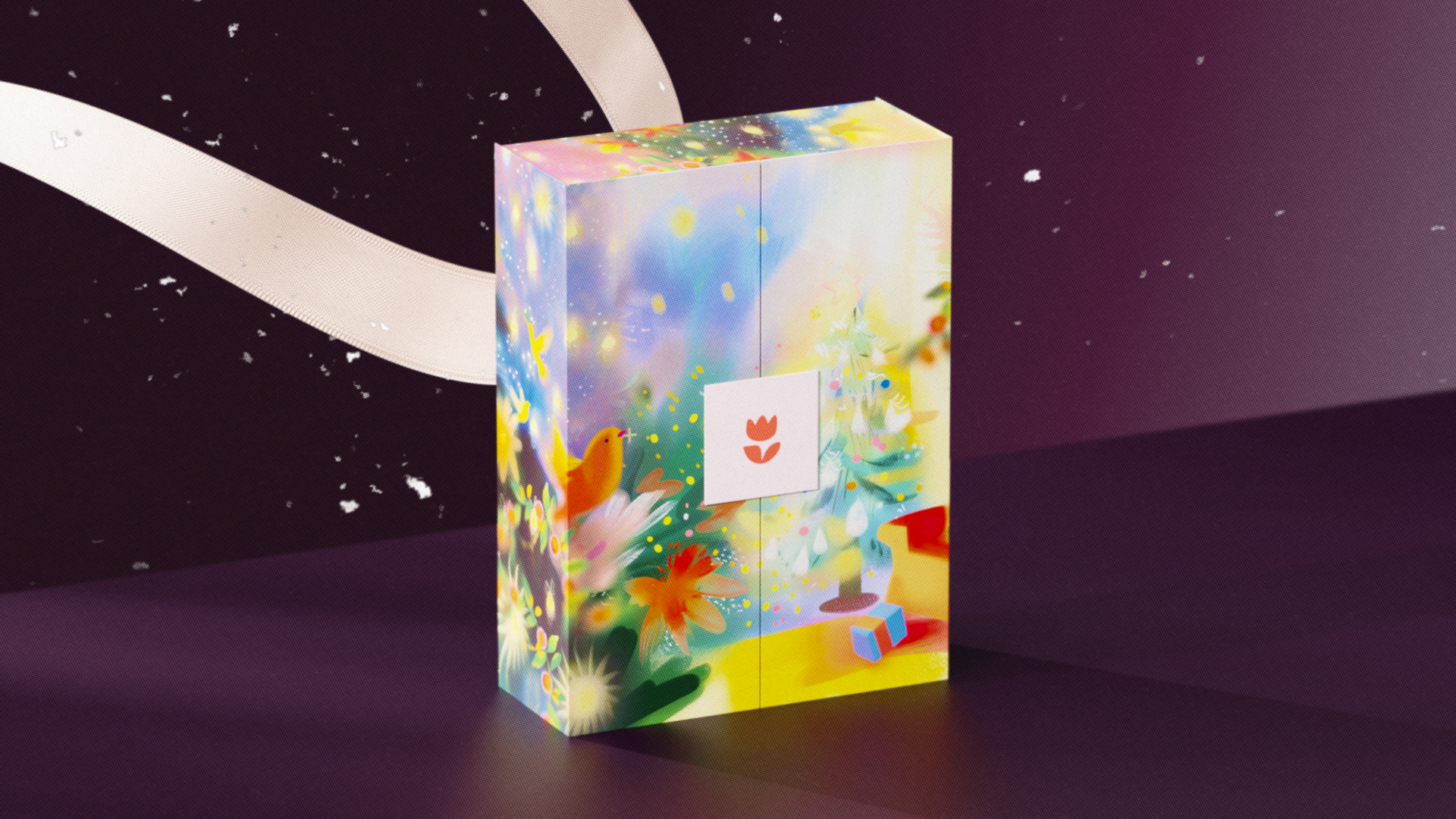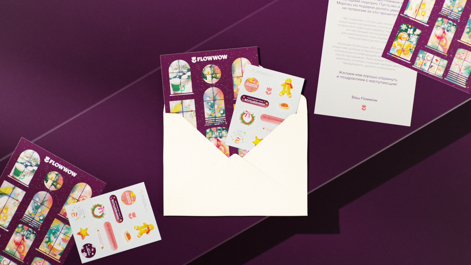 Миры Flowwow — уникальная визуальная вселенная, сгенерированная искусственным интеллектом и доработанная дизайн-командой, — стала ядром оформления. В дополнение к подарку шли брендированная открытка и стикерпак с забавными фразами и поздравлениями.
