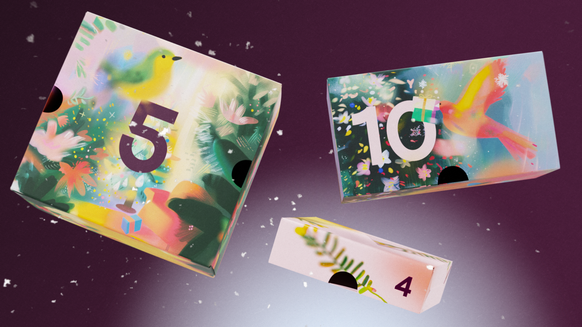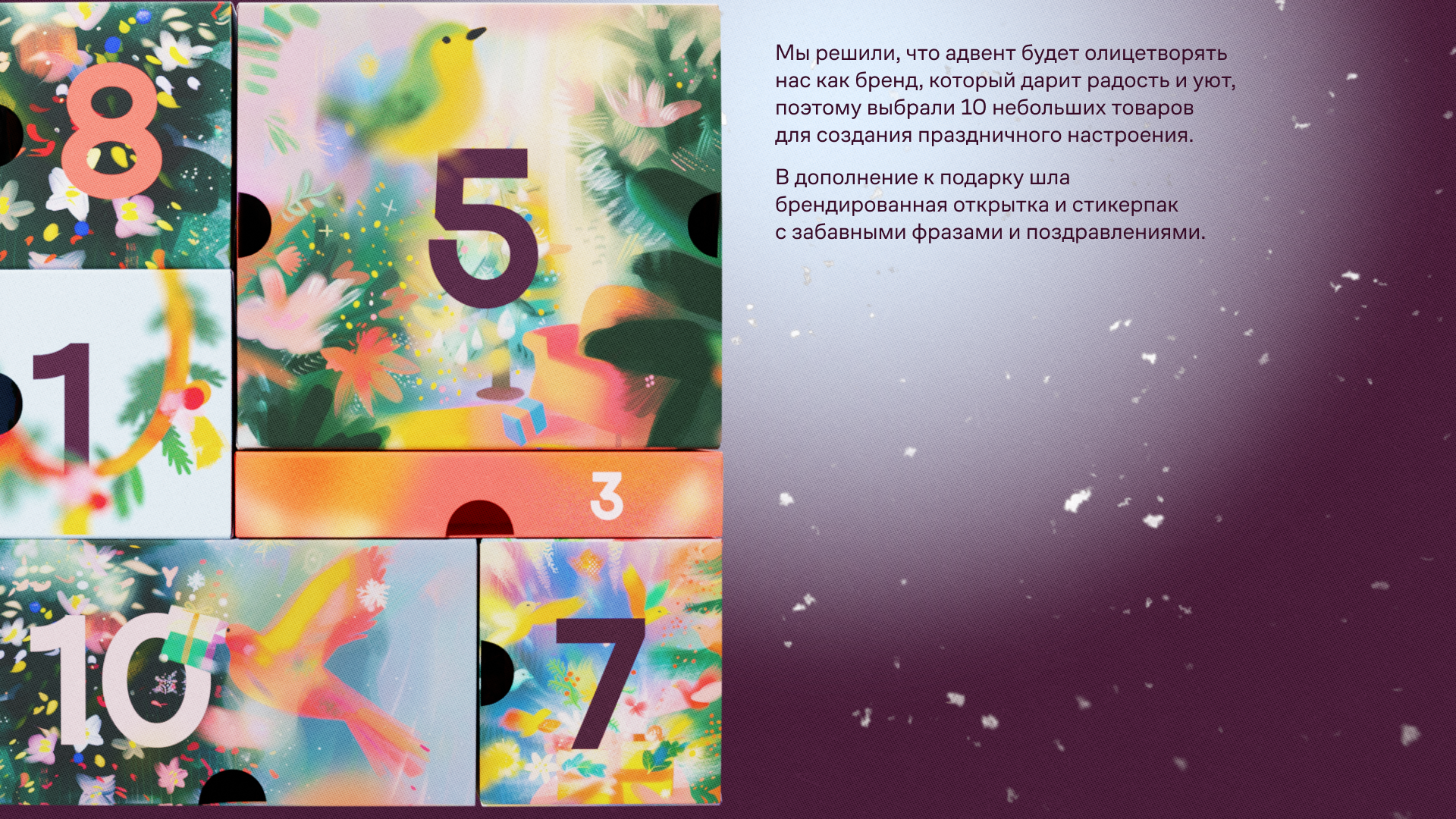 Для реализации была выбрана идея с адвент-календарем. Это решение позволило нам увеличить количество касаний пользователей с новой айдентикой, так как адвент открывался в течение 10 дней перед Новым годом. Окошки календаря работали по принципу дверей в мир подарков, а внутри было 10 небольших сюрпризов для создания новогоднего настроения.
