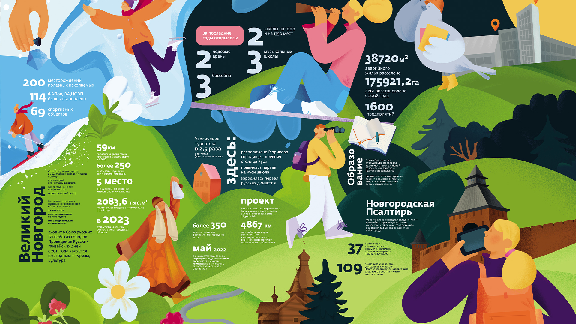 Мы начали с глубокого исследования, какие смыслы хранит регион. Однако на новгородской земле сосредоточено такое количество символов, что их не получилось уместить в один дизайн-макет. Тогда пришли с идеей: создать авторскую иллюстрацию из 30+ самых ярких образов (крестецкая строчка, валдайский колокольчик, театральный петрушка и т.д.).