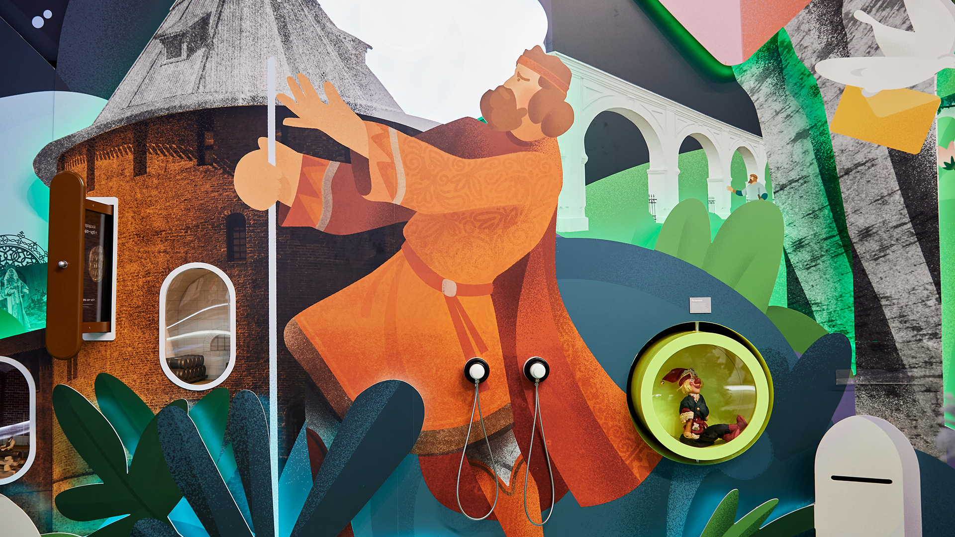 Продумали множество интерактивов, чтобы погрузить гостей в путешествие по региону. Например, найти берестяные грамоты и разгадать задания, позвонить в валдайский колокольчик или рассмотреть настоящего театрального петрушку, которого привезли в Москву прямиком из Великого Новгорода.