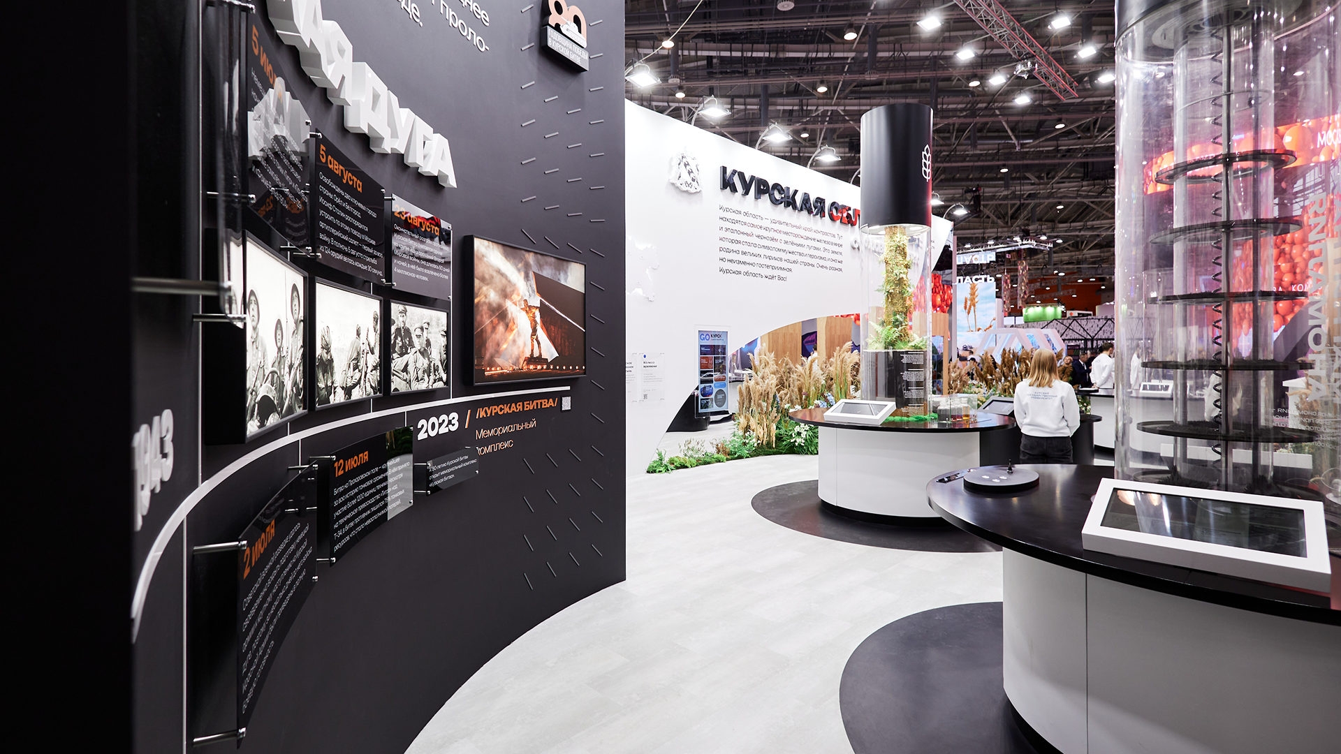 1) Брутально-технологичная зона с достижениями промышленности, энергетики и агрокомплекса, VR-экскурсиями по производствам. В этой части создали сложные экспериментальные объекты «Магнитная аномалия» и «Мирный атом» и обеспечивали, чтобы они работали бесперебойно при большой нагрузке. В оформлении использовали металл и бетон.