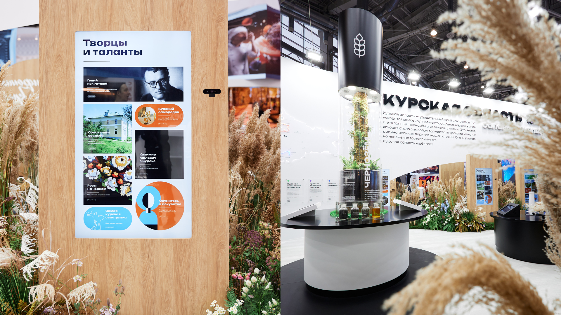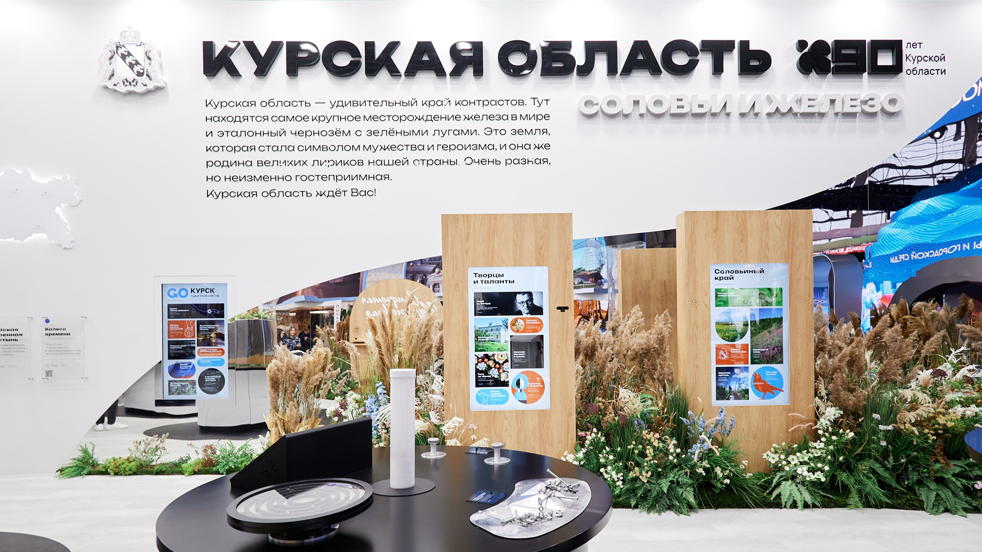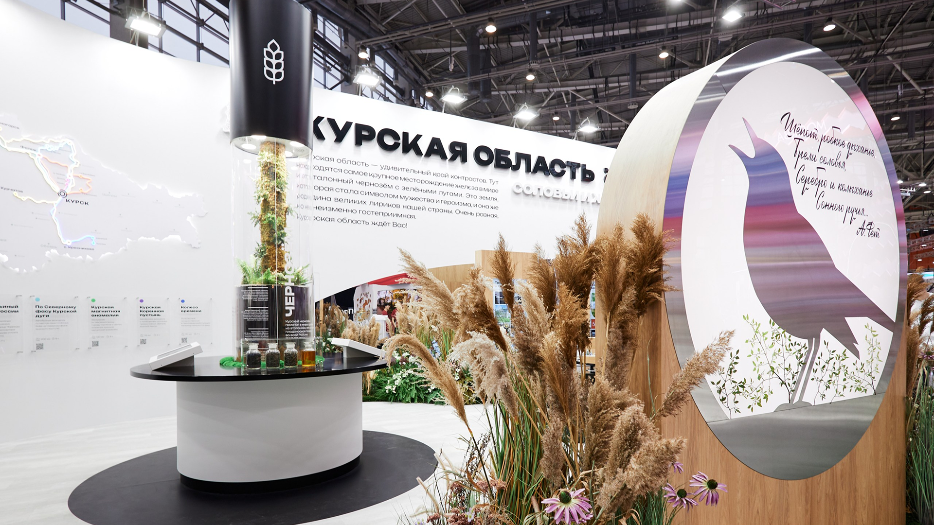 2) Лиричная зона, полная растений и светлых поэтичных образов, рассказывающих о природе, сельском хозяйстве, культуре и туризме в Курской области. Тут была экспозиция «Ароматы Курского края», аудиоигра «Соловьиный край», карта турмаршрутов, экспонат «Чернозем». В фитодизайне использовались растения региона.