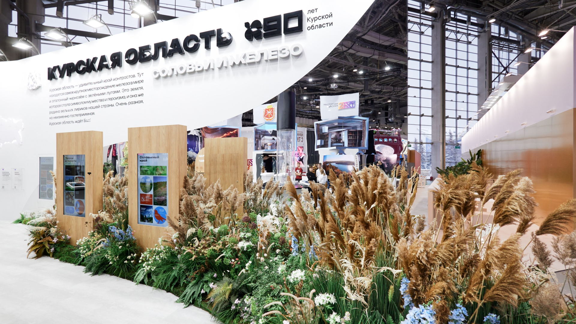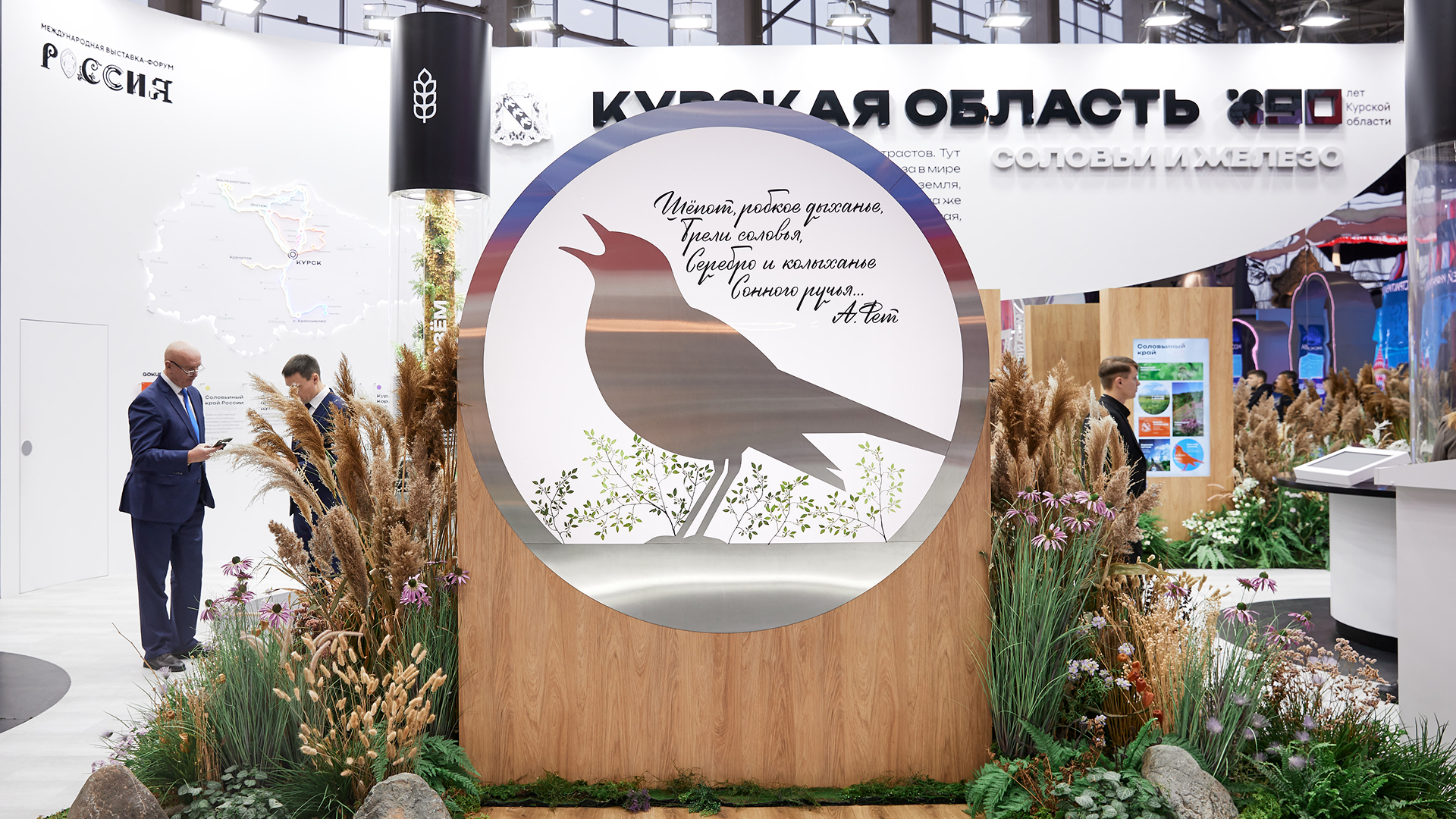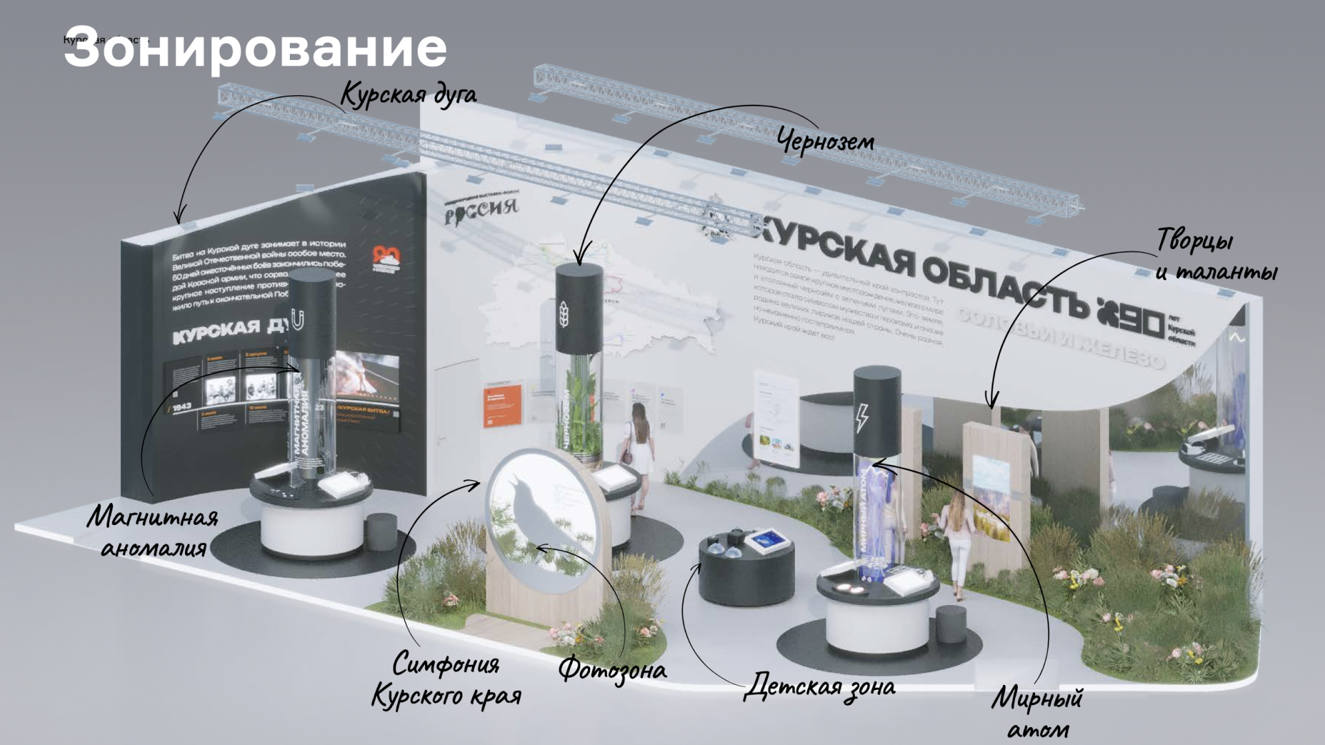 2) Лиричная зона, полная растений и светлых поэтичных образов, рассказывающих о природе, сельском хозяйстве, культуре и туризме в Курской области. Тут была экспозиция «Ароматы Курского края», аудиоигра «Соловьиный край», карта турмаршрутов, экспонат «Чернозем». В фитодизайне использовались растения региона.