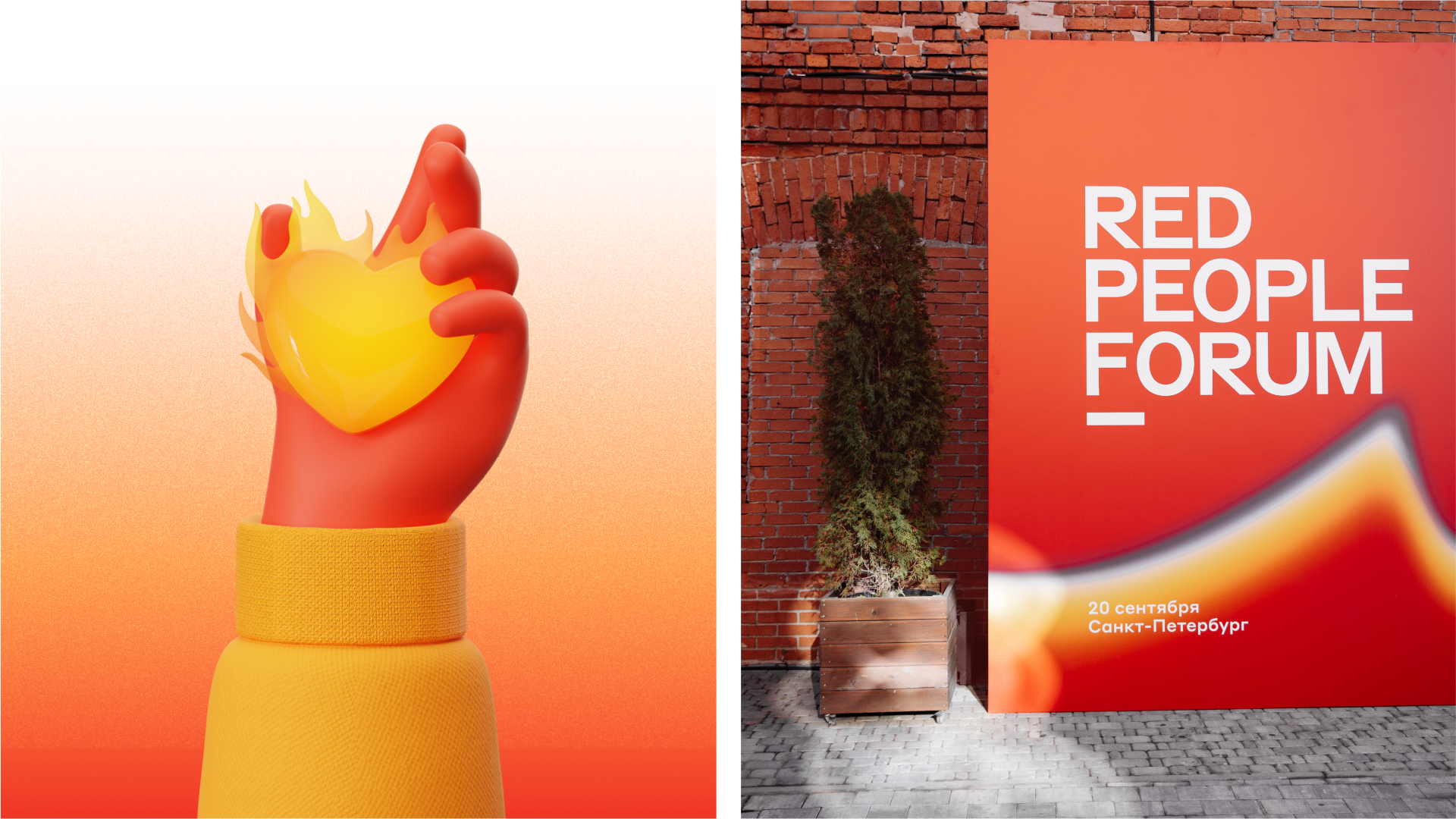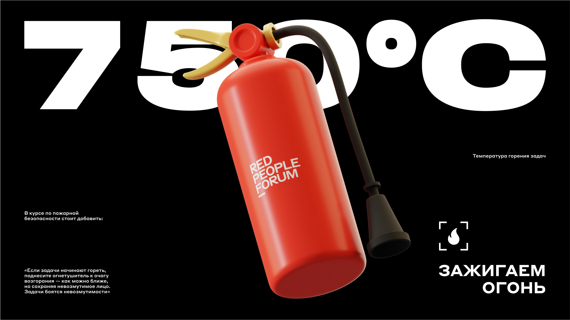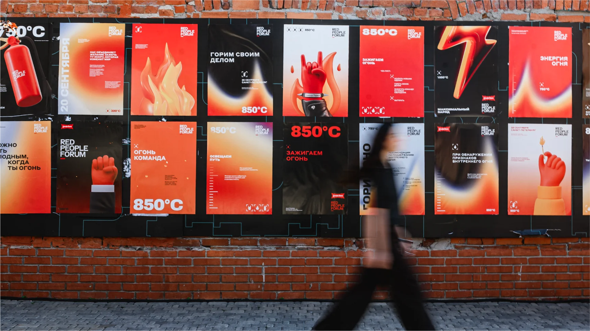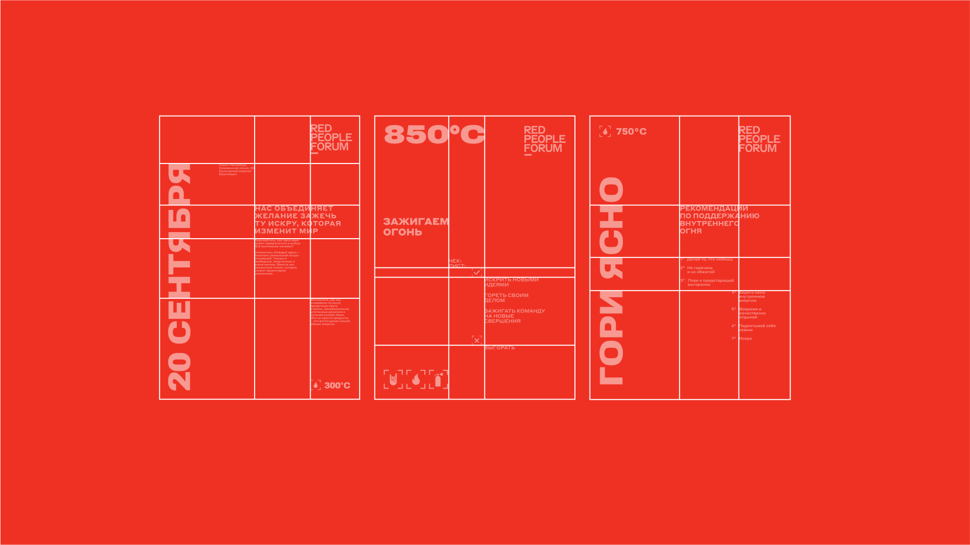 Основой стиля стал огонь — символ драйва и внутренней силы. Мы выстроили визуальную систему вокруг идеи «градусов»: как спичка разгорается от 350° до 850°, так и форум постепенно набирал эмоциональную температуру. Днём использовались яркие красные градиенты, вечером — глубокая тёмная палитра, на фоне которой пламя и искры смотрелись ещё эффектнее.