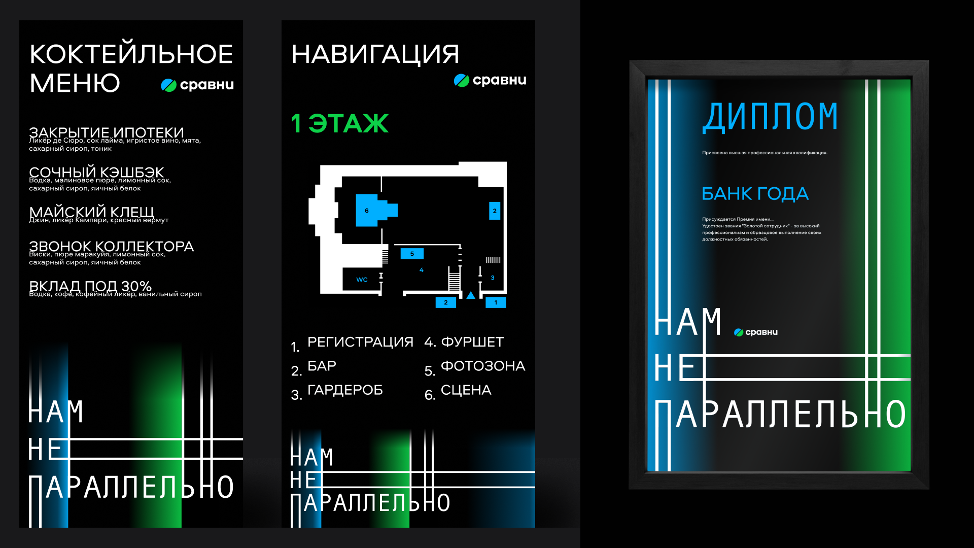 Фраза «Нам не параллельно» стала центральным элементом концепции, который отражает позицию Сравни: маркетплейса, которому не всё равно, каким будет финансовый и страховой рынок. Это подчеркнуло дерзкий характер бренда и его понимание рынка, а значит, способность видеть и награждать только сильнейших.
