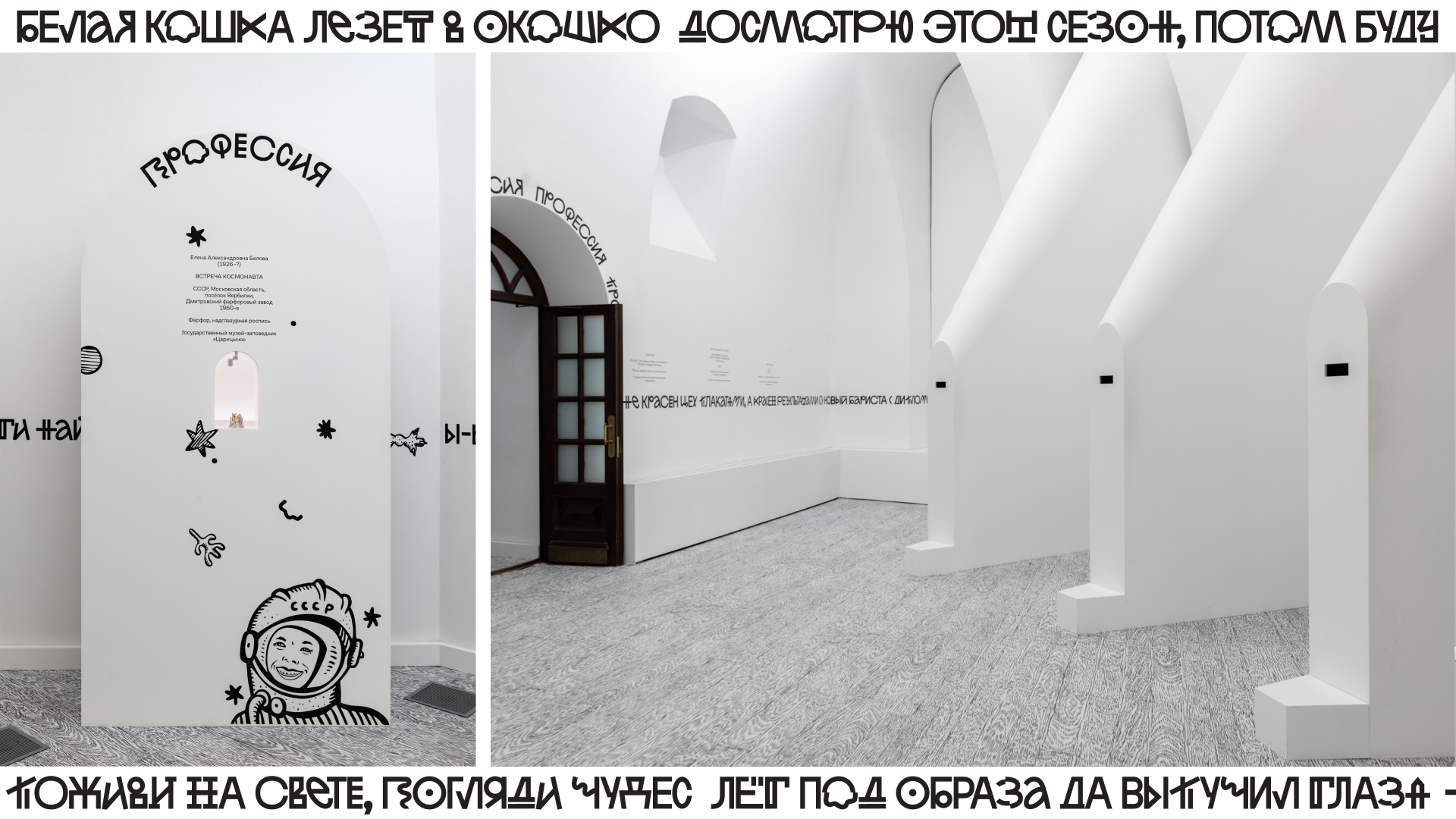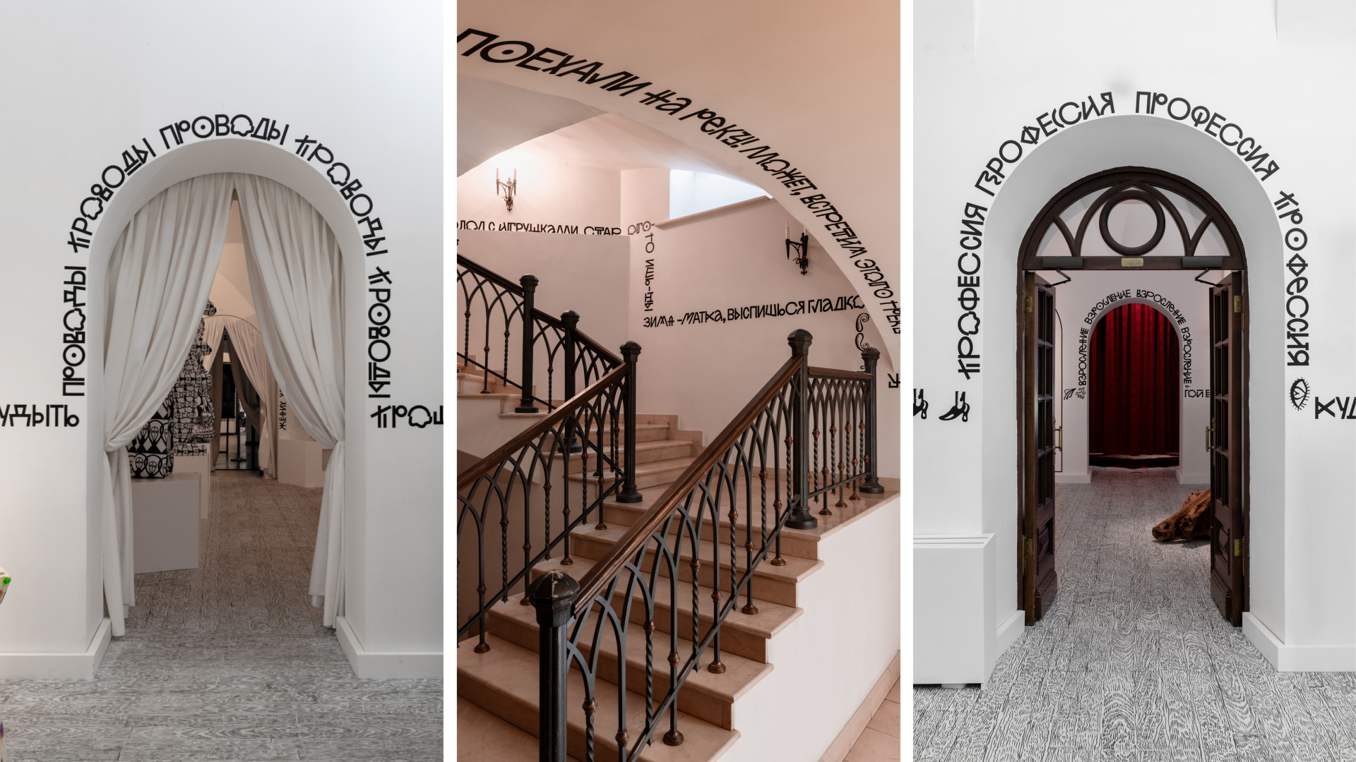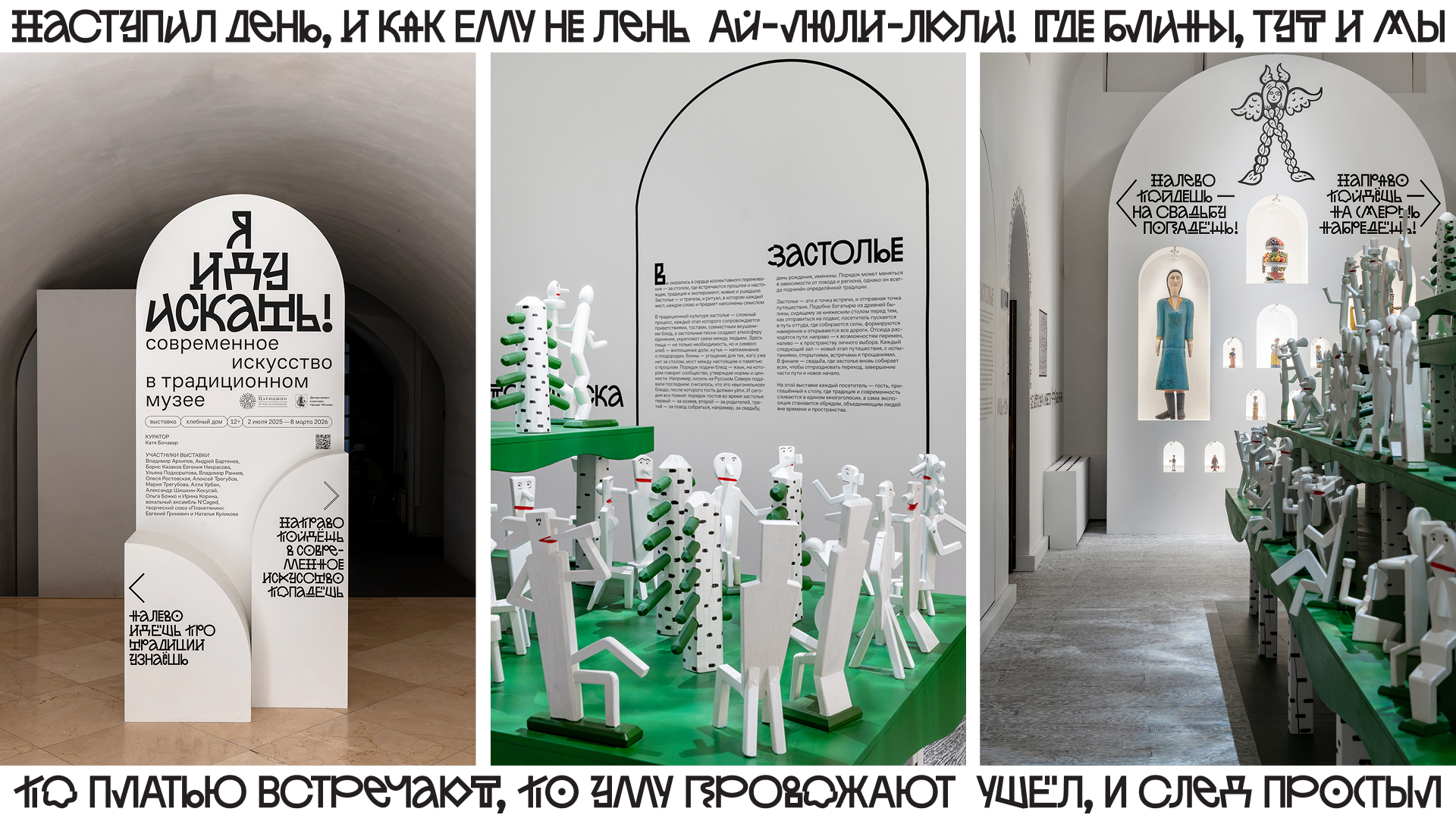 Графическое оформление выставки «Я иду искать! Современное искусство в традиционном музее» для Хлебного дома Музея-заповедника «Царицыно». Куратор Катя Бочавар. Выставка представляет личный взгляд современных художников на переходные этапы жизни человека. Это актуальное антропологическое исследование в формате тотальной инсталляции.