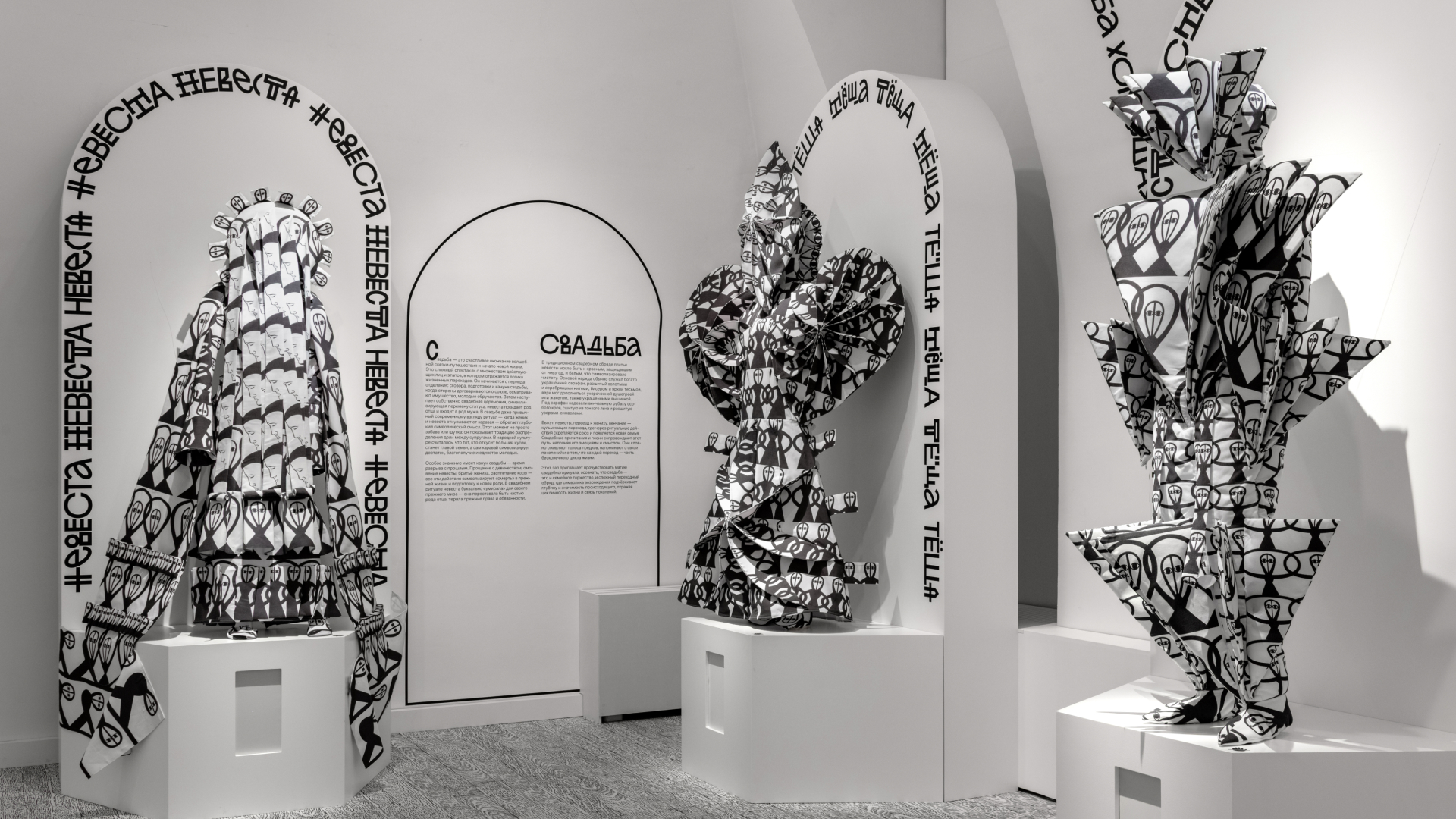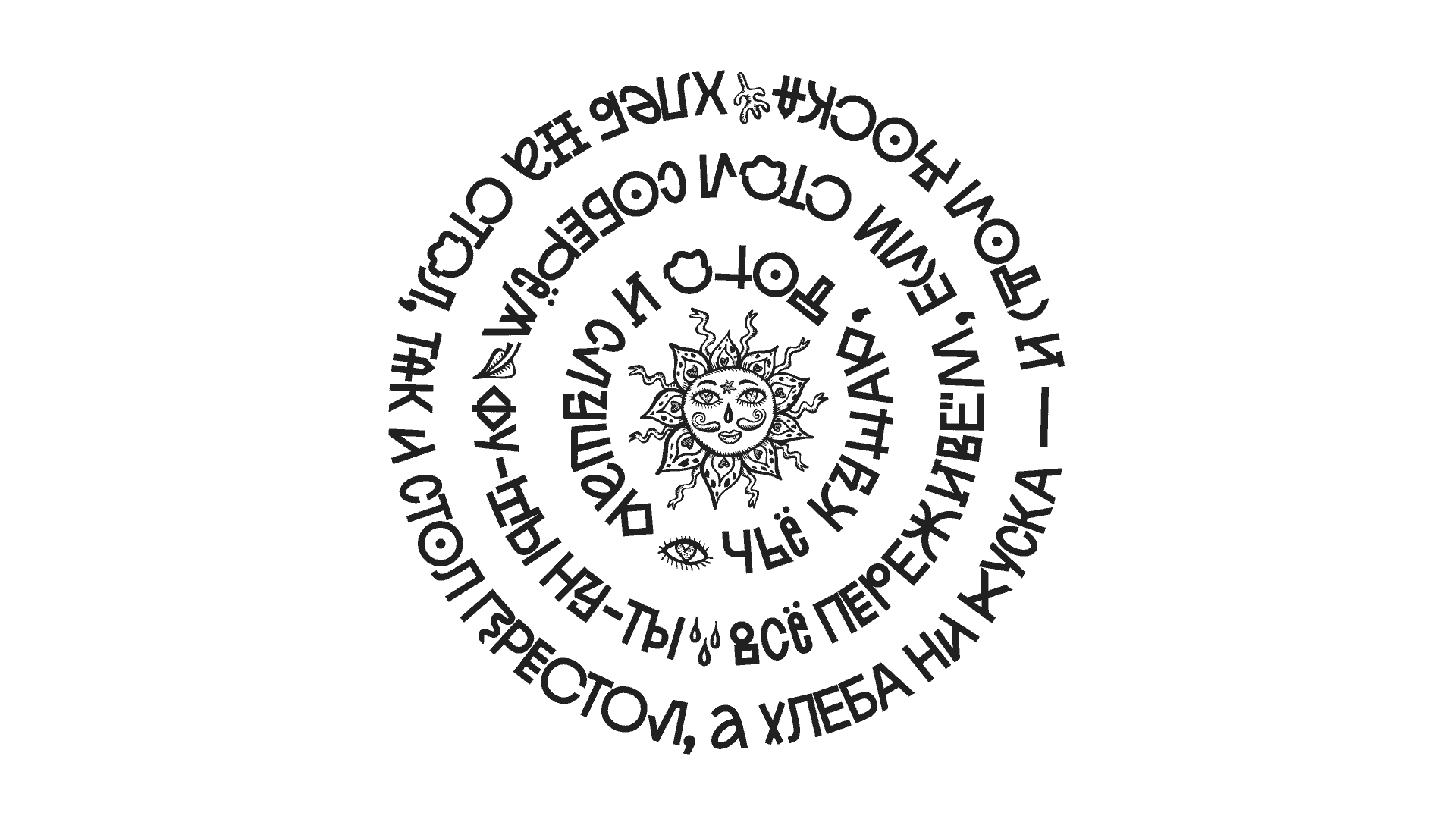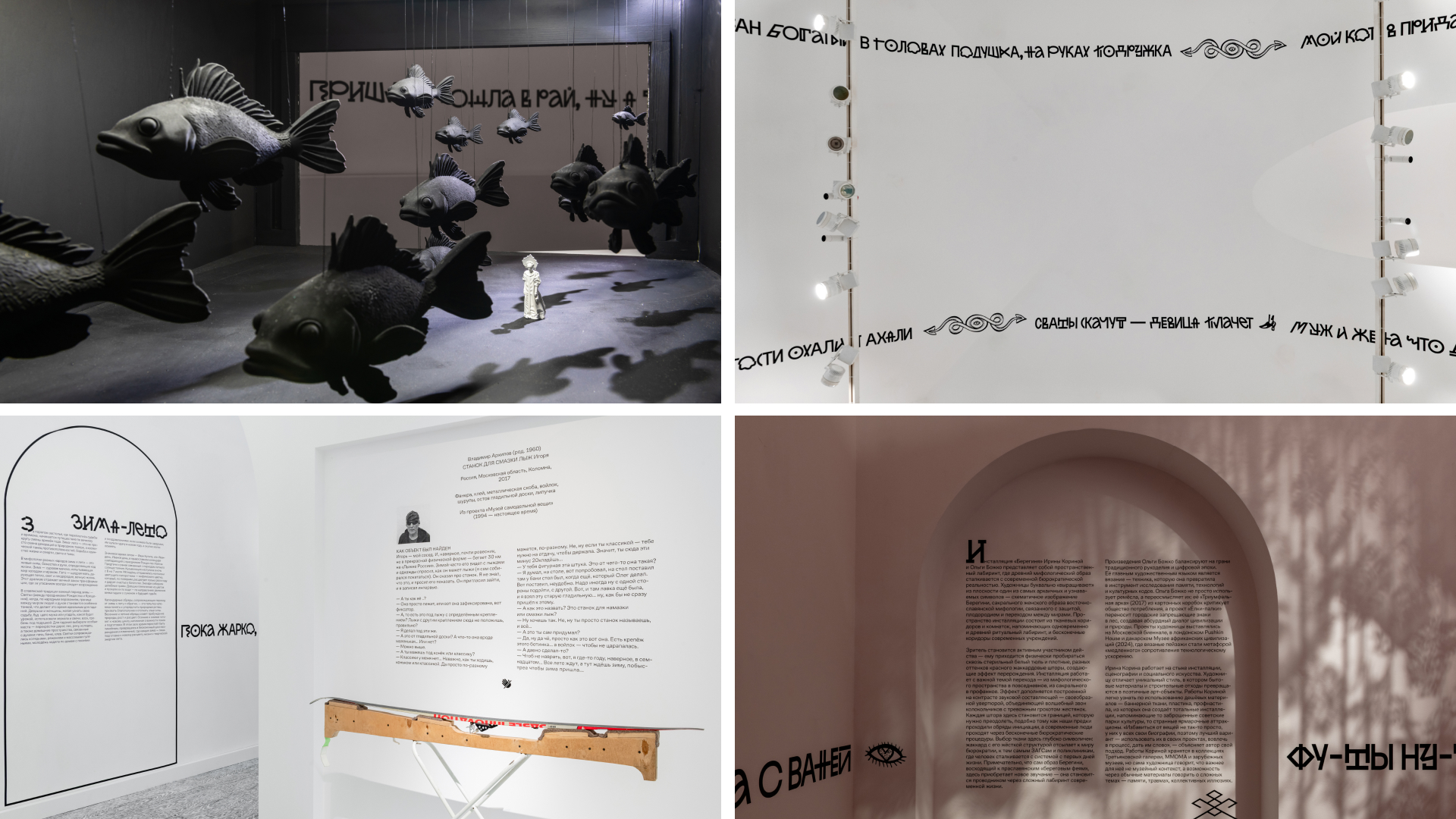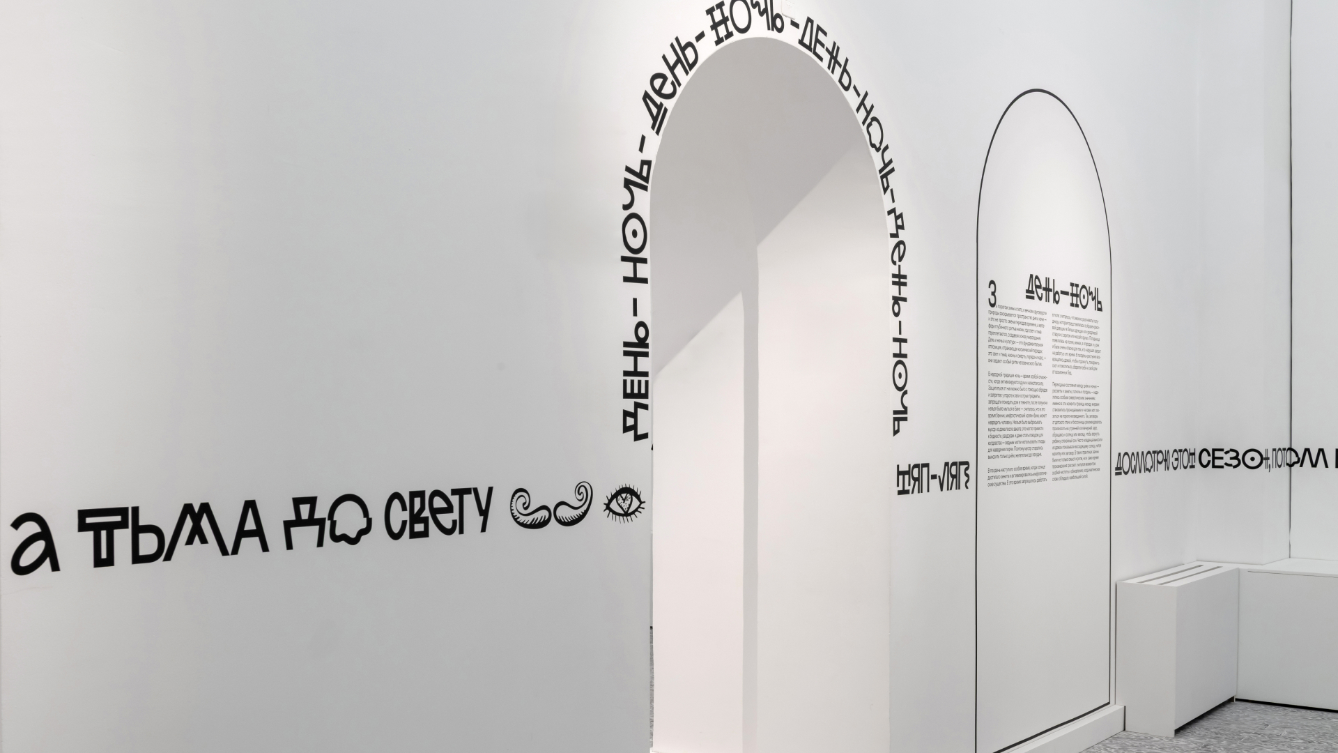 Для проекта был разработан ироничный шрифт (основной набор знаков и два набора альтернатив). Типографика полностью опоясывает 10 залов экспозиции бесконечной строкой из пословиц (старинных и современных авторства Евгении Некрасовой), типографике подыгрывают рисунки художницы Ульяны Подкорытовой. Графика активно взаимодействует с архитектурой пространства.