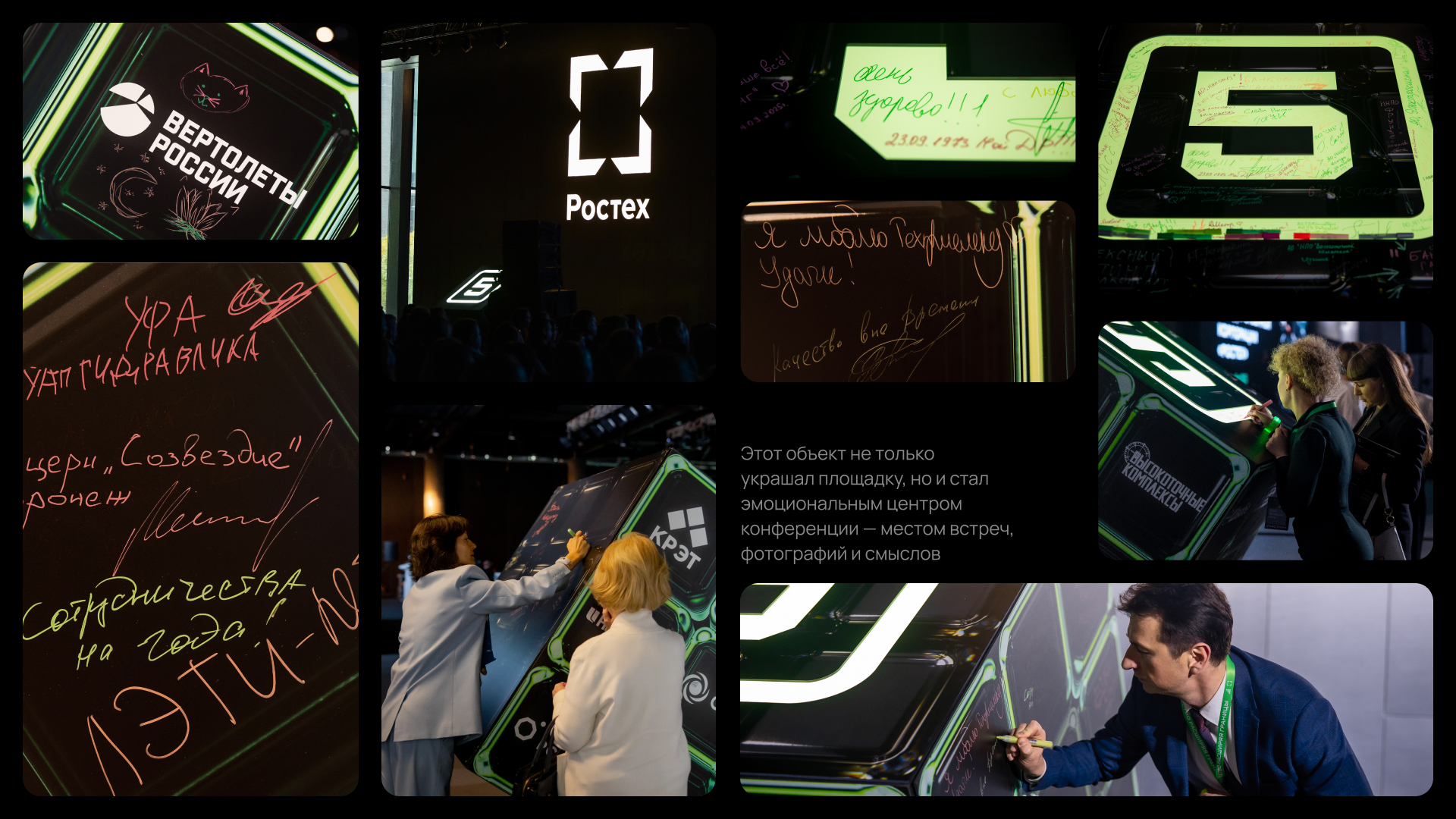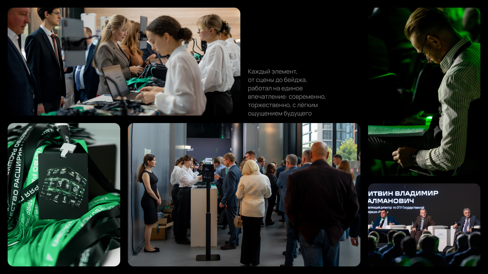 Айдентика охватывает всю коммуникацию конференции: сцену, навигацию, печатные материалы и арт-объекты. Каждый элемент — от бейджа до оформления зала — работает на единое впечатление: торжественно, современно, технологично, смело смотря в будущее.