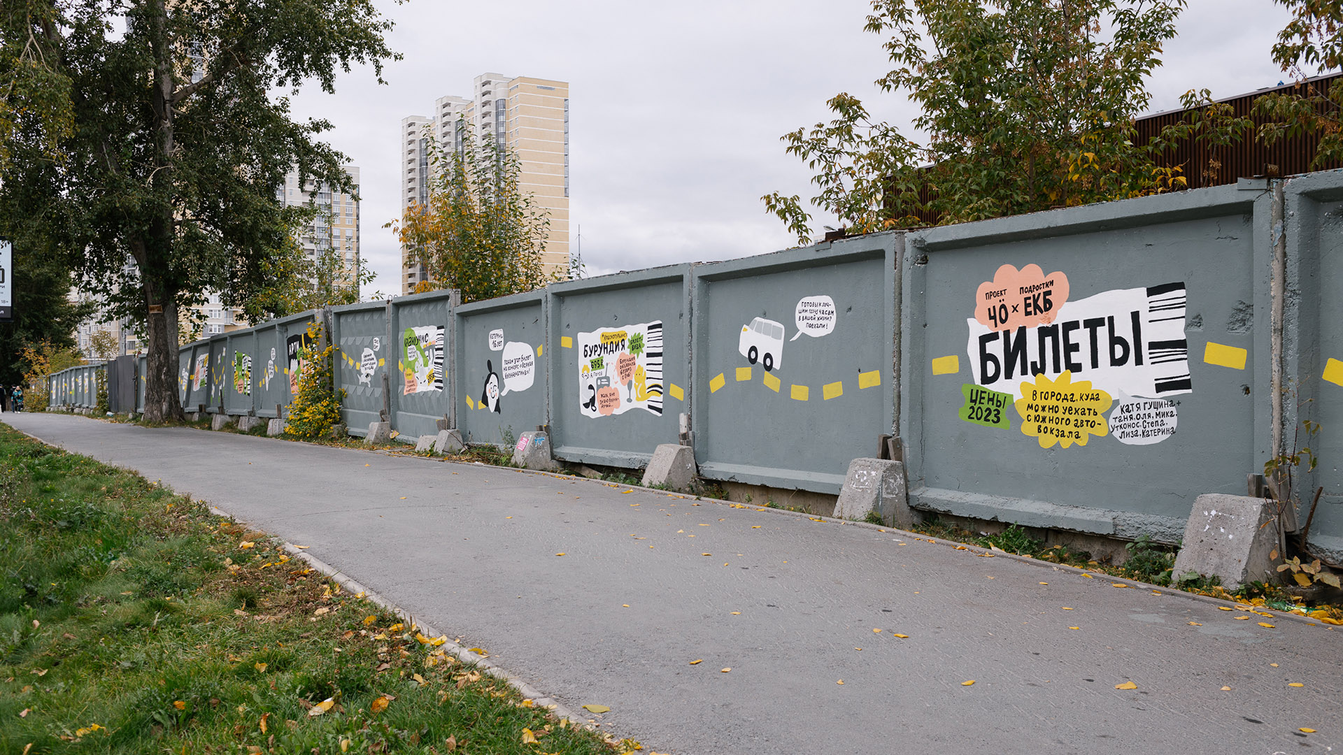 «Билеты» в малые города и села Свердловской области появились на заборе рядом с Южным автовокзалом от паблик-арт-программы «ЧО» при поддержке уральского холдинга «Атом». Художница Катя Гущина вместе с подростками Екатеринбурга собрала локальные сюжеты и захватывающие истории, а горожане помогали расписать огромный бетонный забор.