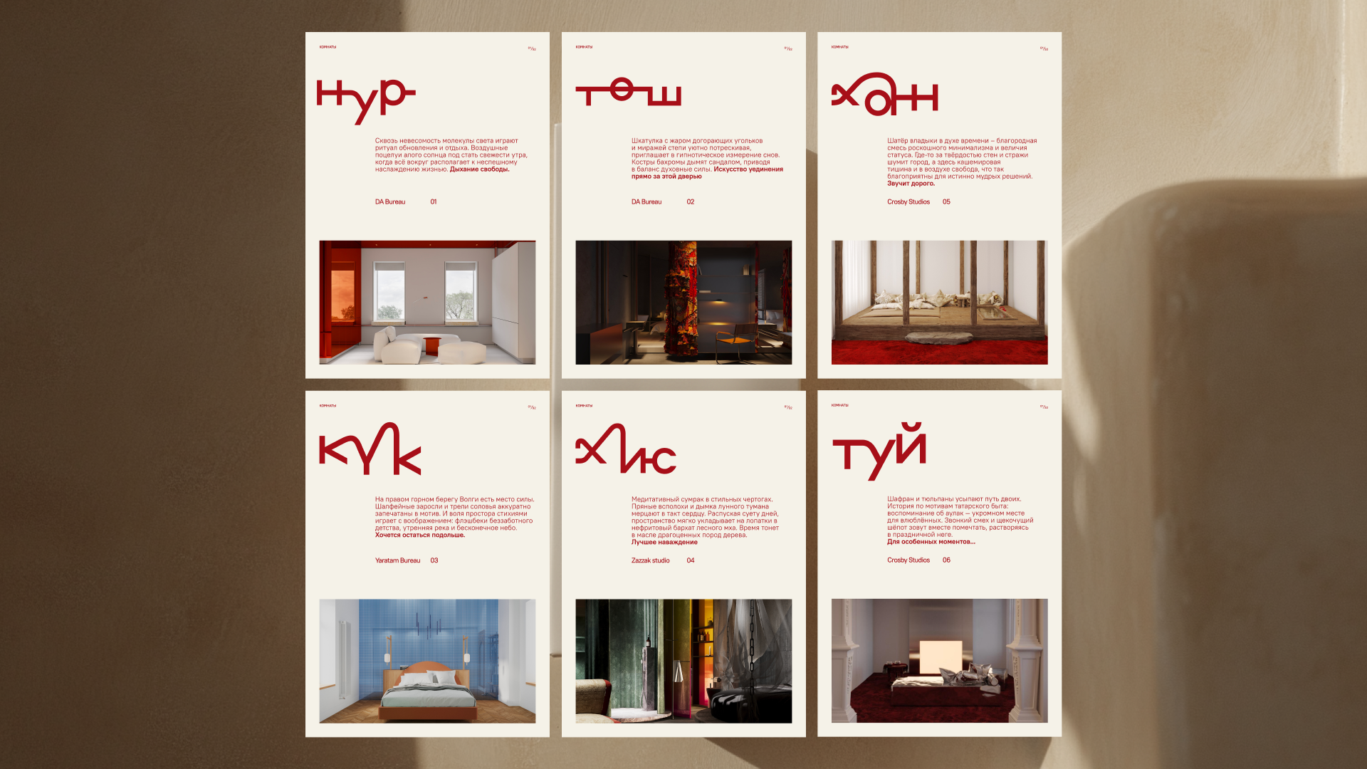 Шрифт используется как голос отеля — им будут набраны все заголовки и названия номеров на татарском (Төш, Хис, Нур и др.), каждое из которых выглядит как самостоятельный леттеринг.