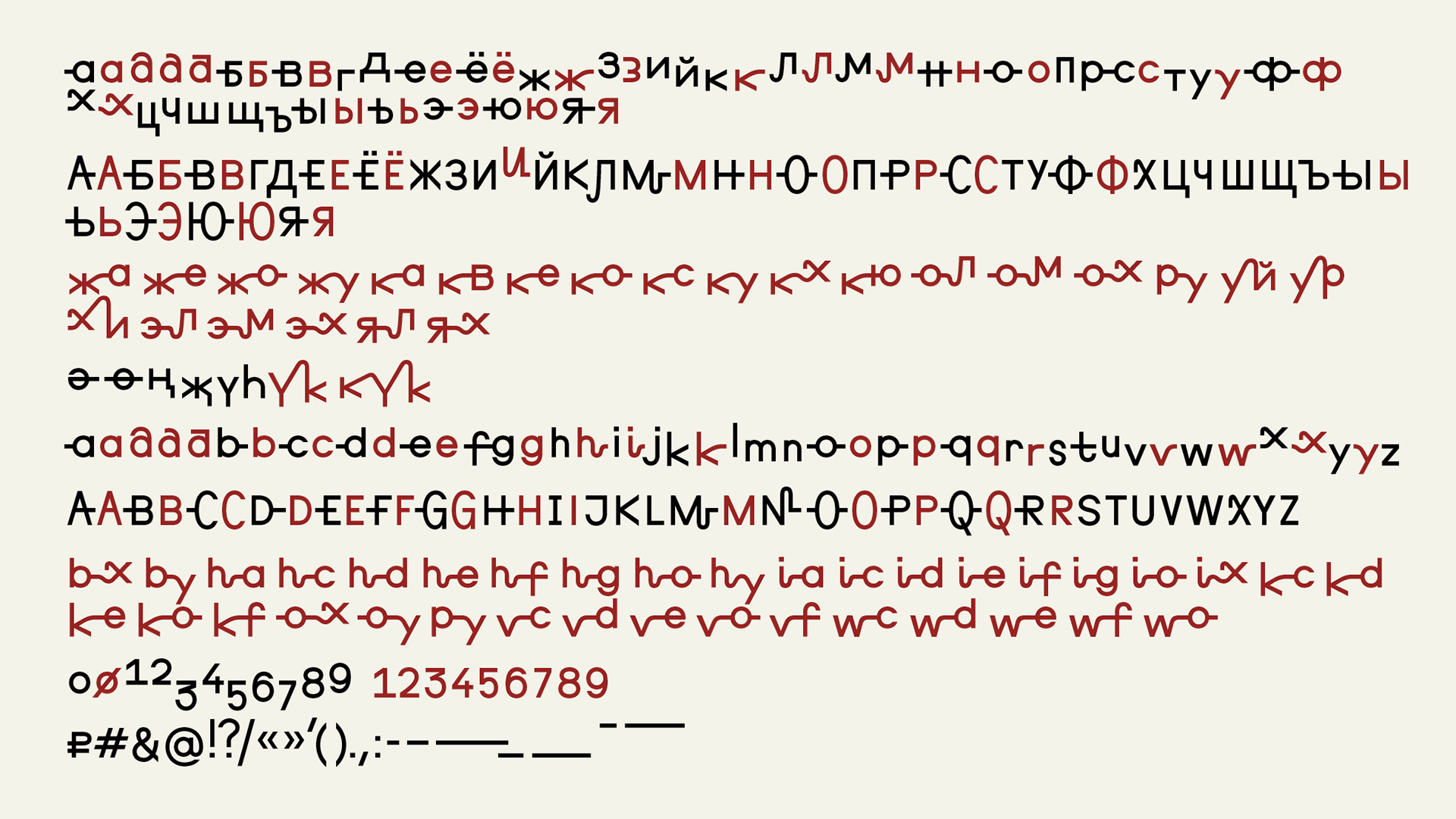 В процессе разработки мы адаптировали систему соединений для кириллицы, латиницы и татарского языка. В шрифте реализовано 66 лигатур, благодаря чему он живёт как каллиграфия — постоянно меняя ритм и характер. Набор при этом полностью автоматизирован: в стилевых сетах можно выбрать, как именно соединяются буквы — без ручных правок и лишних действий. Соединительная линия проходит по верхнему или нижнему краю, создавая плавающий базлайн и эффект письма, нанизанного на нить.