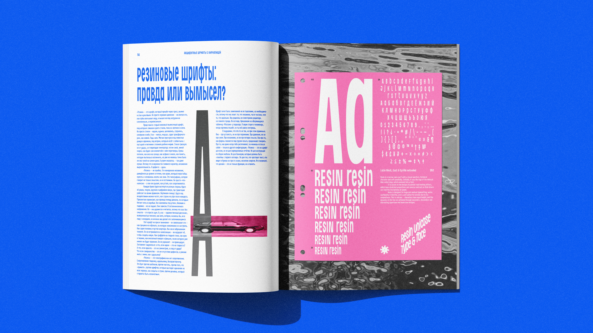 Resin — это узкий закрытый гротеск с техническим характером и мягкой пластикой. Шрифт развился во время работы над логотипом для питерской мастерской по прокату велосипедов Velocult. В его основе лежит принцип растягивания букв как в горизонтальной дорожной разметке, которая имеет вытянутые пропорции и обратный контраст для того, чтобы под углом и на скорости буквы считывались как «нормальные». Намеренное искажение придает ощущение, что что-то не так, но при этом не сразу понятно что именно. Resin рассчитан на крупный и средний набор, уверенно работает в айдентике, благодаря компактности хорошо подходит для сторис. Прописные и строчные знаки имеют равную высоту, а динамика в строке создается за счет выносных элементов и чередования конструкций прописных и строчных.