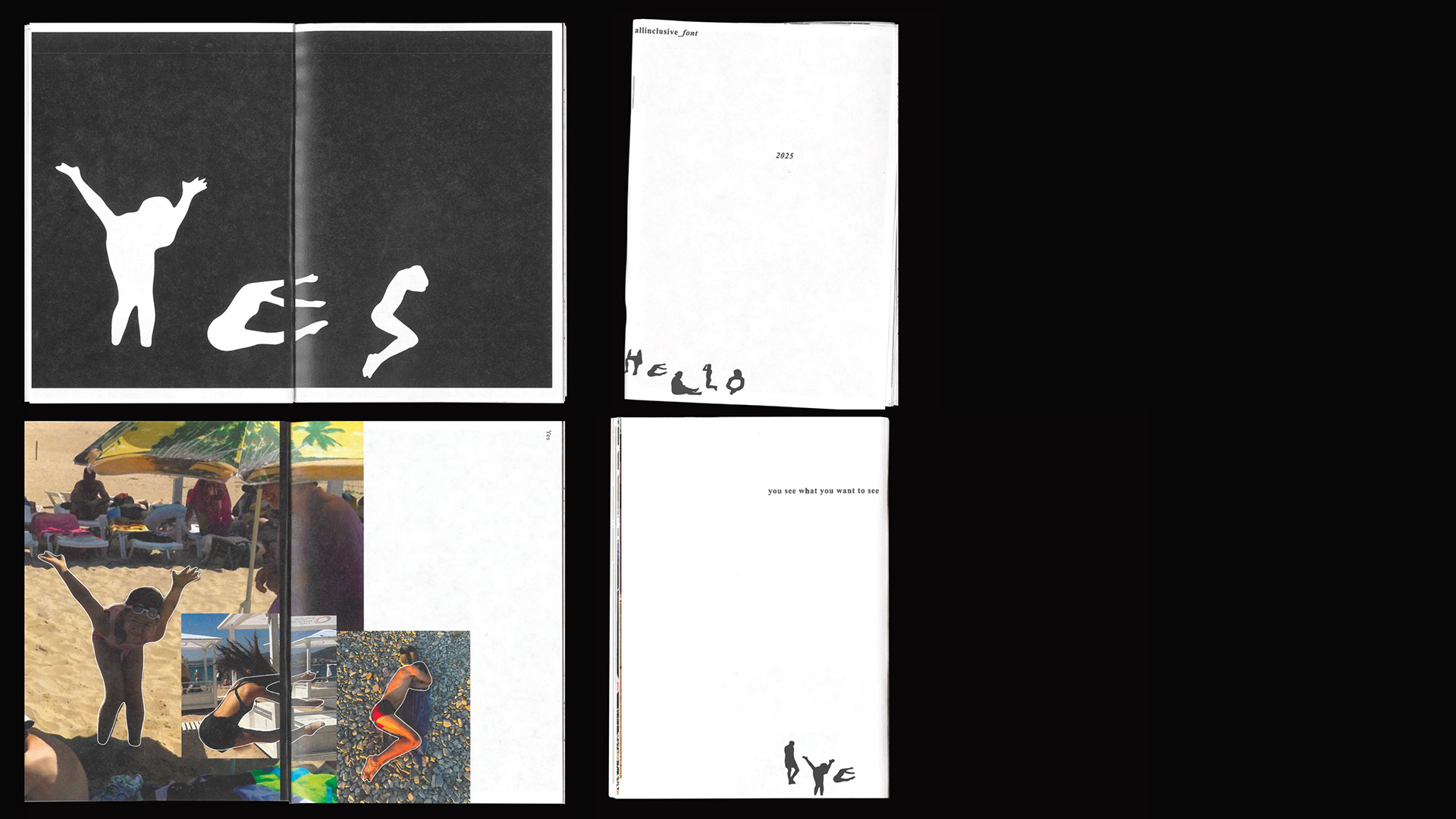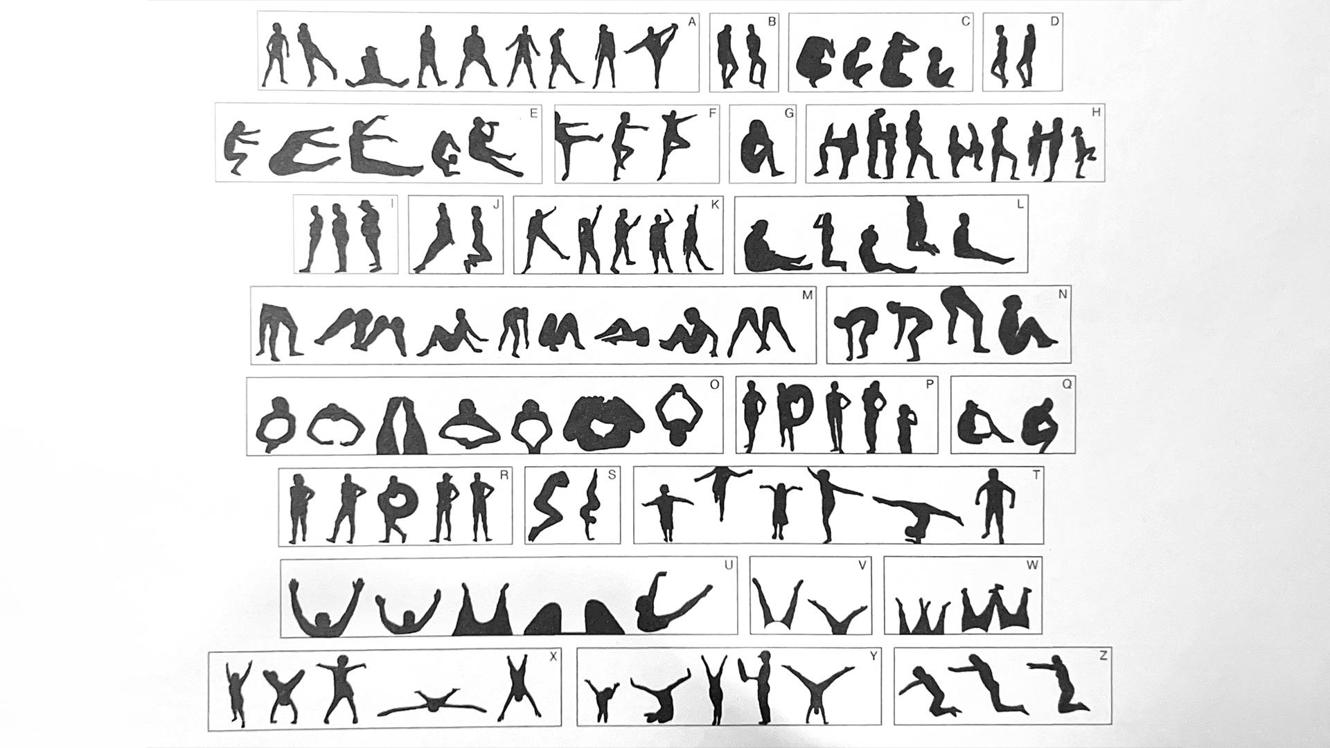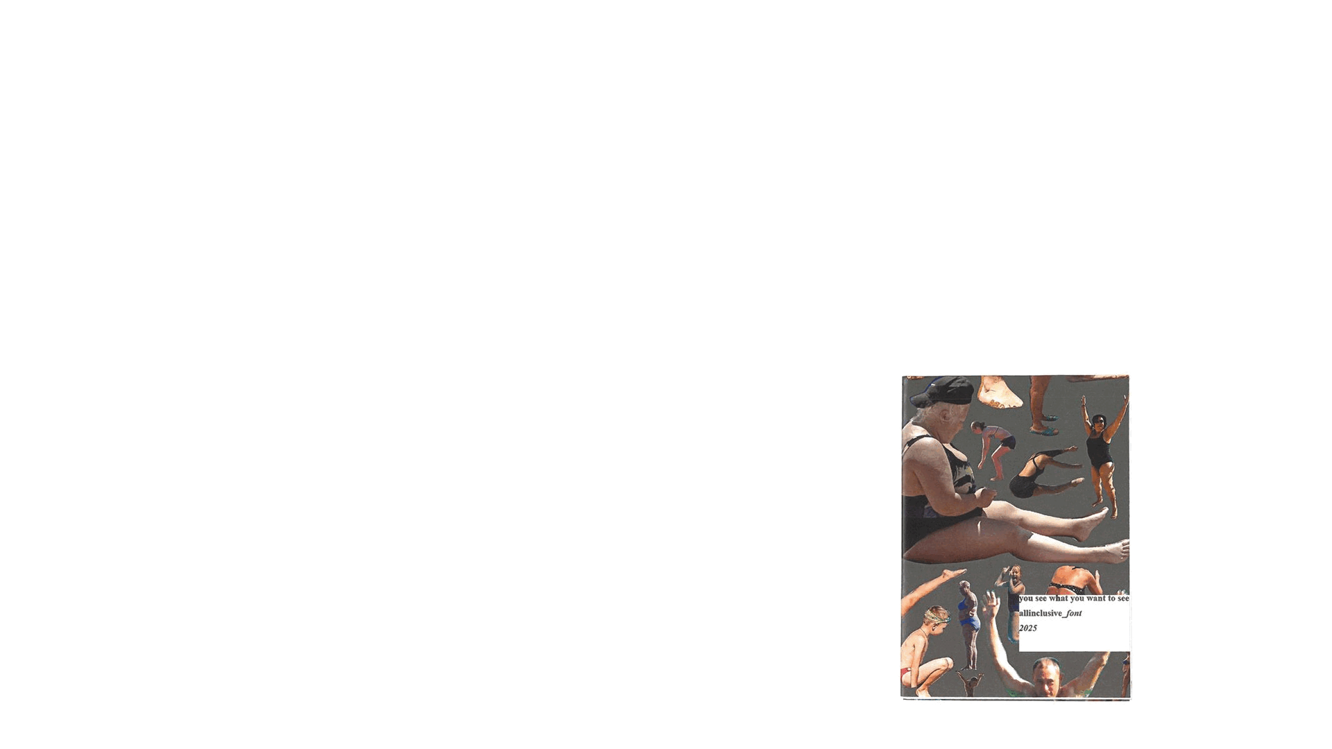 Проект начался за наблюдением и фотографированием случайных людей на пляже: стоящих, лежащих, купающихся и загорающих. Было обнаружено, что в их естественной, ничем не скованной пластике, в их спонтанных жестах и позах, можно прочесть буквы. Случайные тела превращаются в носителей сообщения, которое исходит от множества людей. Так, шаг за шагом возник целый алфавит, не шрифт в традиционном смысле, а скорее архив случайностей, где каждый момент — это уже готовый фрагмент языка, скрытый в повседневности. Многие буквы имеют несколько вариаций, отражая разнообразие тел и множественность форм, в которых язык может проявляться.