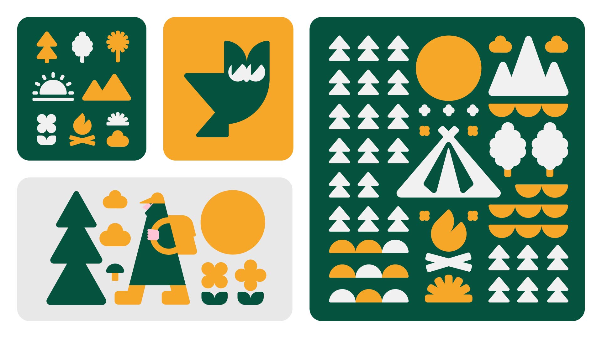 Логотип и пластика букв модульного логотипа строится на основе образа флага, который символизирует открытие новых локаций и мест на карте. В айдентике геометричные паттерны поддерживают отсылку к флажкам и становятся основной для брендирования части продукции, а также развиваются в систему модульных иллюстраций.
