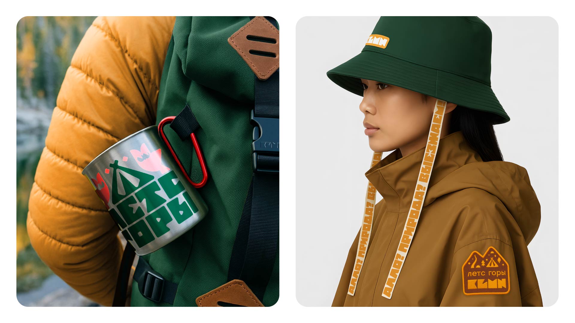 Название бренда — это общепринятое среди походников сокращение, или первые буквы слов "кружка, ложка, миска, нож", или KLMN. Фирменный стиль и tone of voice настроены на ламповую волну таких же романтиков-путешественников, как и его создатели. Характер бренда живой, открытый, ироничный, весёлый. На основе уникального логотипа был создан акцидентный шрифт KLMN Sans, который отлично располагается как на мерче с упаковкой, так и на навигации в ритейле.